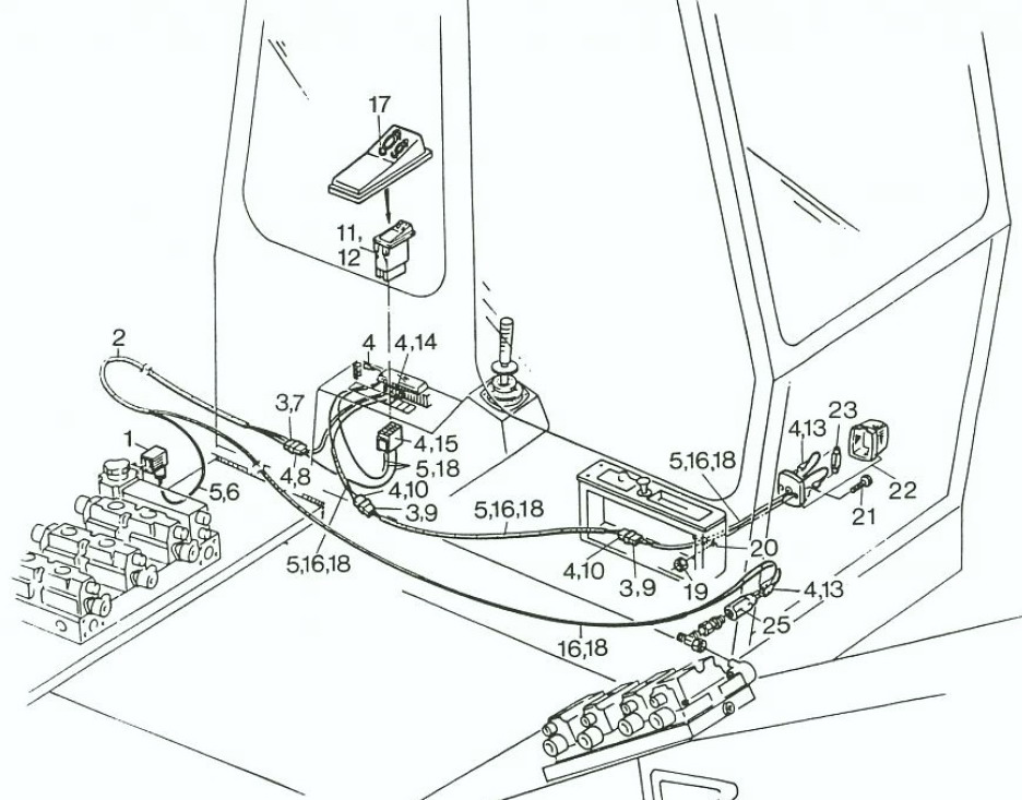 Nun zu meiner Annahme: kann es vielleicht sein, dass der Schalter, der die rote Lampe zum Leuchten bringt, die Pedalfunktion umschaltet? Also jetzt die Pedale, die für die Verstellung des hydraulischen Grundauslegers gedacht sind. Denn bei einigen Modellen kann man die Pedale ja auch zum Fahren nutzen...