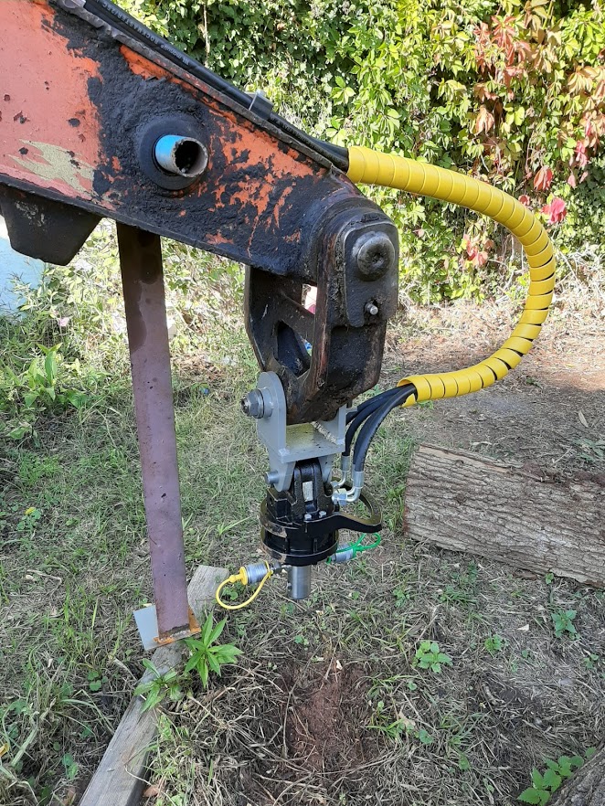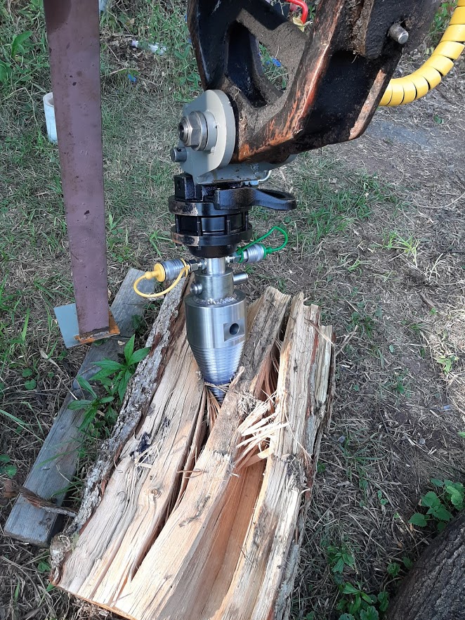 habe mal die ersten Versuche mit einem Spaltkegel (130mm Durchmesser) am Rotator gemacht. Hat prinzipiell funktioniert ist aber nicht besonders schnell. Der Rotator macht nur 50 - 60 1/min und aufgrund der drei Gelenke ist auch keine vernünftige Führung möglich. Werde mal das mittlere Gelenk blockieren. Ein Schutz für die Schnellkupplungen muss auch noch angebracht werden. Leider war nicht genug Platz die Muffe direkt einzuschrauben. Vielleicht klappt es anstatt der Muffe einen Stecker direkt einzuschrauben.