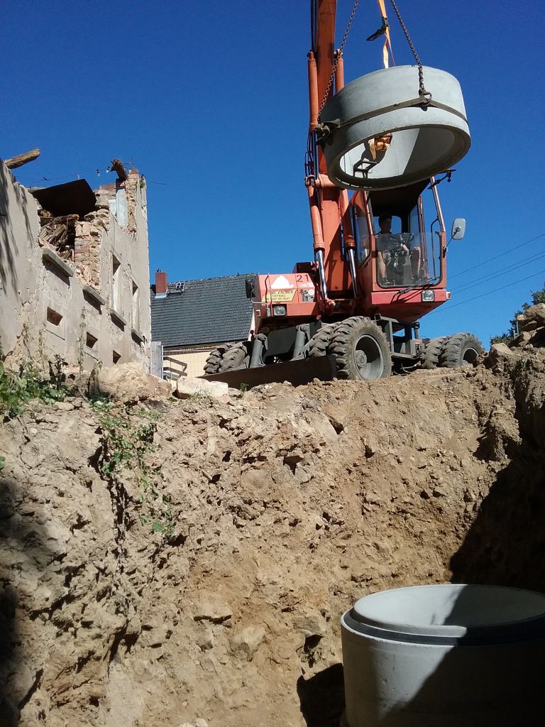 Das ausbetonierte Grundelement wiegt 1,6 to. Noch ein wenig Arm ausstrecken und die Hubkraft - kommt noch lange nicht an die Grenze. Aber mein rostiger Rumäne und jeder andere Minibagger wäre kollabiert.