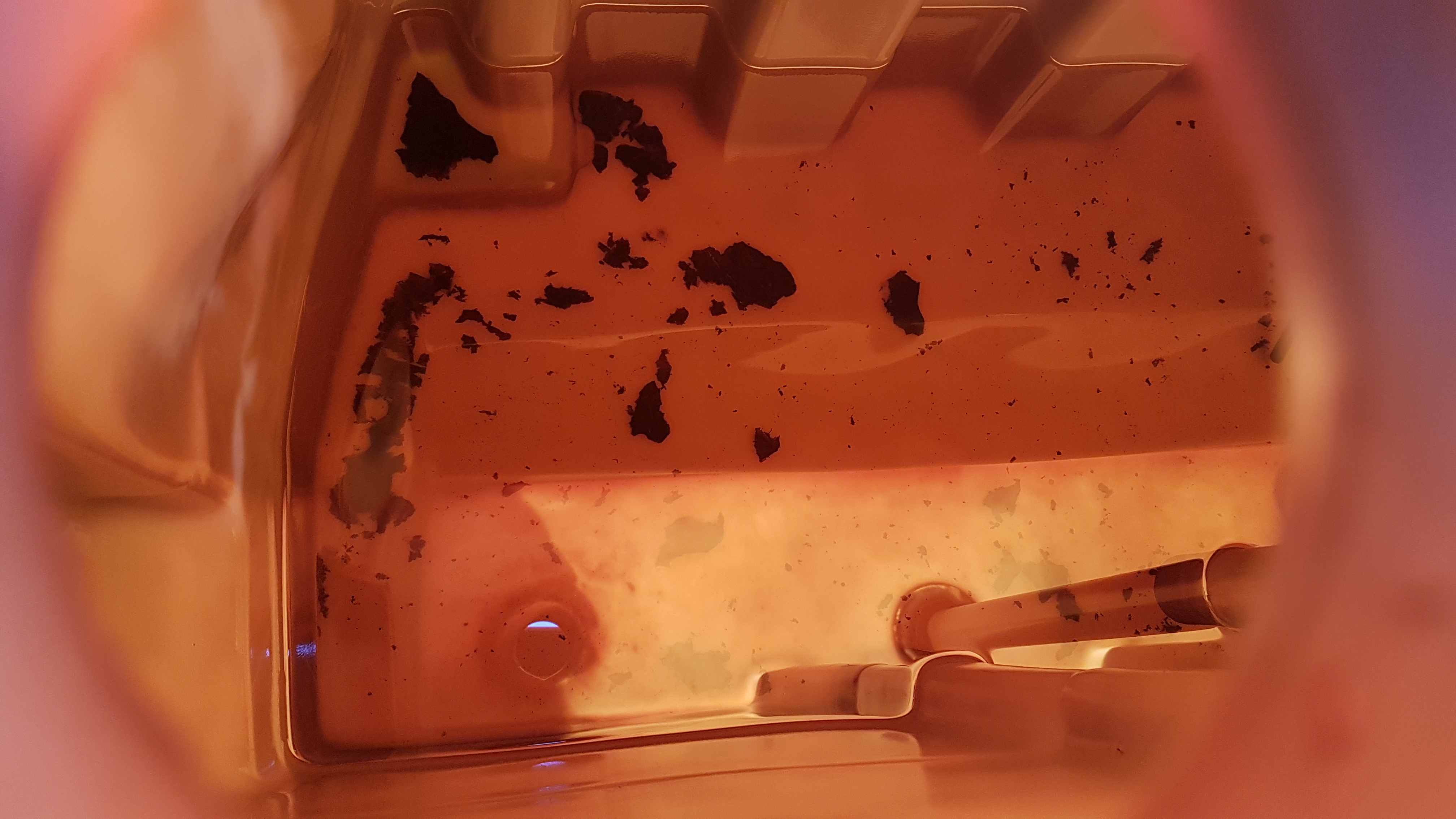 Allerdings bekam ich die klebrige Masse mit dem Hochdruckreiniger nicht raus. Nicht die Bohne. Ich hab alles durch die Öffnung für die Tankanzeige mit einer Messingleiste rausgekratzt, die man nimmt, um Teppiche Stoß auf Stoß zusammenzufügen. Dann gespült, gespült, gespült. Jetzt sind noch ein paar Tropfen Wasser drin. Die nehme ich in Kauf. Und regelmäßiger Grotamar-Einsatz wird mich davor schützen, von dem mit Biodiesel gepanschten Kraftstoff nicht mehr überrascht zu werden.