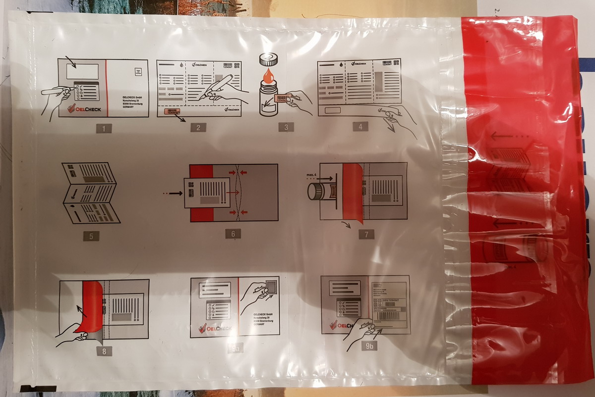 Nach ein paar Tagen kommt dann ein kleines Päckchen mit dem Set. In jenem Set befindet sich unter anderem ein Probenfläschchen, welches Ihr mit Eurem Öl befüllen und in den beigefügten Plastik-Rückumschlag (Tütchen) stecken müsst. Dann müsst Ihr den "Probenbegleitschein" ausfüllen und ebenfalls in den Umschlag stecken. Jetzt noch das beigefügte UPS Rücksendeticket drauf und dann das Tütchen zur nächsten UPS-Annahmestelle bringen (in meinem Fall 15km entfernt) oder abholen lassen. Beim Ausfüllen des Abholauftrages nicht vergessen, die Tracking-Nr. einzugeben, sonst zahlt Ihr 3€ für die Abholung! UPS nennt die Tracking-Nr. "Kontrollnummer". Weiß der Teufel warum... Wundert Euch also nicht wenn Ihr Kontrollnummer nicht findet. Es ist die Tracking-Nr.! Das Abholen funktionierte zwar, aber nicht gut. Man wird gefragt, von wann bis wann das Paket abgeholt werden kann. Ich schrieb "von 12 bis 0 Uhr", gekommen sind die um 10 Uhr. Zufällig war jemand im Haus, sonst wäre es nichts geworden. Schon die Lieferung war ein Witz, wenn's nicht so traurig wäre: "Wir liefern heute!" - "Heute nicht geschafft, kommen morgen." - "Heute nicht geschafft, kommen morgen." usw. Ich persönlich halte nichts von UPS, GLS und Hermes und kaufe in der Regel auch nur bei Anbietern, die mit DHL verschicken.