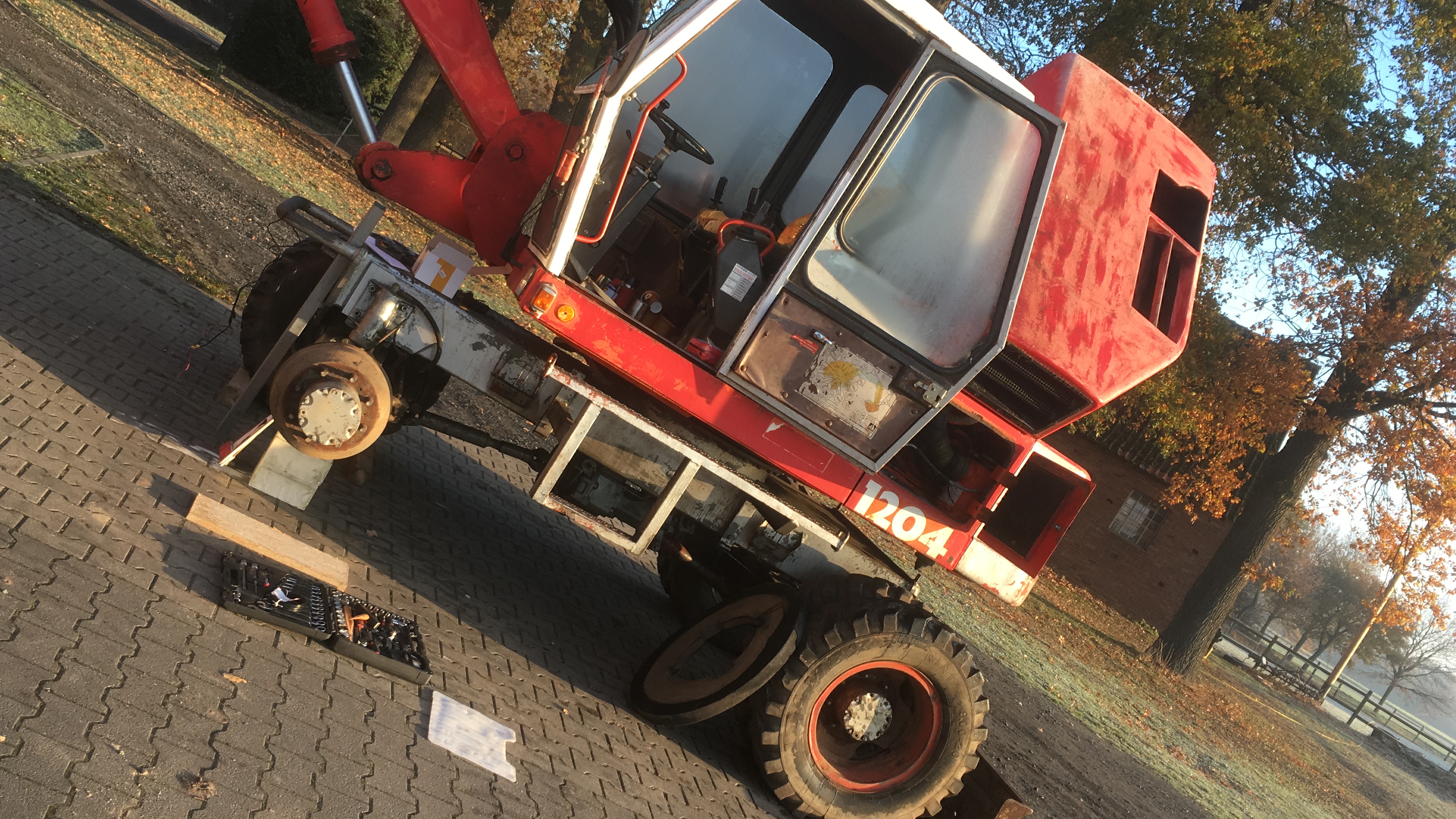 Gekauft letztes Jahr im November, mit dabei eine starre 2m Grabenkelle und ein 80er Tiefenlöffel. Nach Feierabend hab ich den 1204 dann mit viieeel mut 15km auf Achse überführt und bin bis auf einen kaputten reifen gut angekommen. Also sofort begonnen 2 alte Räder 9.00-20 gegen neue BKT's zu tauschen.