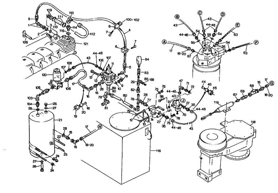 Du hast beim Schwenkwerk und bei der Handbremse jeweils einen Federspeicherzylinder verbaut, d.h. wenn der Luftdruck unter einen bestimmten Wert ist, drückt eine Feder den Zylinder nach außen und blockiert Schwenkwerk und Handbremse am Getriebeausgang.