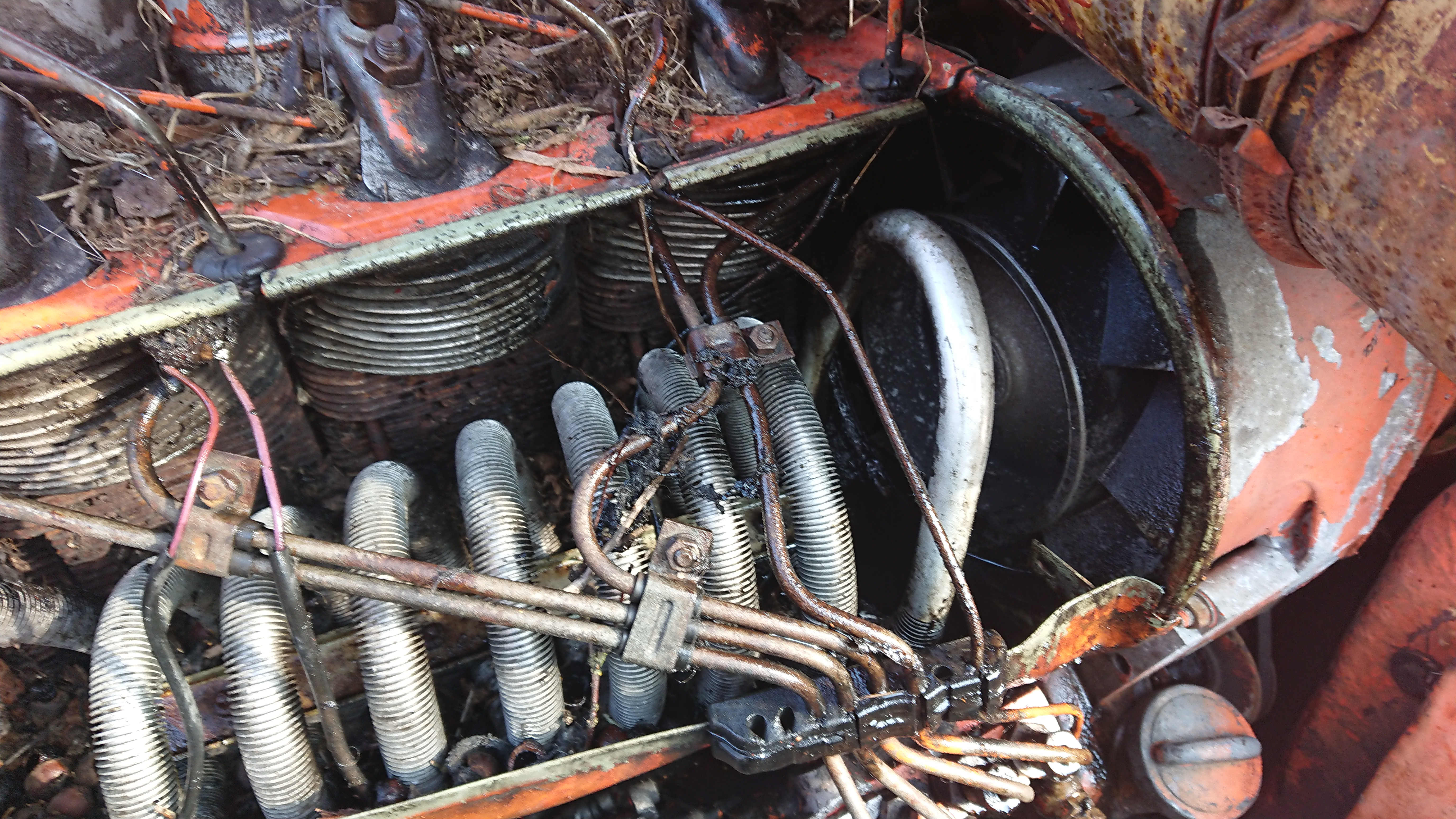 Ein Problemchen habe ich dann auch gleich, der Motor drückt Öl heraus und zwar im Bereich der Ölkühlerschlange. hinten zum Lüfterrad hin.