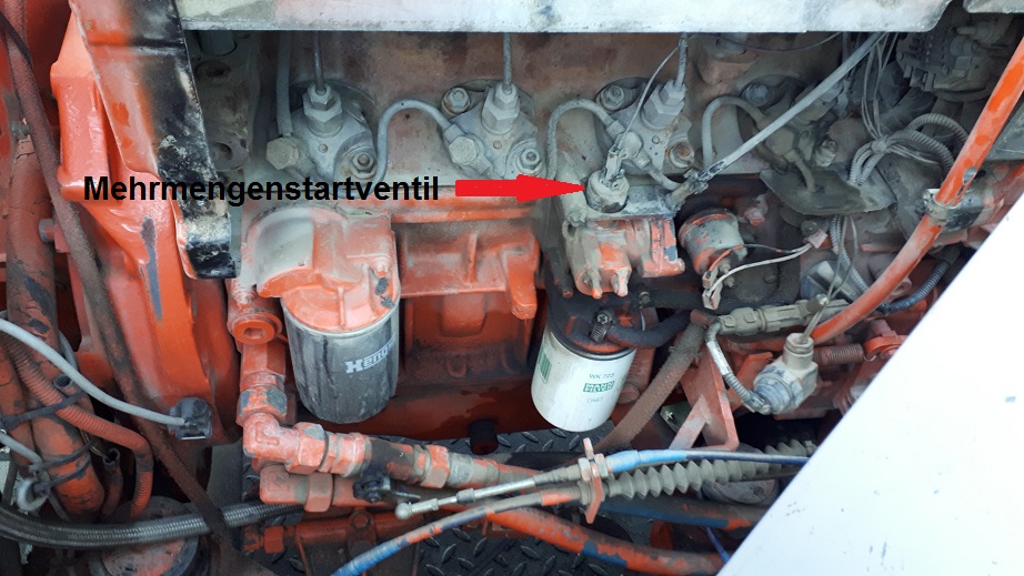 Nach dem ich mit meinem Latein am Ende war, habe ich mir zum Motor ein Werkstatthandbuch besorgt. Darin konnte ich ein Kaltstartventil ausfindig machen, Deutz nennt es Mehrmengenstartventil. Dieses Magnetventil sitzt am Motorblock oberhalb vom Kraftstofffiltergehäuse bei der LDA-Reglung. Beim Starten wird das Ventil über Klemme 50 angesteuert und gibt dann über die Regelstange der Pumpendüsenelemente mehr Kraftstoff.