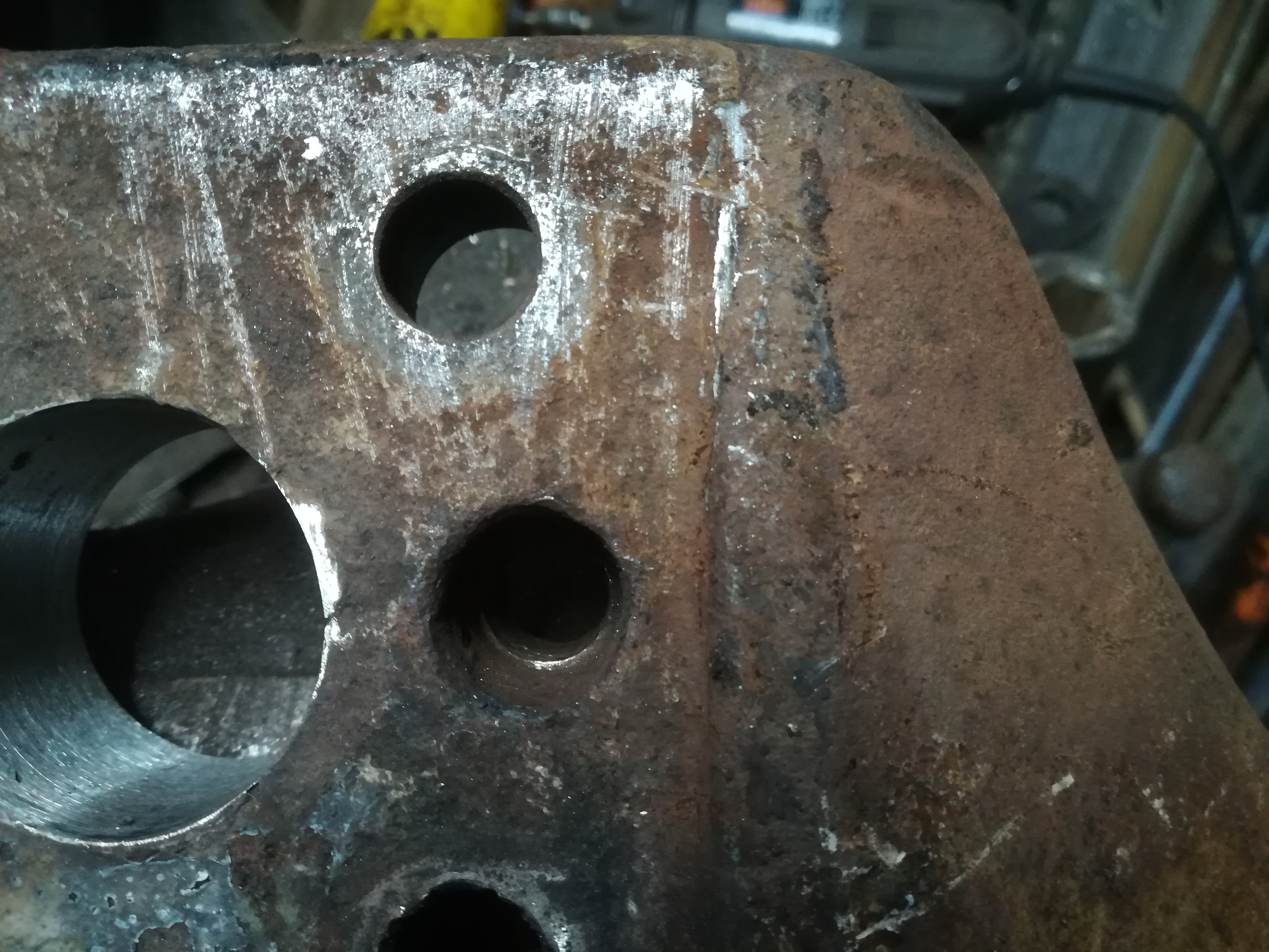 Bei meinem wurde da nach einer Reparatur voll verschweisst. Zerlegt sieht das dann so aus Bolzenbohrung auf Übermaß gespindelt