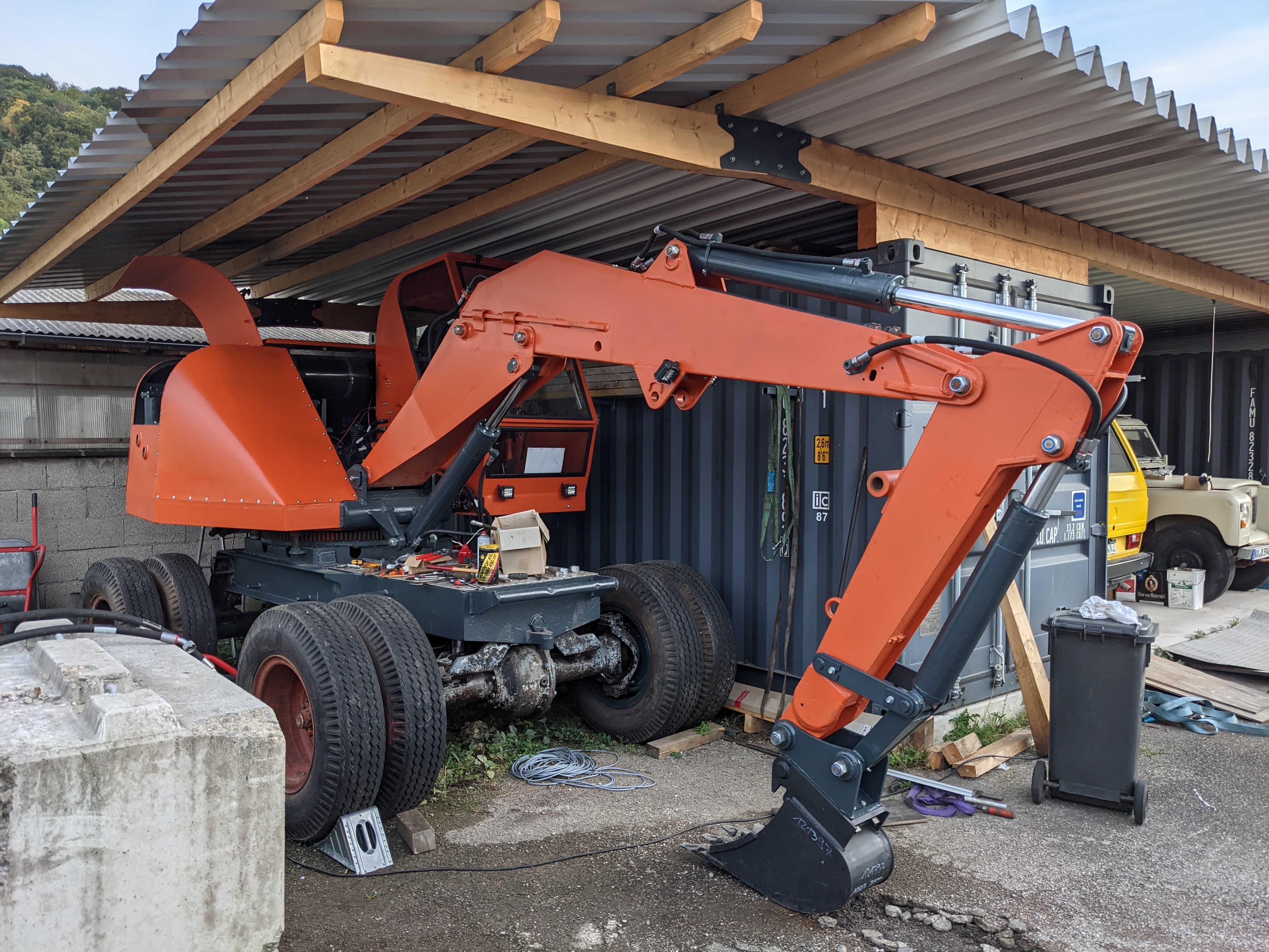 Ist nicht perfekt gespachtelt, ein Karosseriebauer würde sicher die Hände über dem Kopf zusammen schlagen, aber für einen Bagger passt das schon.