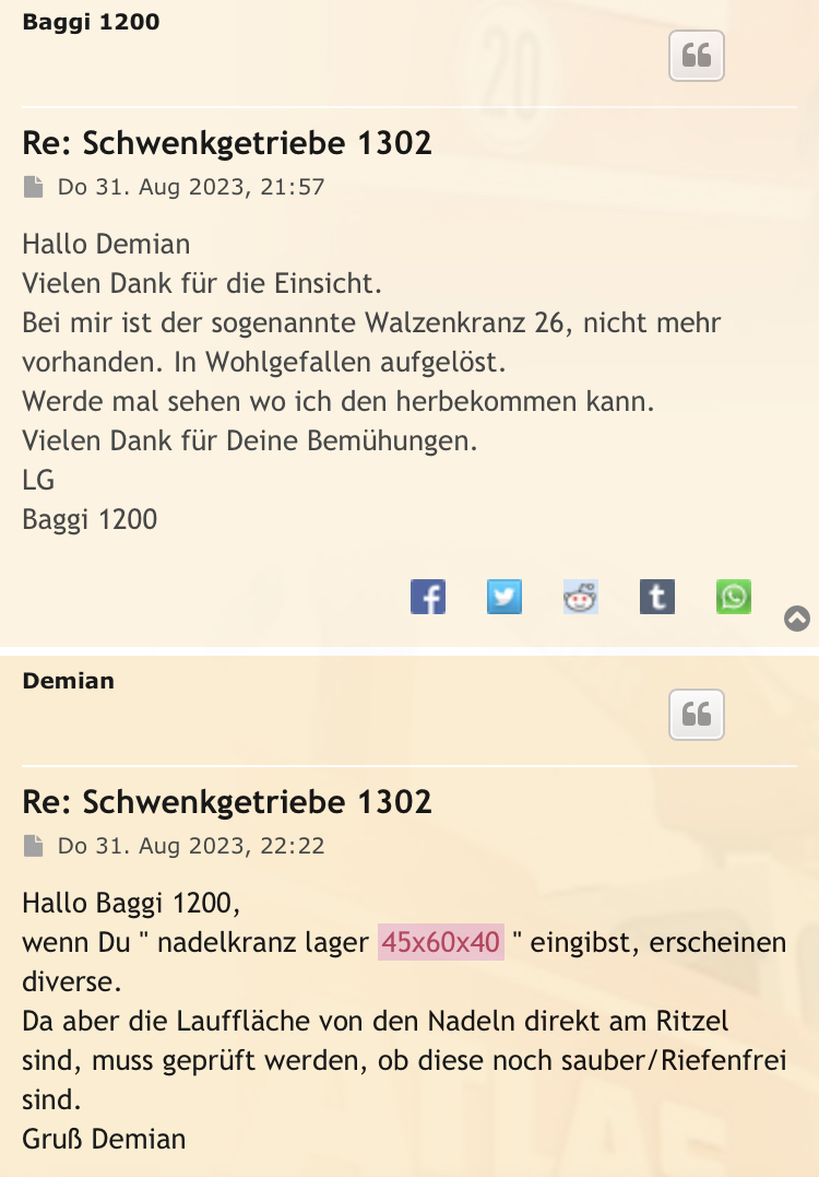 Das Nadellager ist bei mir auch defekt, ich habe heute schon nach einem neuen Lager gesucht. Auch die Suche mit dem Begriff „Nadelkranz Lager 45x60x40 „ bringt keinen Erfolg.