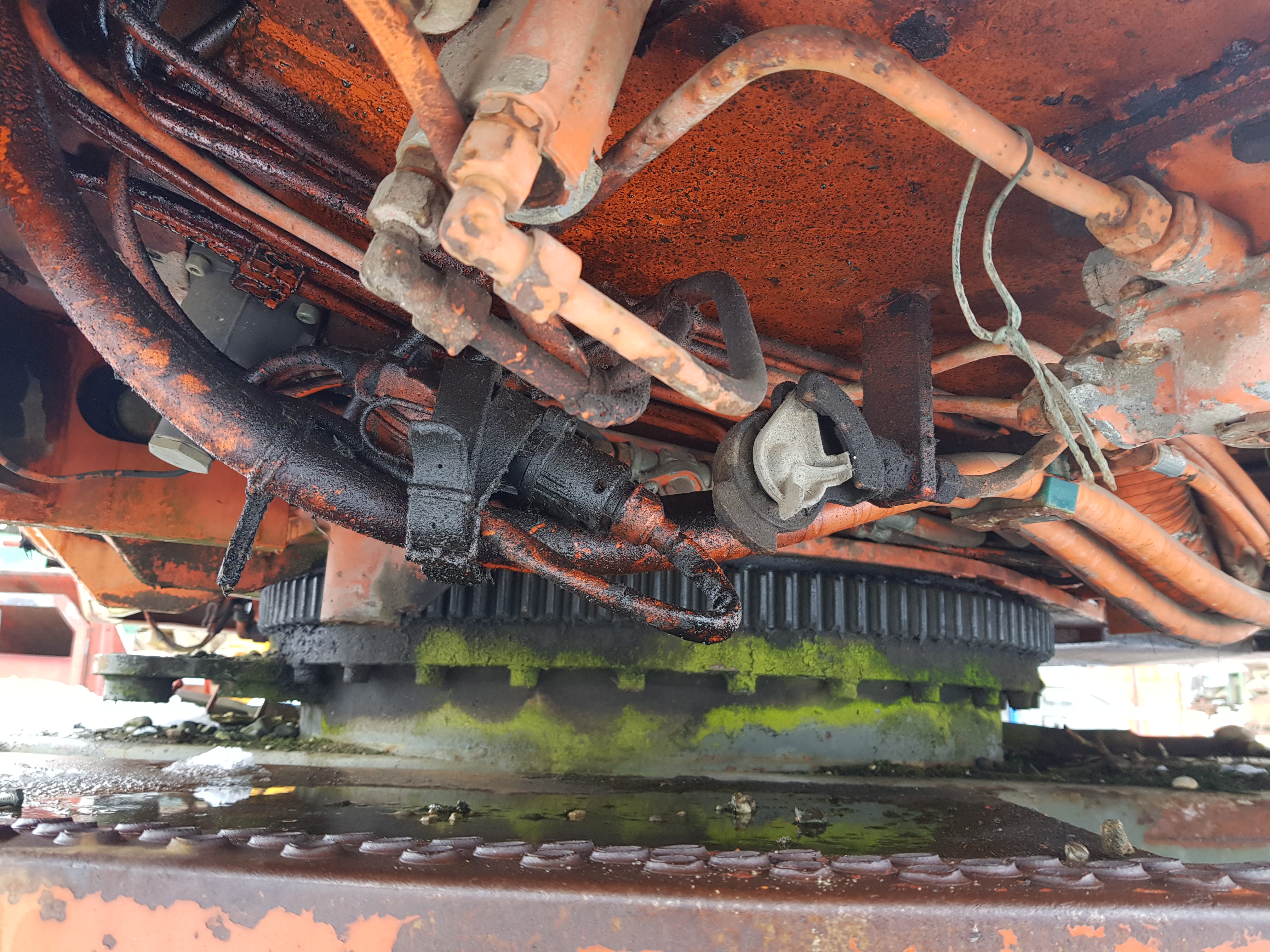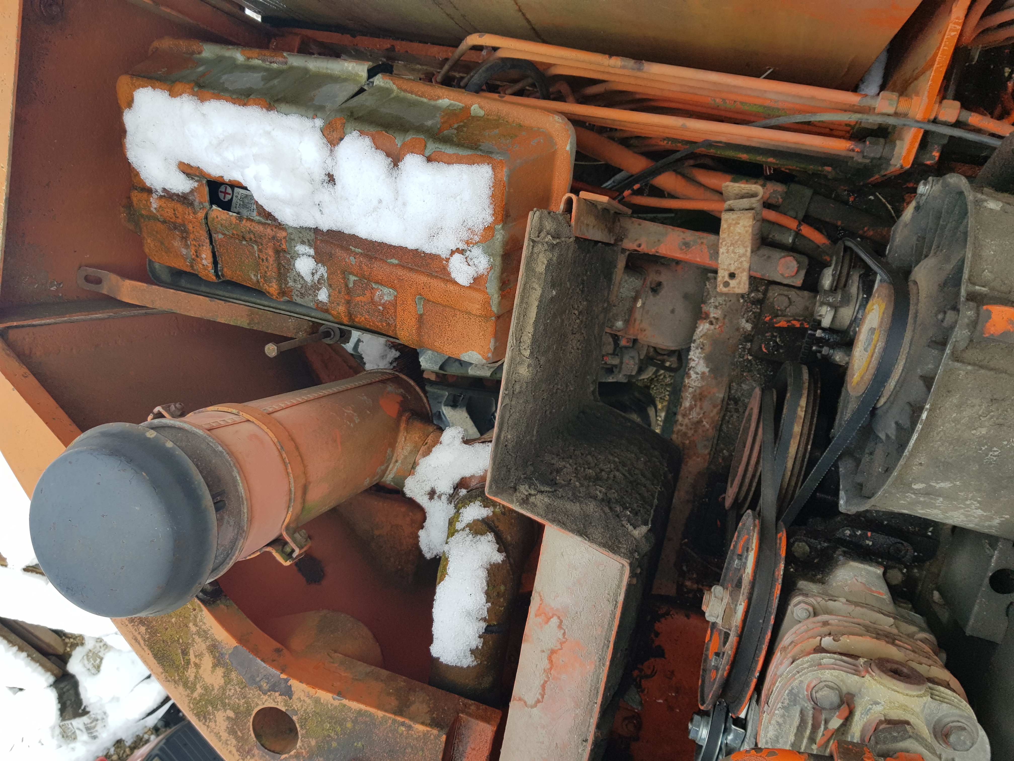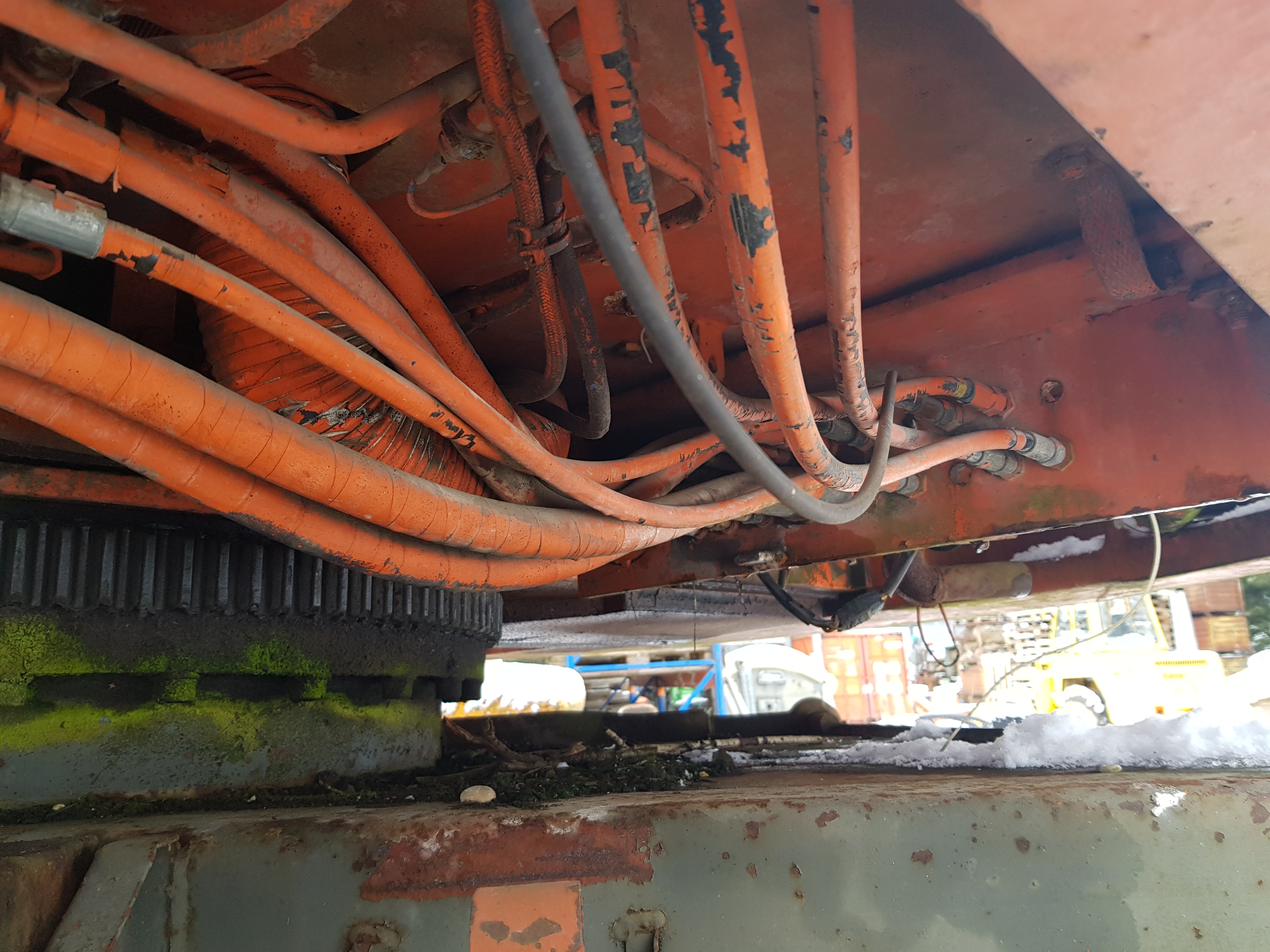 Der Besitzer meinte das habe er so schlecht nicht in Erinnerung und entschuldigte sich. Sonst erzählte er viel und telefonierte noch wenn er etwas nicht wusste um sich zu erkundigen. Auch, dass er sich eher weniger Mühe gegeben hat den Bagger auf eine "Besichtigung" vorzubereiten (was mir sogar lieber ist, hier wird nichts versteckt!). Der 1202 lief lange in deren Betrieb, bekam vor Jahren mal einen neuen, identischen Motor und arbeitete hauptsächlich mit Zweischalengreifen. Hat wenig Spiel in den Gelenken und ist wie schon gesagt noch recht original. Anzeigen in der Kabine funktionieren, die Reifen sind Rissig aber Dicht und haben größtenteils noch mehr als genug Profil.