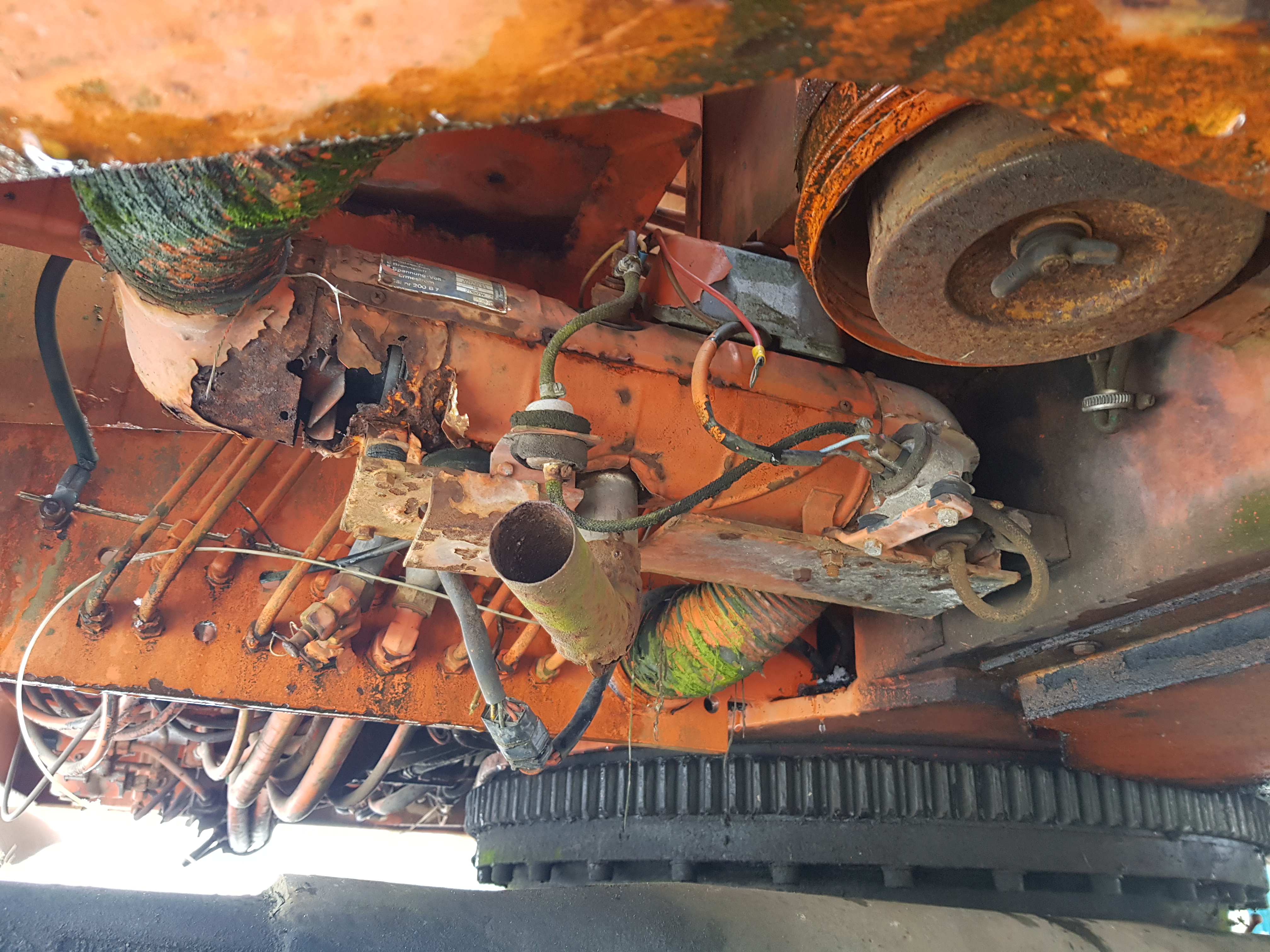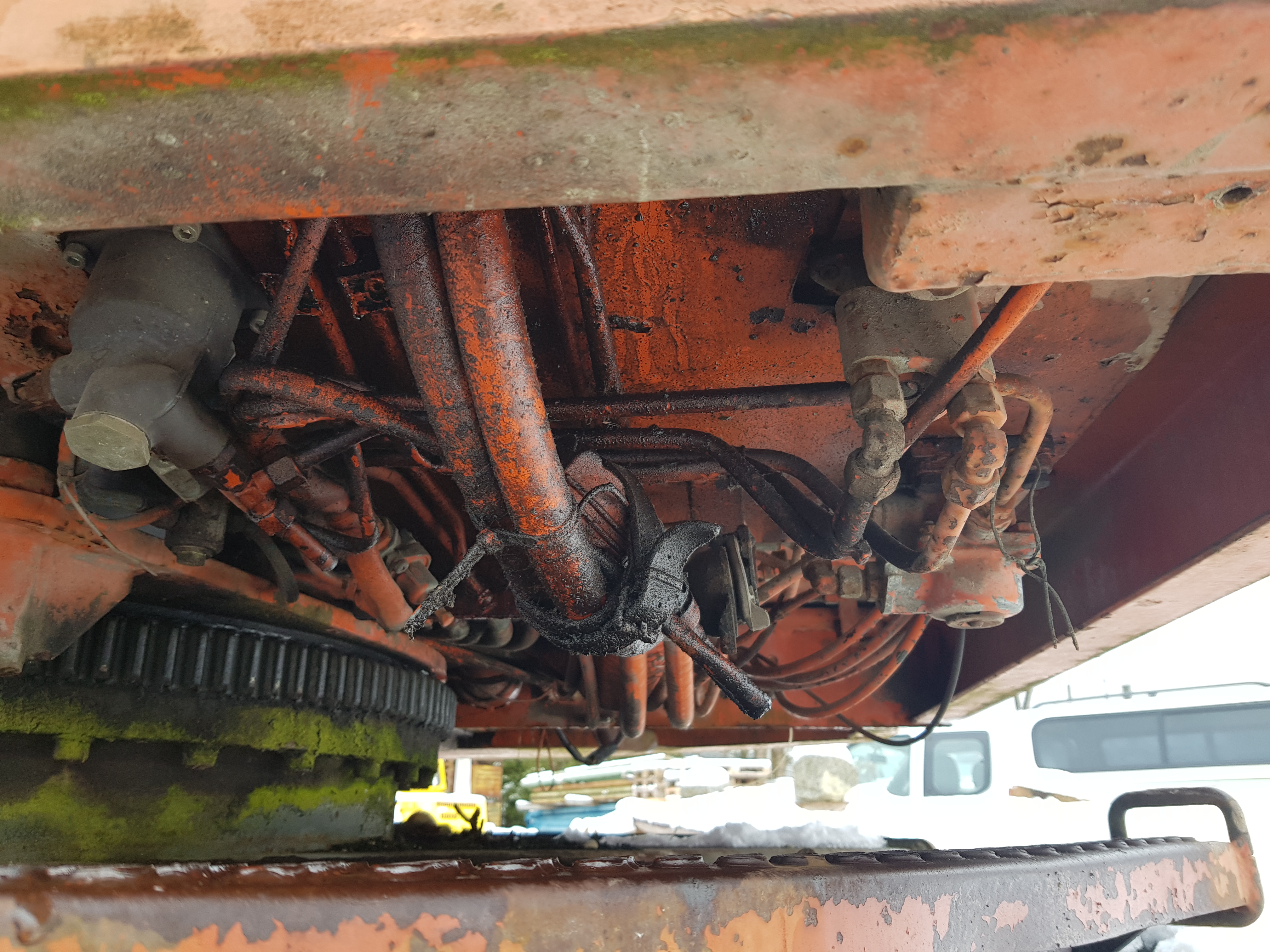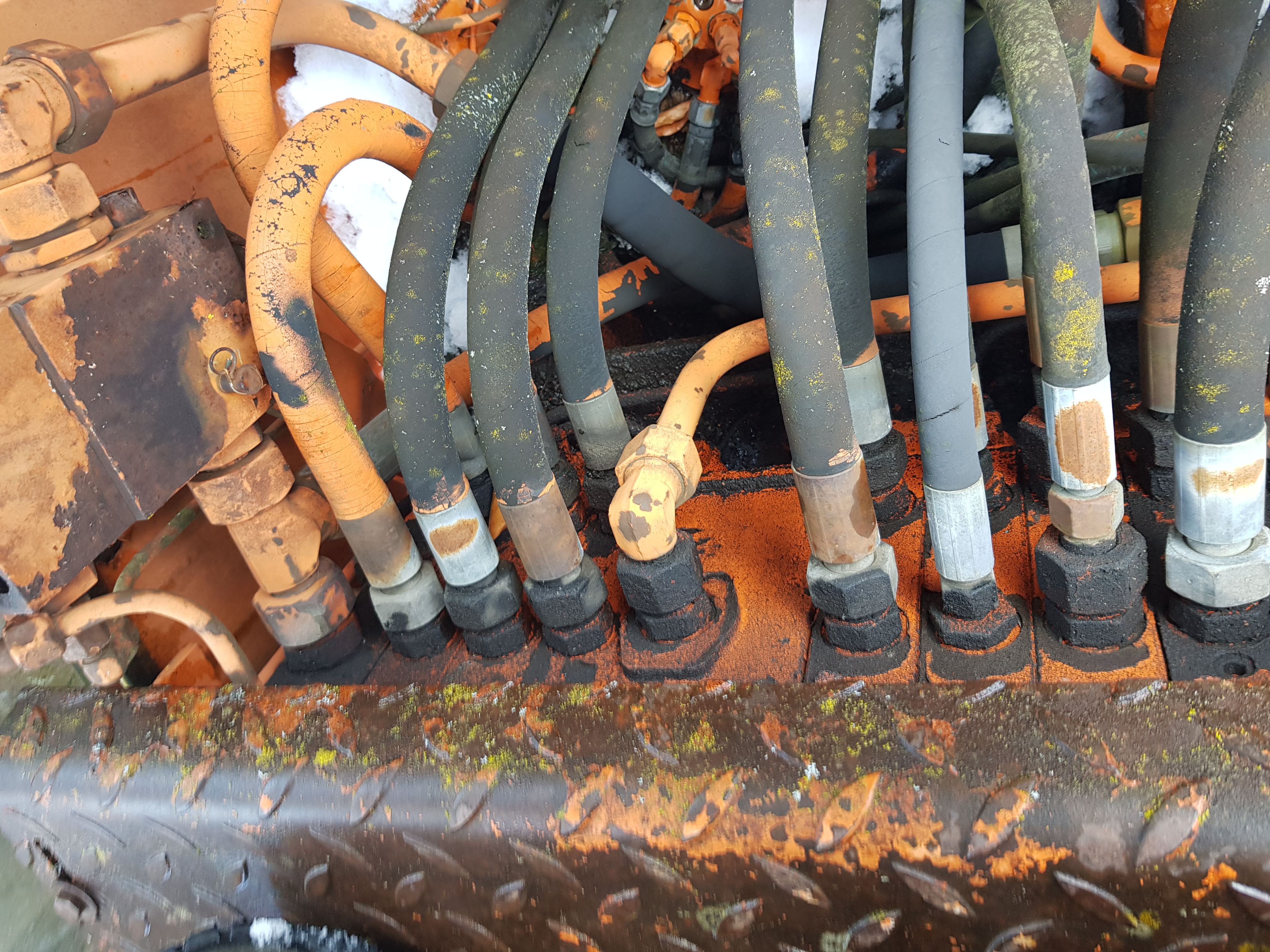 Der Besitzer meinte das habe er so schlecht nicht in Erinnerung und entschuldigte sich. Sonst erzählte er viel und telefonierte noch wenn er etwas nicht wusste um sich zu erkundigen. Auch, dass er sich eher weniger Mühe gegeben hat den Bagger auf eine "Besichtigung" vorzubereiten (was mir sogar lieber ist, hier wird nichts versteckt!). Der 1202 lief lange in deren Betrieb, bekam vor Jahren mal einen neuen, identischen Motor und arbeitete hauptsächlich mit Zweischalengreifen. Hat wenig Spiel in den Gelenken und ist wie schon gesagt noch recht original. Anzeigen in der Kabine funktionieren, die Reifen sind Rissig aber Dicht und haben größtenteils noch mehr als genug Profil.