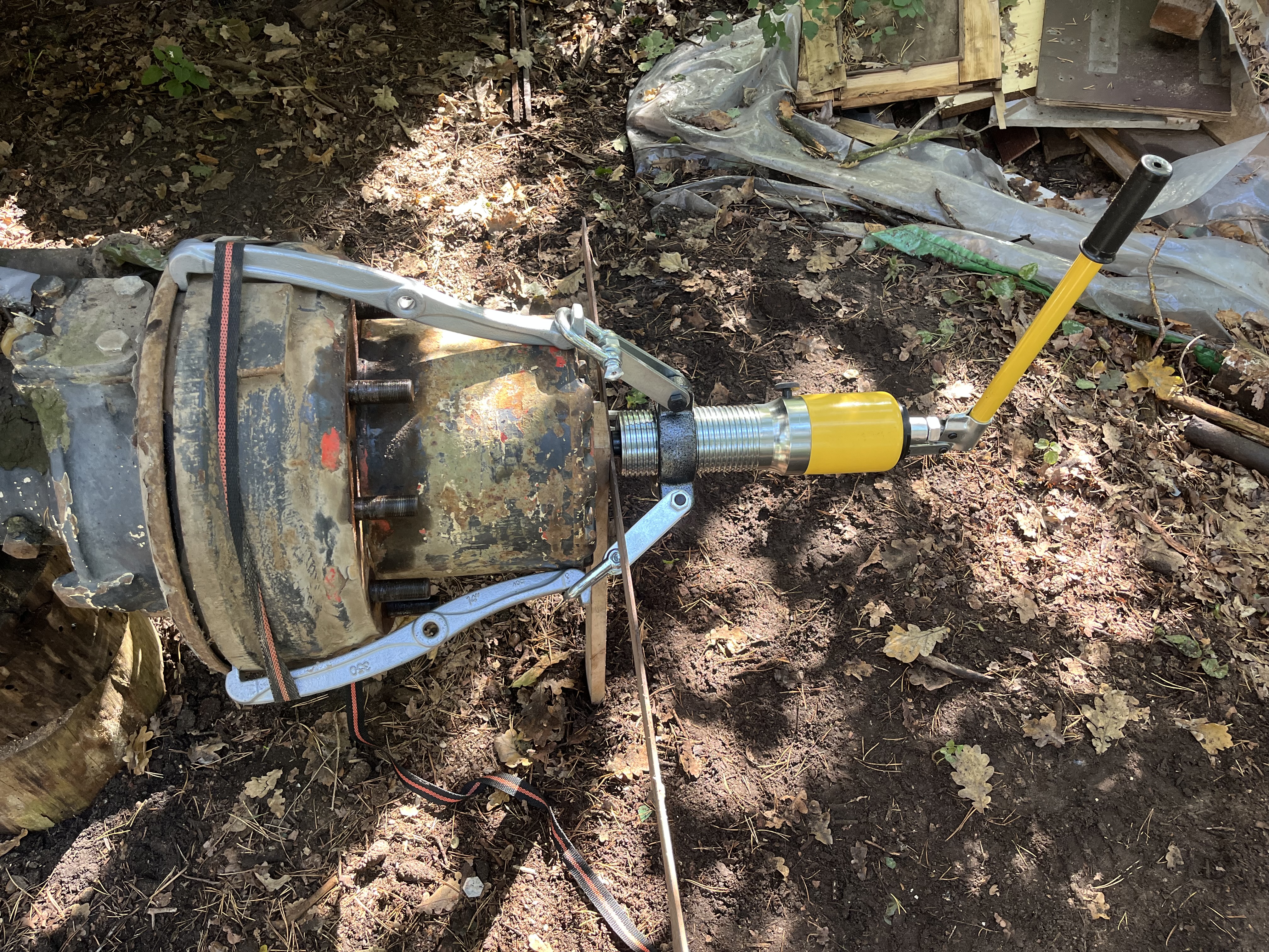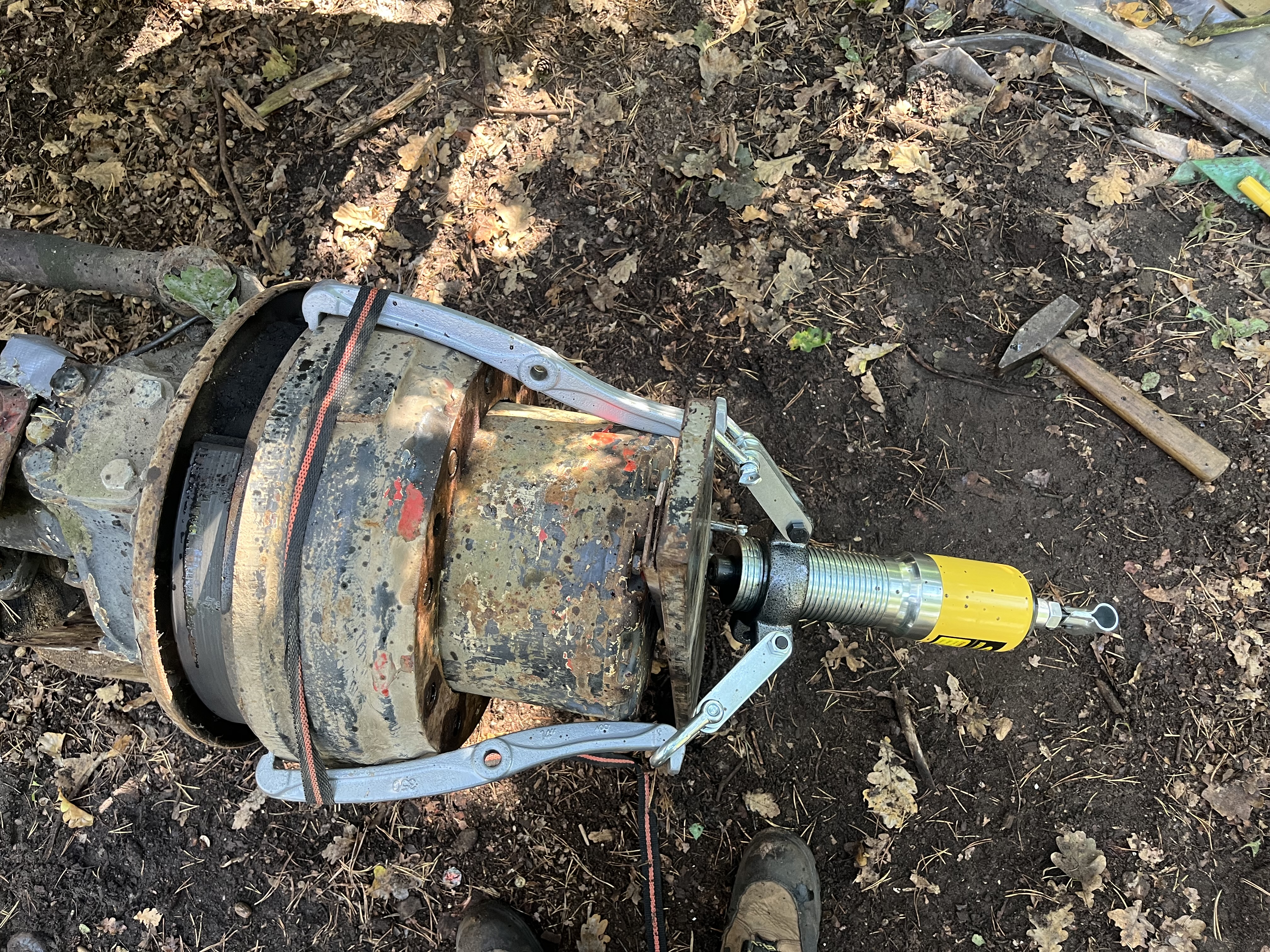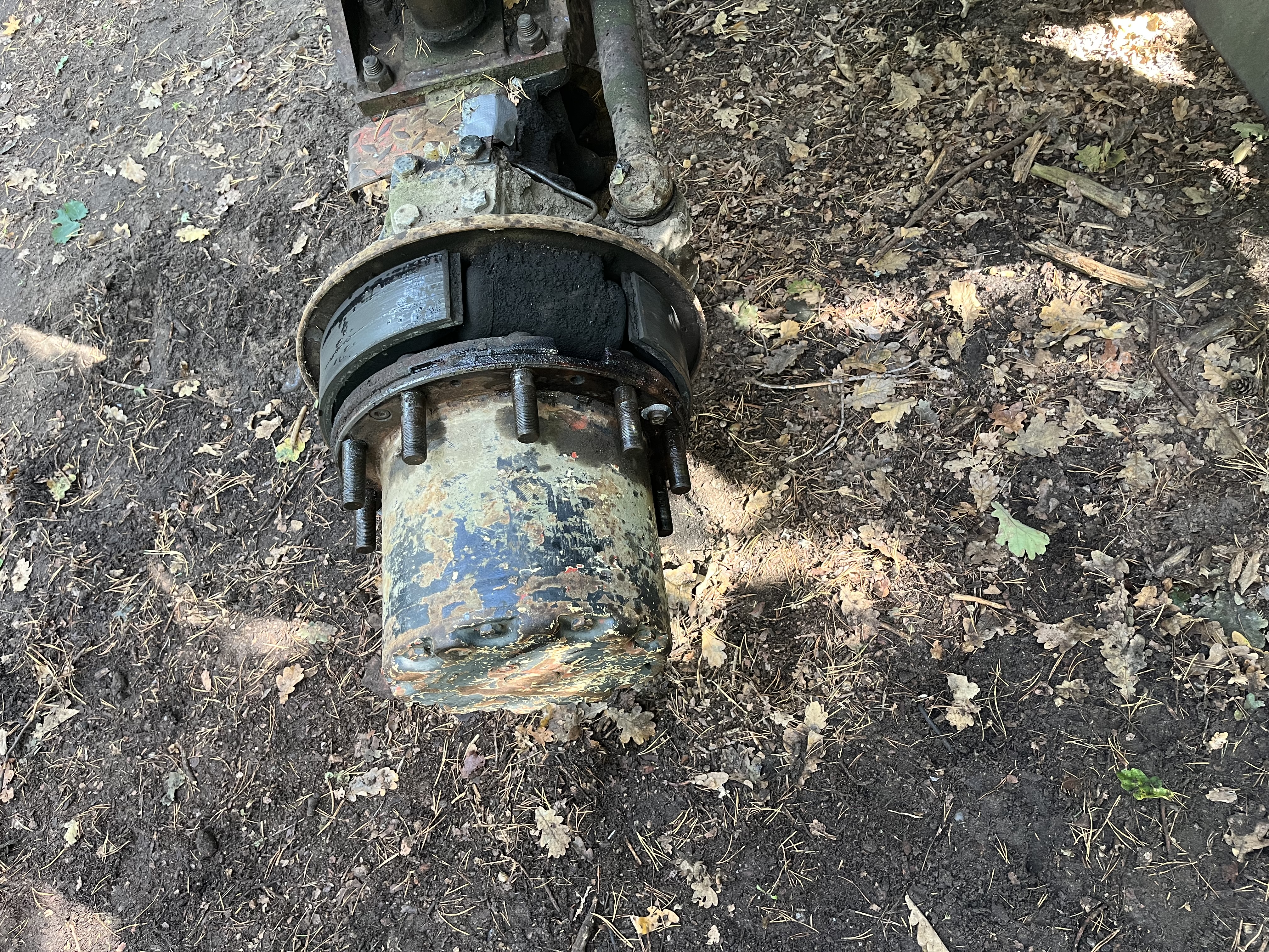 Die Bremstrommeln waren mit zwei Imbusschrauben fixiert. Nach dem Entfernen kam etwas Öl aus der Trommel und ich habe gelesen das diese Schrauben nur zum fixieren des Getr.Gehäuses an der Nabe sind. Also hab ich die wieder reingeschraubt und mit dem hydraulischem Abzieher kräftig gezogen mit dem Resultat, das ich kleine Kegel aus der Trommel gerissen habe. Also nix mit Durchgangsschraube, die müssen bei dieser Achse vor dem Abziehen raus. (dahinter sind dann zwei weitere die das Gehäuse auf der Nabe fixieren)