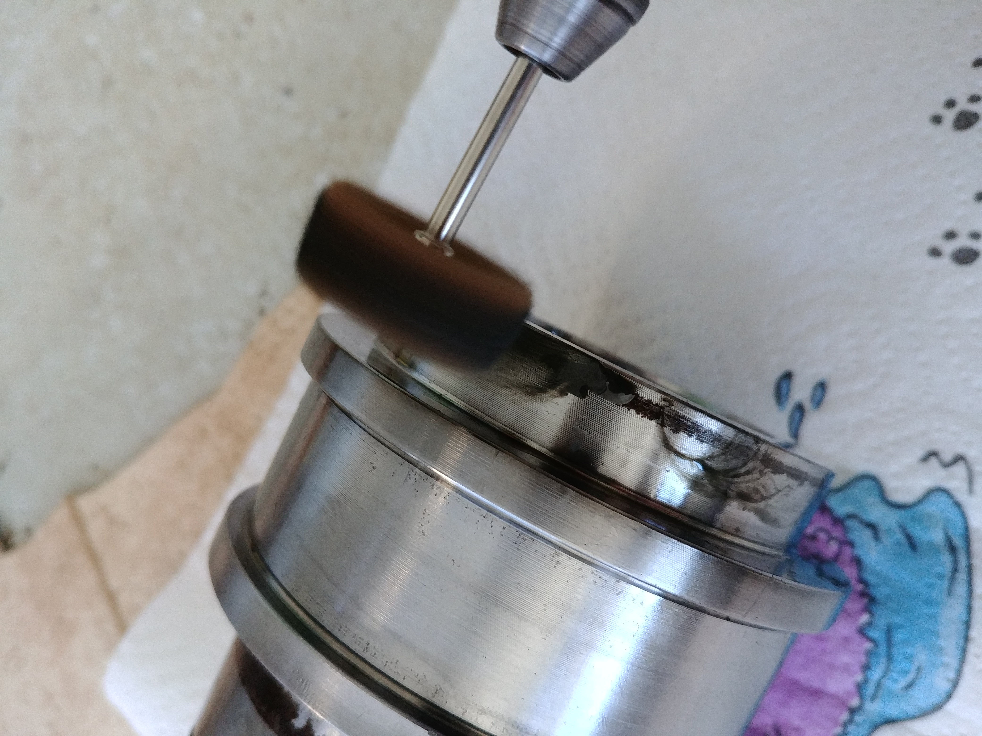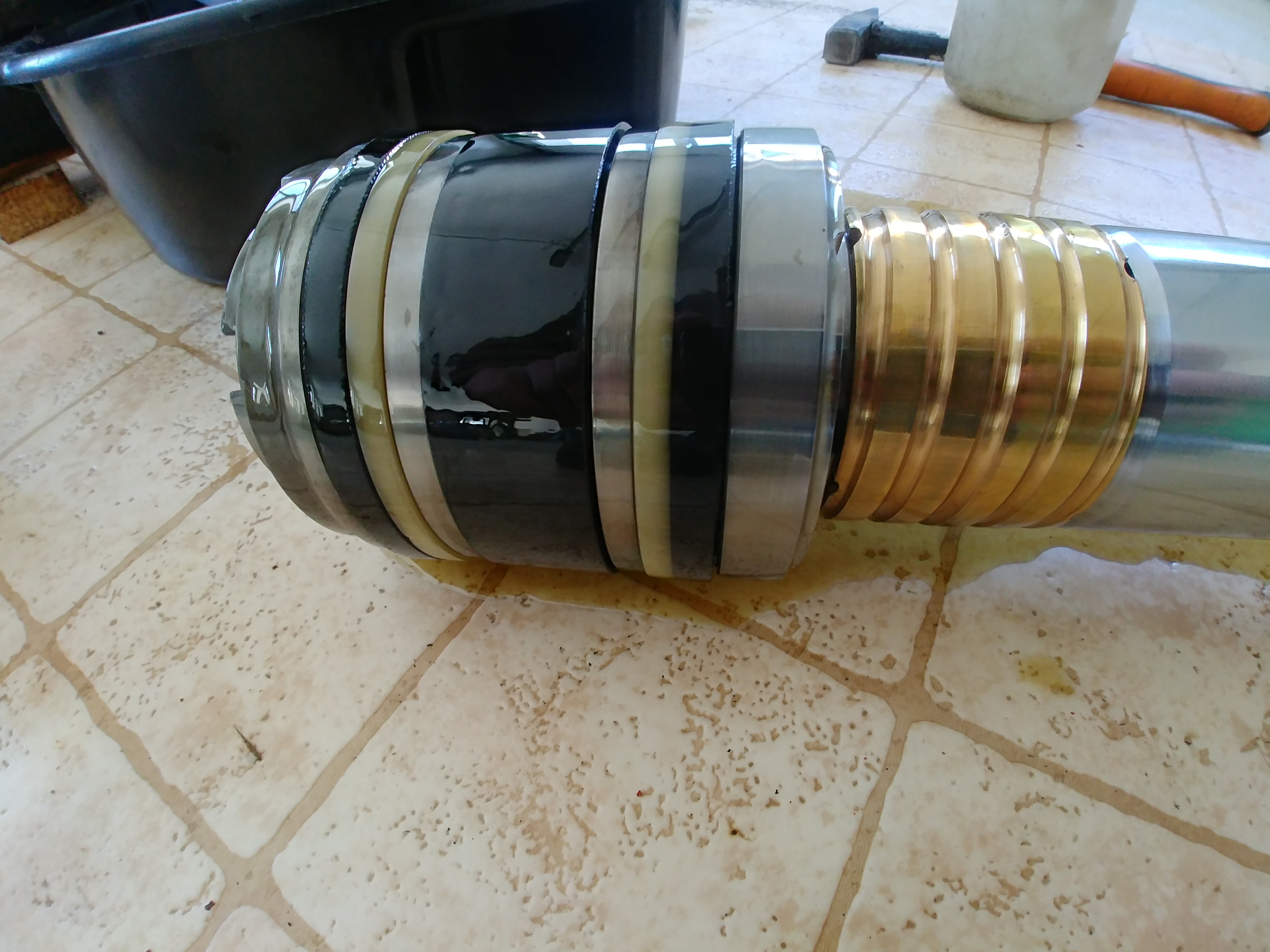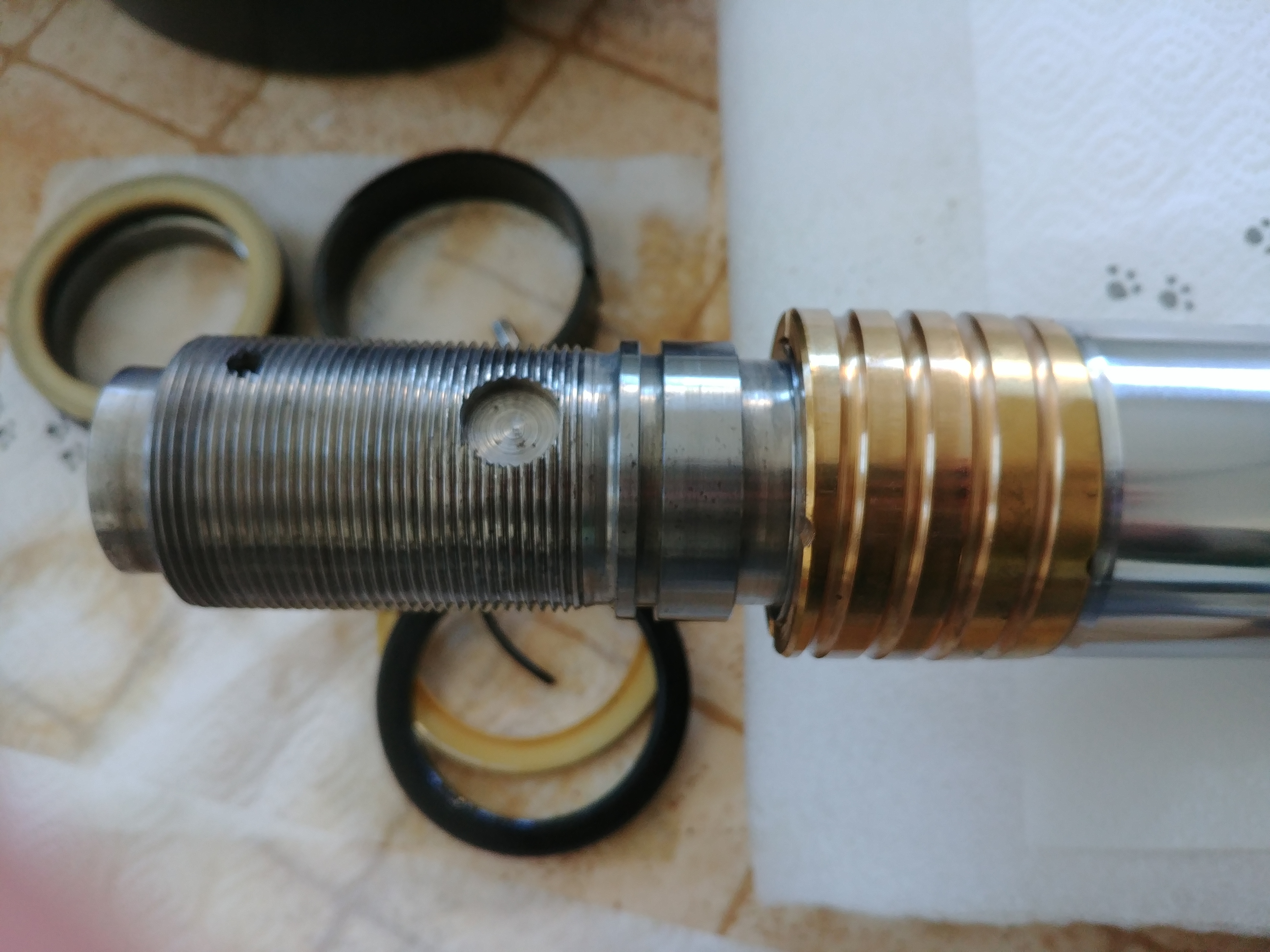 Nachdem ich alle Ringe ausgetauscht hatte und den Rost am Kolben (Dort, wo die schwarzen Dichtringe saßen, hat sich wohl trotz Ölbad Rost gebildet) vorsichtig mit dem Dremel entfernt hatte, gings mit dem Zusammenbau los. Da sich der Kolben recht leicht abschrauben ließ, bin ich davon ausgegangen, dass der sich auch wieder recht leicht aufschrauben lässt. Die 2 neuen POM Einlagen im Gewinde sollten das ganze zwar etwas erschweren, aber das sollte sich in Grenzen halten - dachte ich.