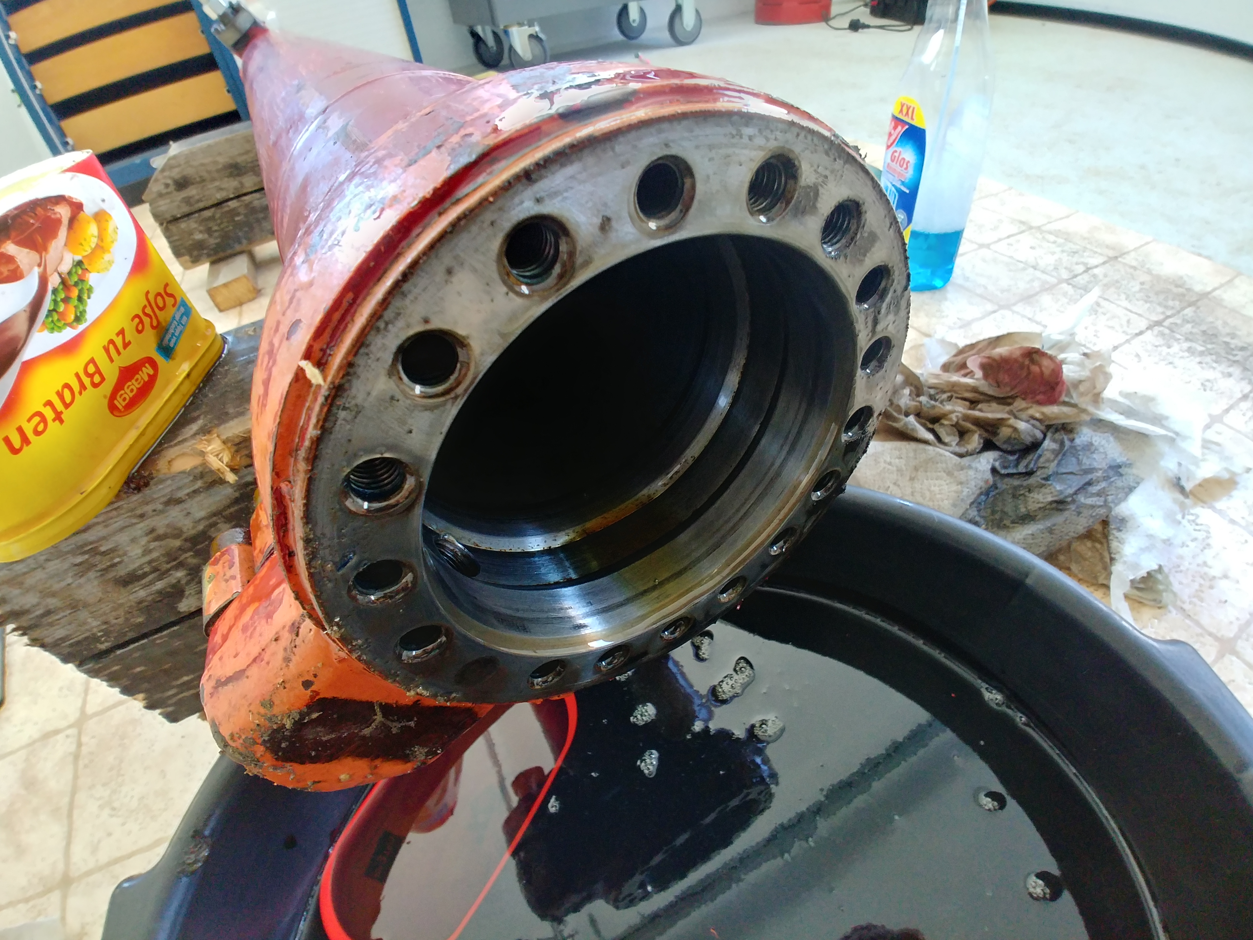 Damit sich der Kolben nicht wieder löst, ist dieser mit einem Sicherungsstift gesichert. Der Kolben muss also wieder exakt auf Position gebracht werden. Das Problem war, dass es mir genau um eine viertel Gewindeumdrehung gefehlt hat. Ohne einen Zweilochmutterndreher keine Chance. Nach einem Check, ob auch wirklich alles richtig montiert war, stand fest; das muss jetzt noch ein Stück weitergedreht werden. Mit einem Schraubstock und einem Helfer plus 1 Meter Hebel hat sich der Zylinderkolben dann doch noch erbarmt und ließ sich mit Ach und Krach auf Position bringen.