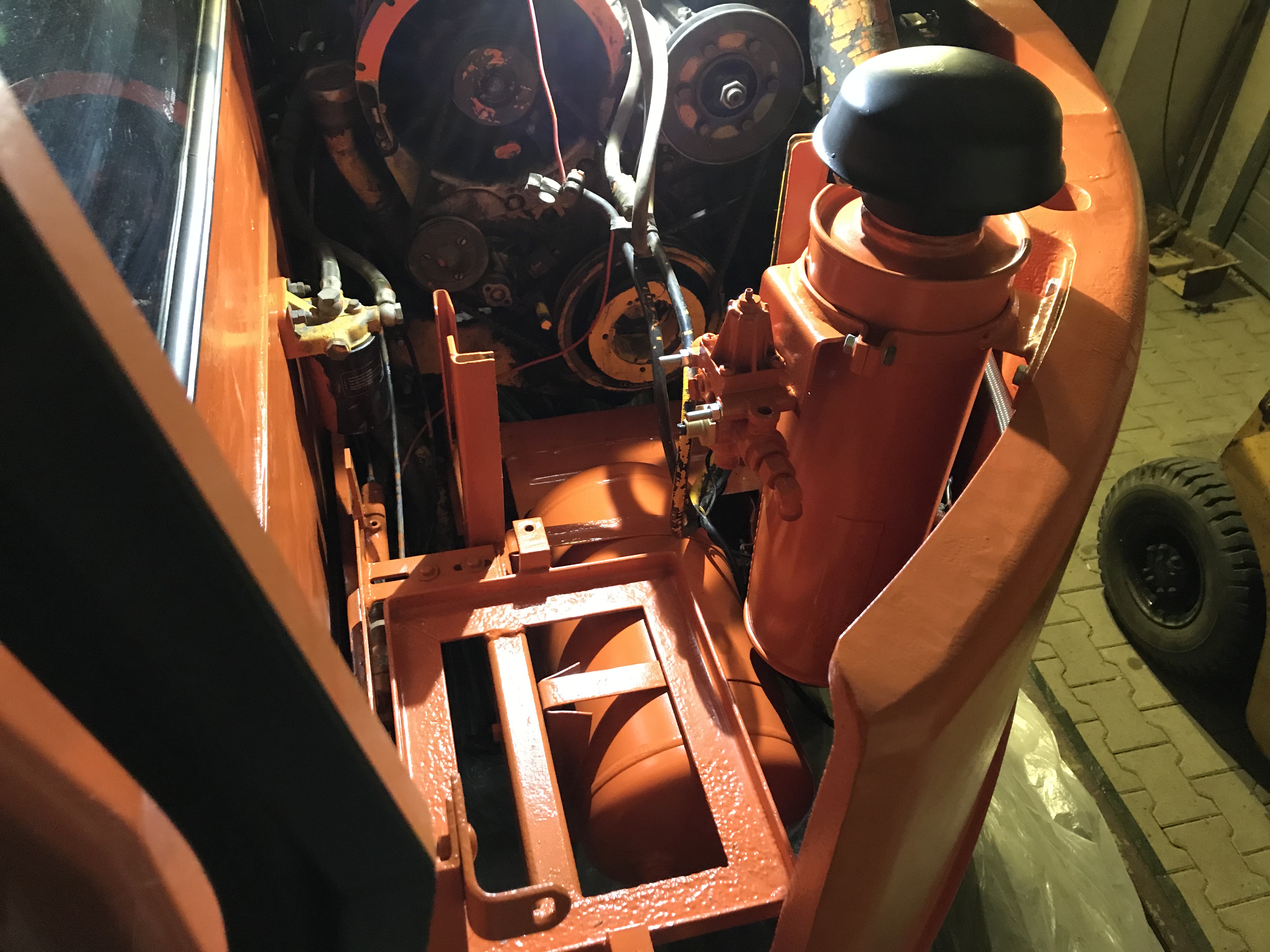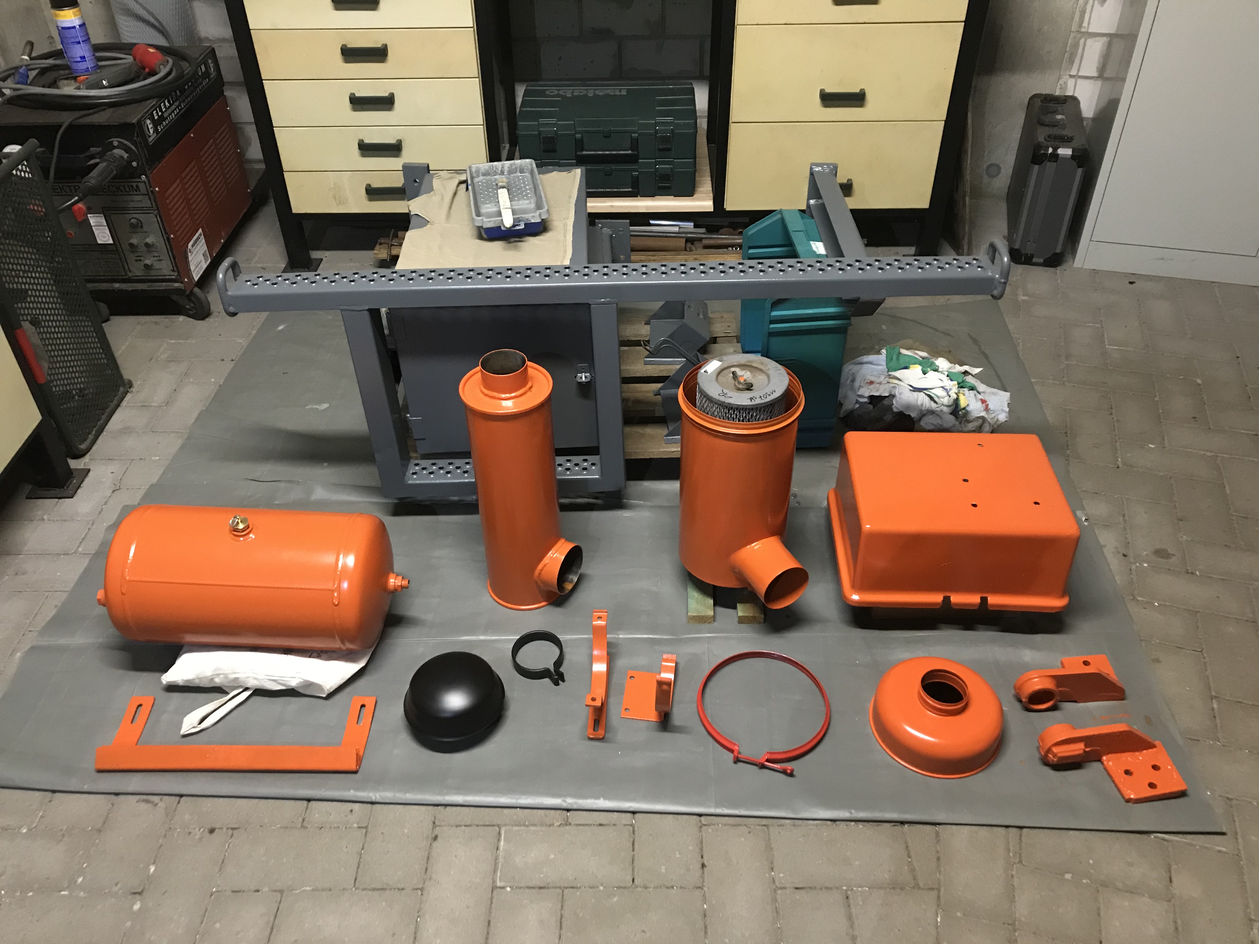 Der Oberwagen ist fast fertig, die Druckluftanlage & Luftfilteranage ist komplett überarbeitet. Das Schild ist runter und die ersten Teile vom Arm - jetzt gehts in kleinen Etappen weiter. Bolzen, Buchsen und Hydraulikschläuche ...