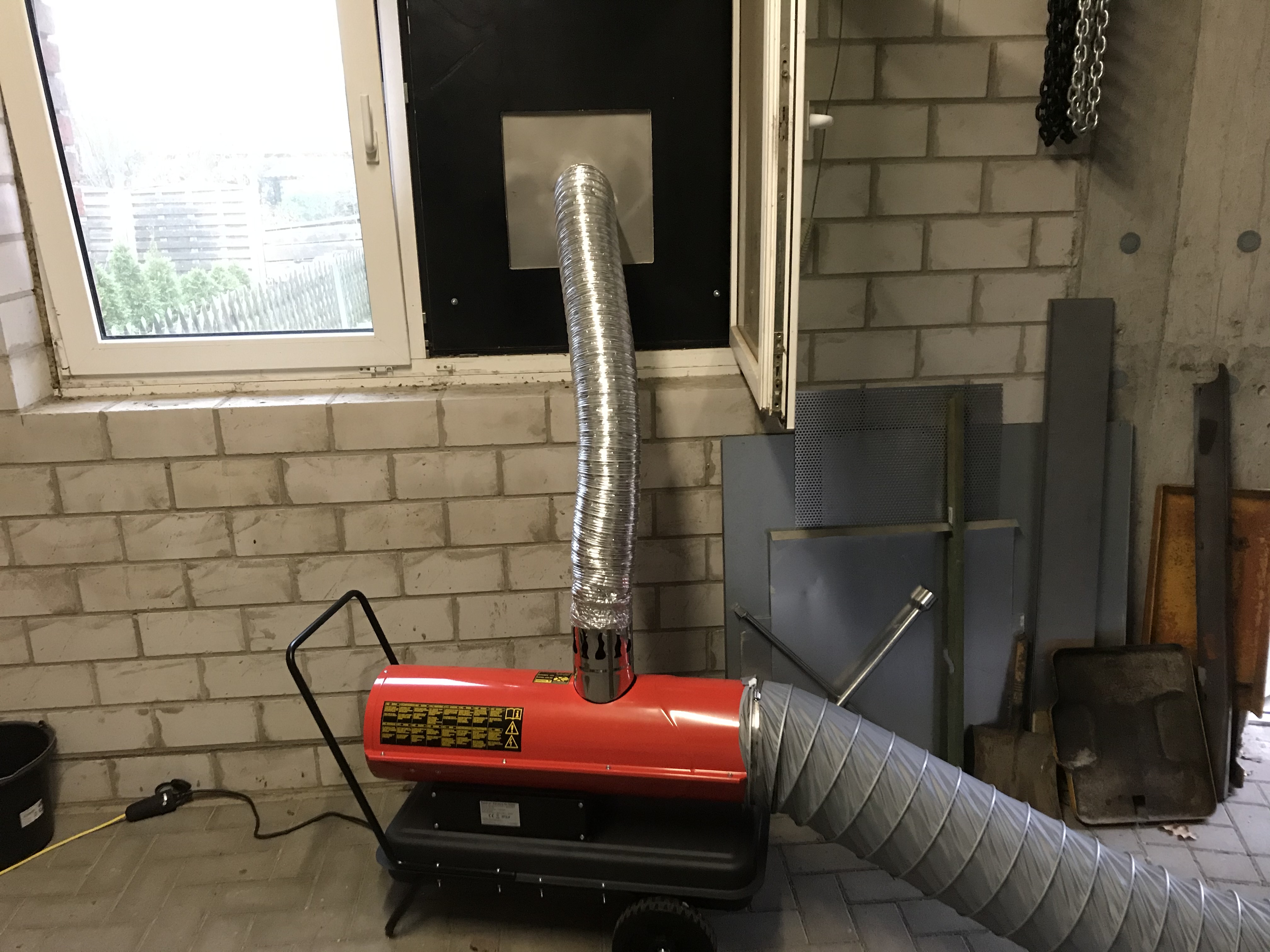 Vor den Feiertagen habe ich eine Heizung (20 kW - Diesel Kanonenofen - Indirekt) provisorisch in meine Halle eingebaut und die Elektroinstallation abgeschlossen, man will ja vernünftig arbeiten und auch lackieren können.