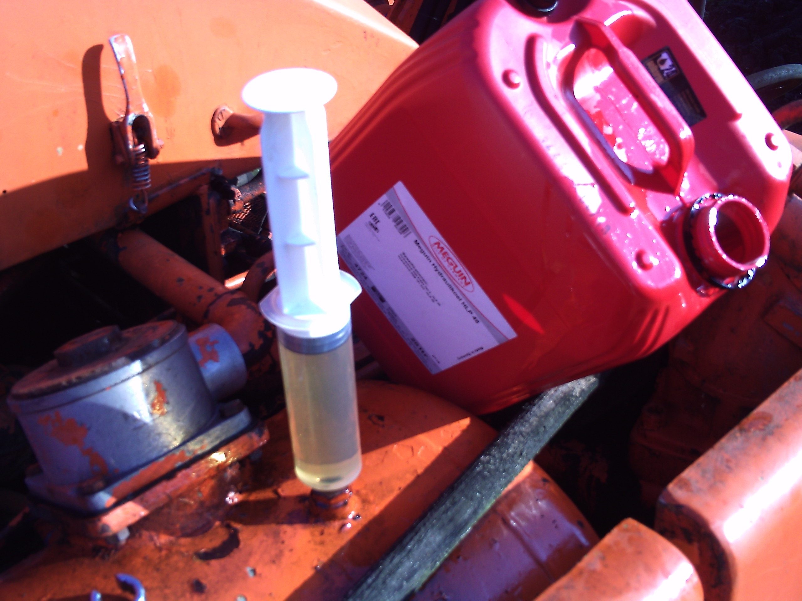 trichter für öl haben einen gewaltigebn nachteil - sie sammeln schmutz ein wie sau - die spritze bleibt von innen sauber und da das öl ja nicht über den filter eingefüllt wird, find ichs so besser.. geht übrigens recht fix.. 18l hab ich so aus dem kanister bekommen.. zeit geschätzt 10min bis ne viertelstunde.. was ich nur doof fand.. der ölstand ist jetzt auch erst knapp über dem unteren schauglas - klar der tank ist ja in dem bereich der schaugläser am grössten - glaub ich kann schonmal die nächsten 20l ordern.. der bagger muss ja zur zeit jeden tag ran und bei der wärme verliert er dann auch ein wenig..