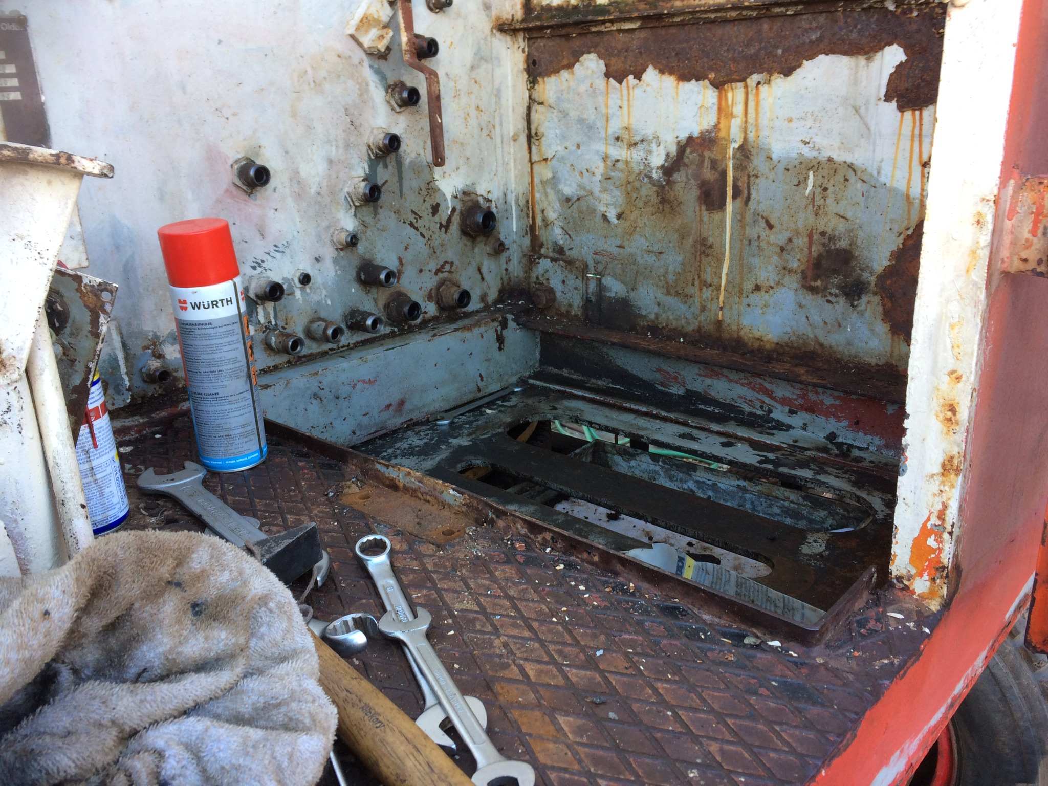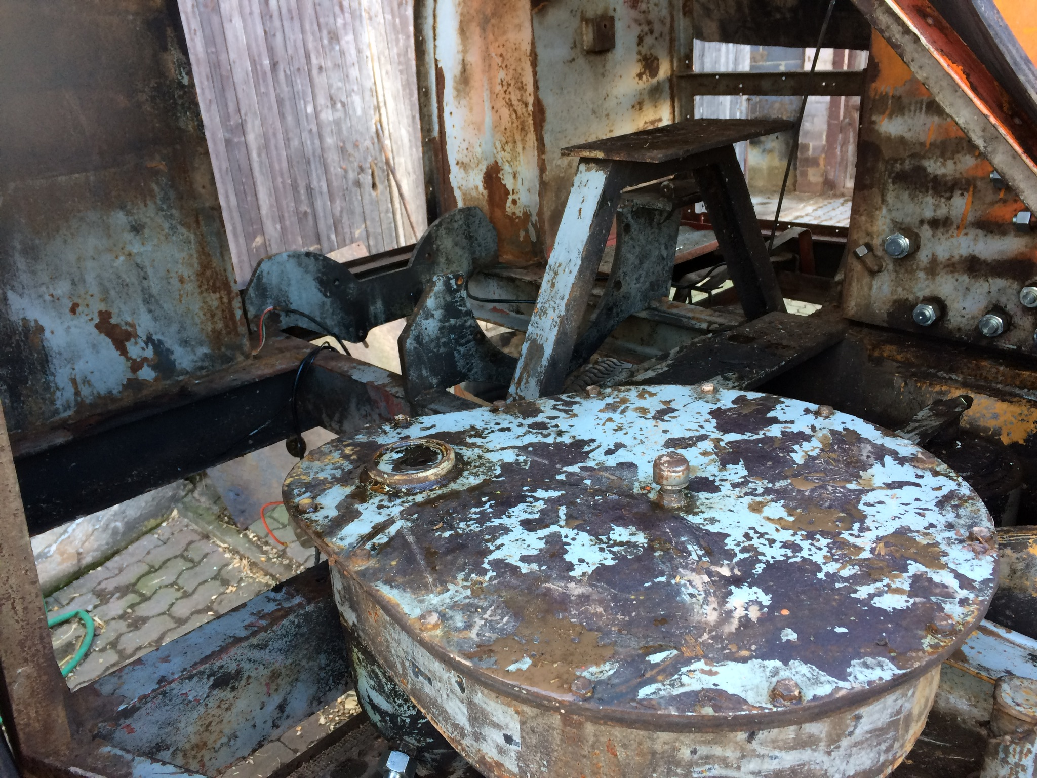 Die Kabine geht wie alle abgebauten Teile zum strahlen. Der Rahmen wird mit der Drahtbürste behandelt.