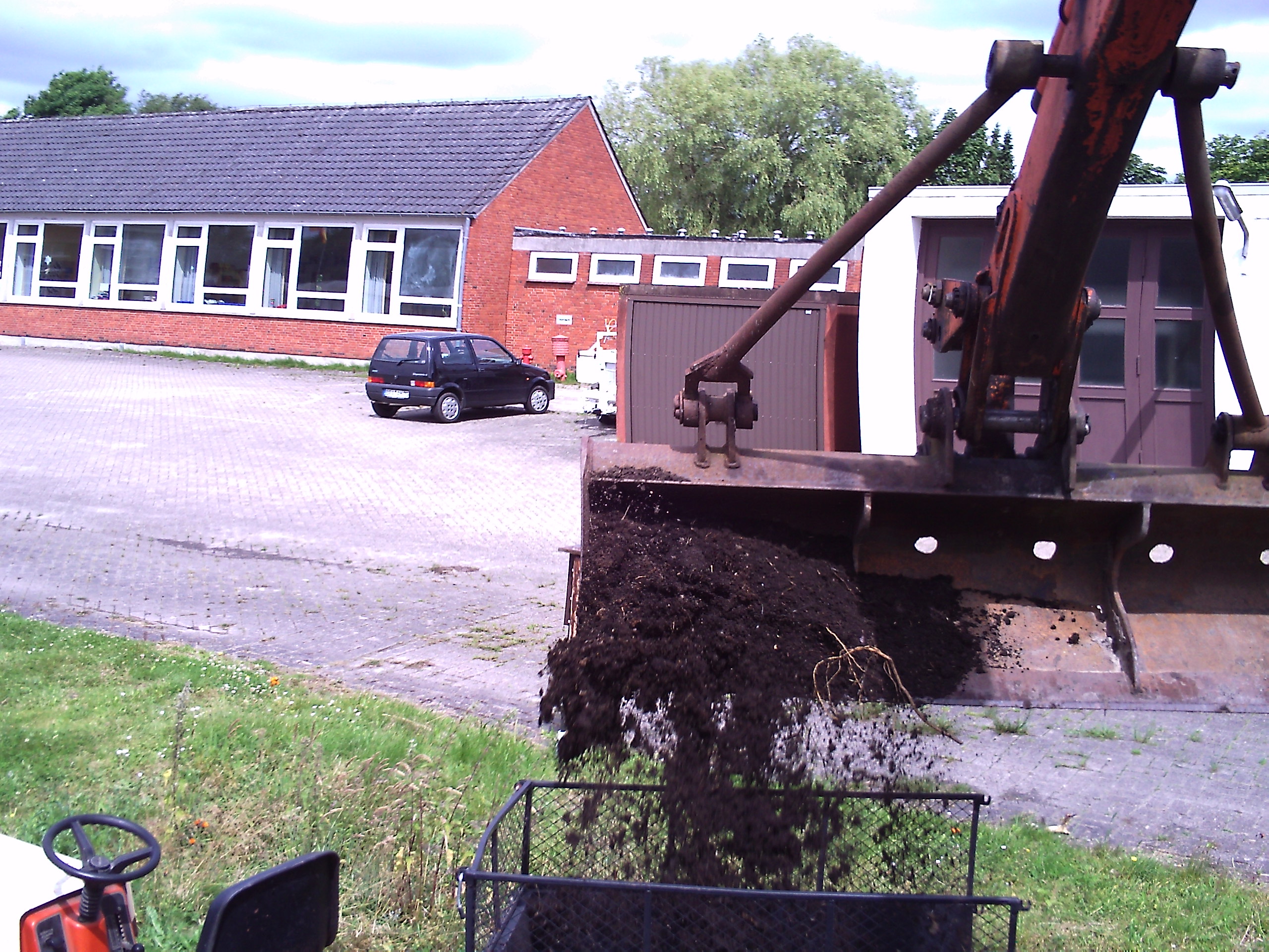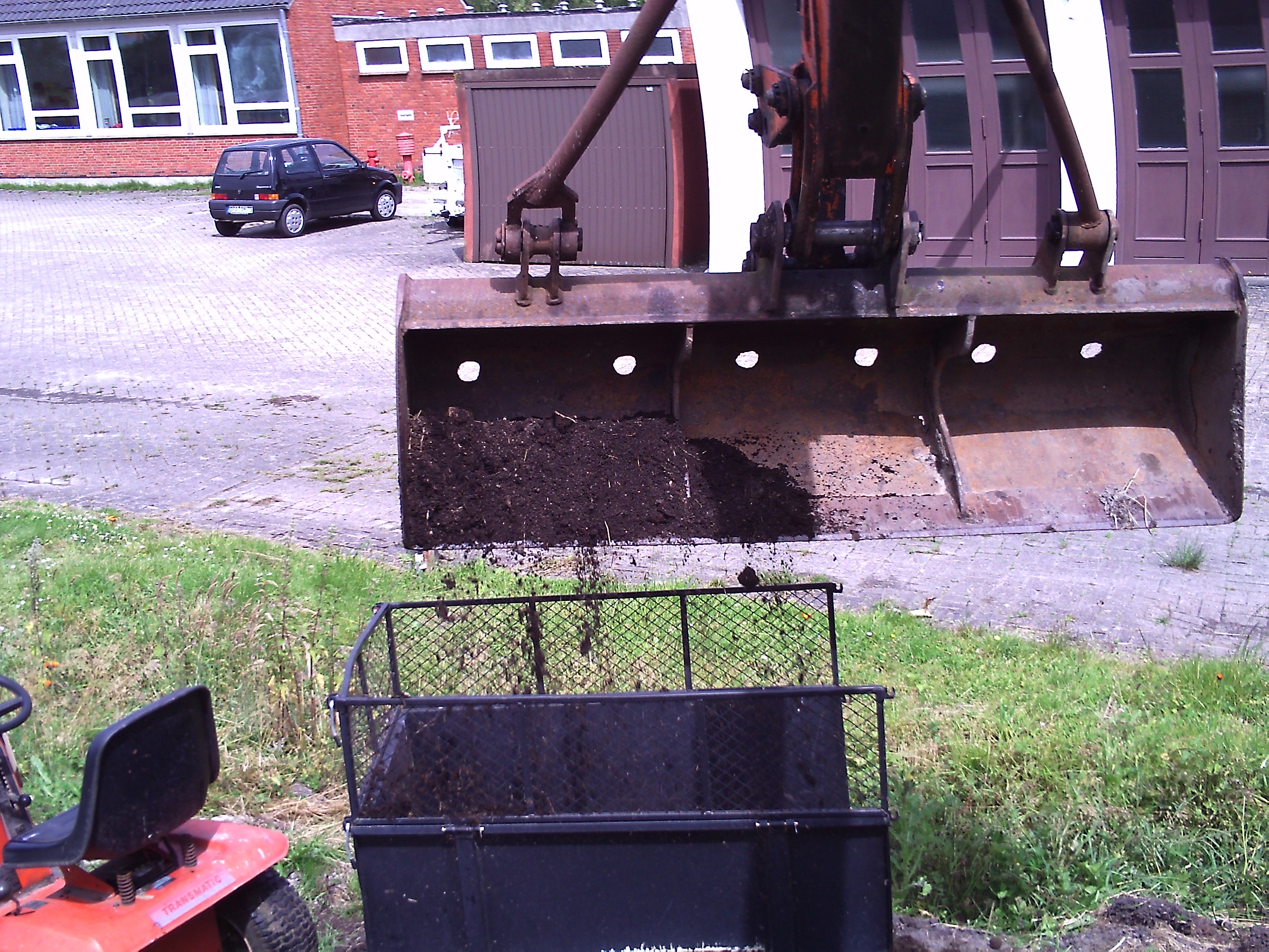 zuerst mal die bilder bei denen die nachbarn immer schmunzeln.. der grosse bagger gegen den kleinen anhänger am rasenmähertrecker..