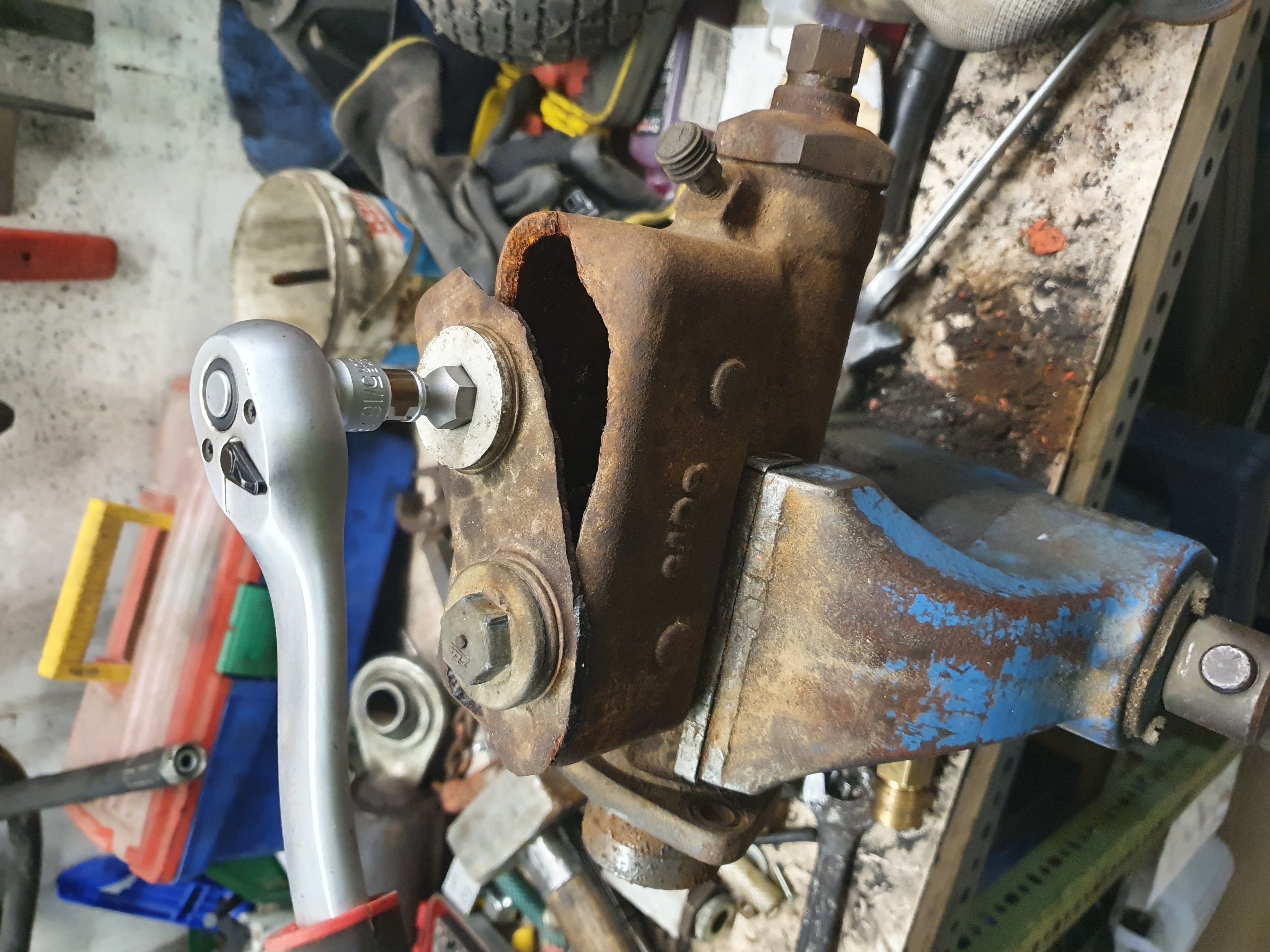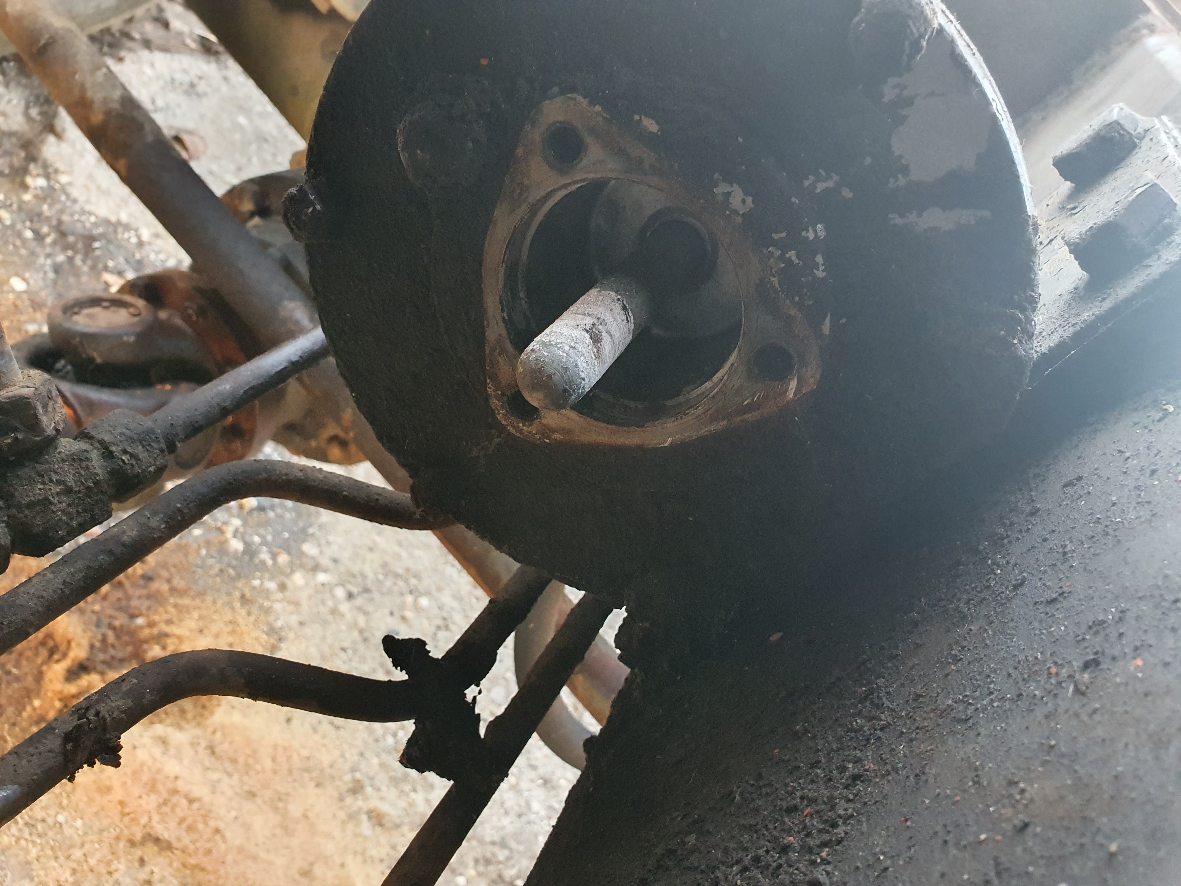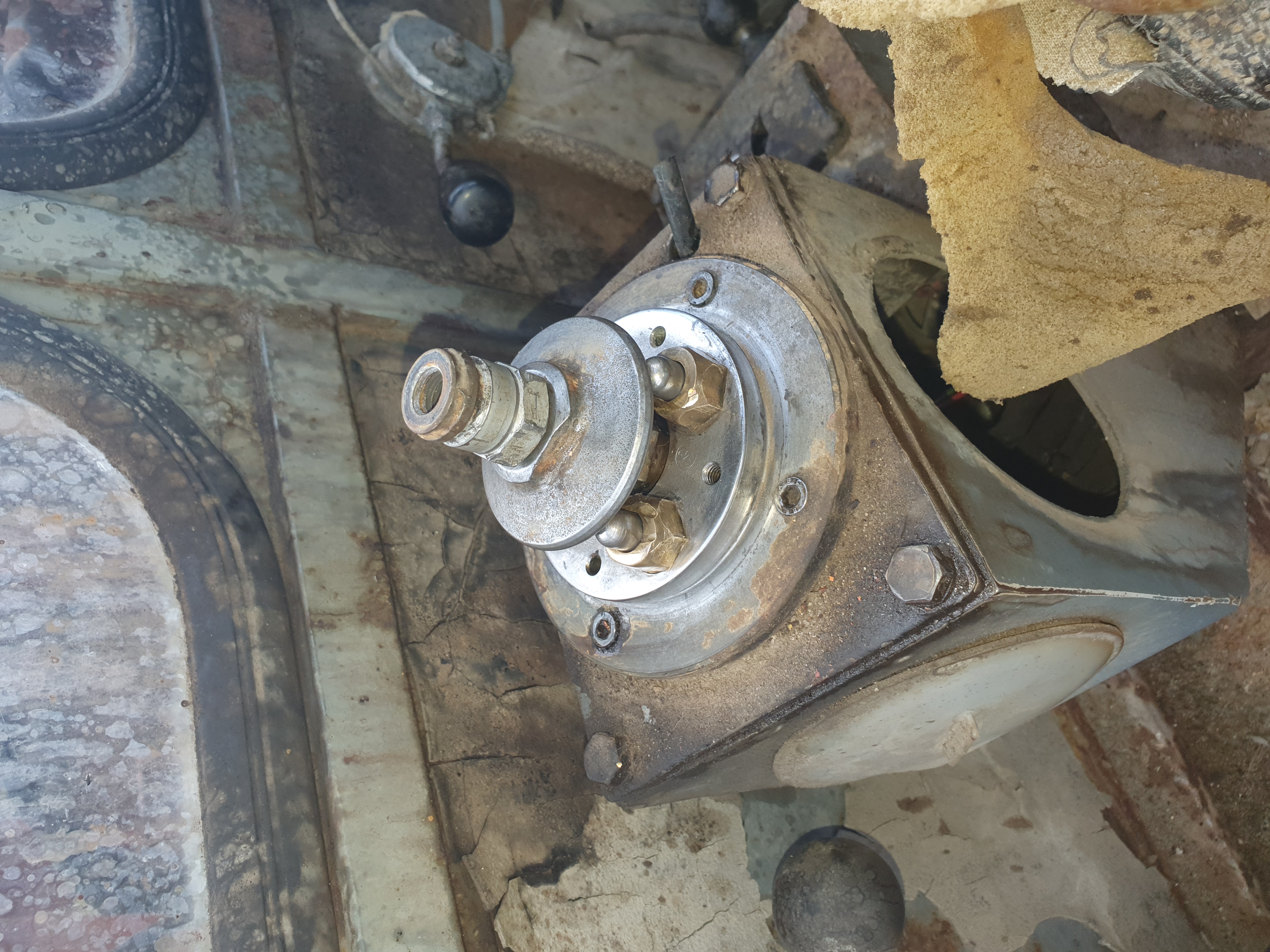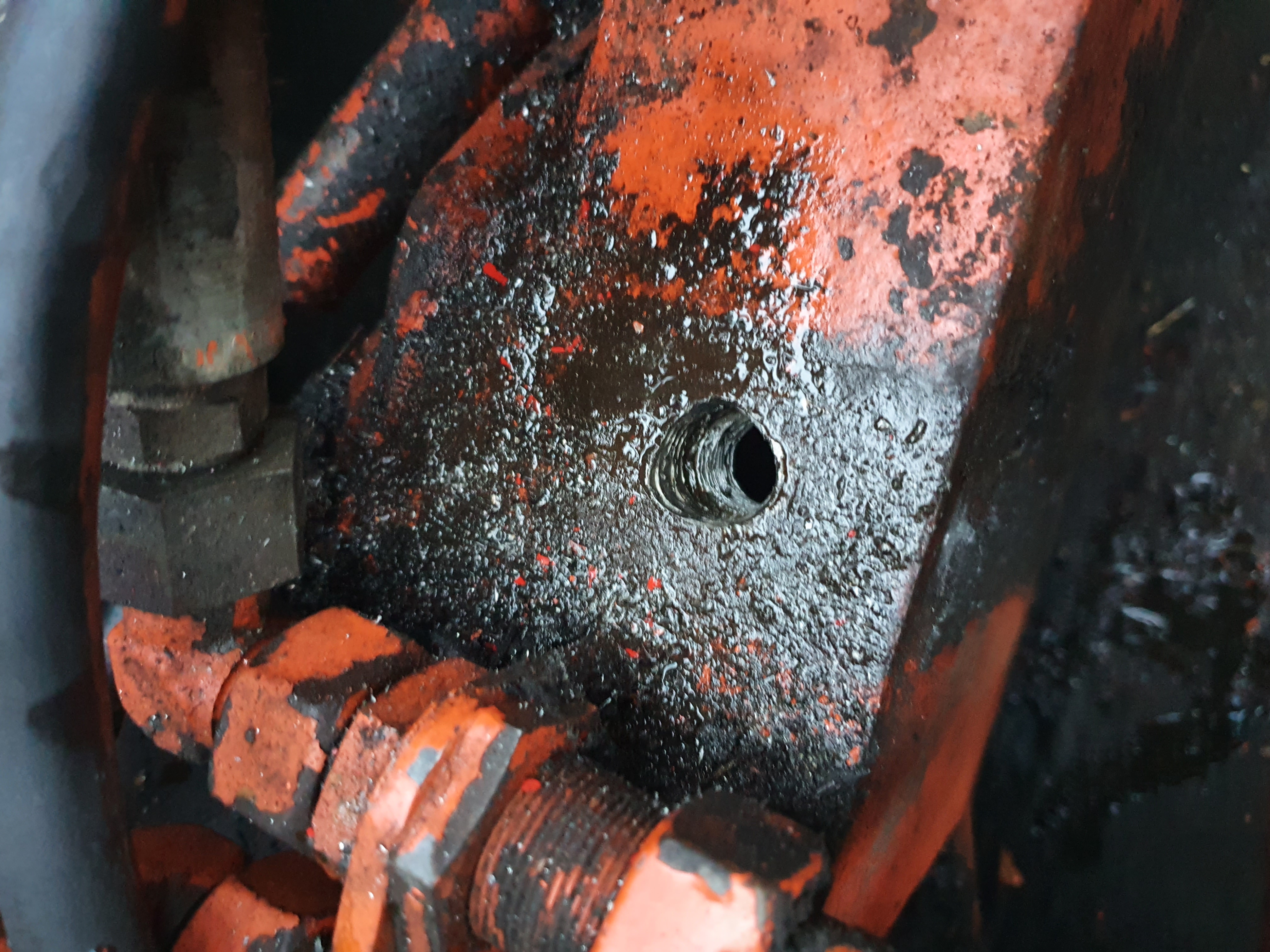 Heute mal geschaut warum das Batteriefach samt der Eberspächer immer so gewackelt hat. Siehe da die lange Schraube M16x120 war weggerissen. Und der Rest der Schraube über die Jahre zu eins geworden mit dem Bagger 😳☹️