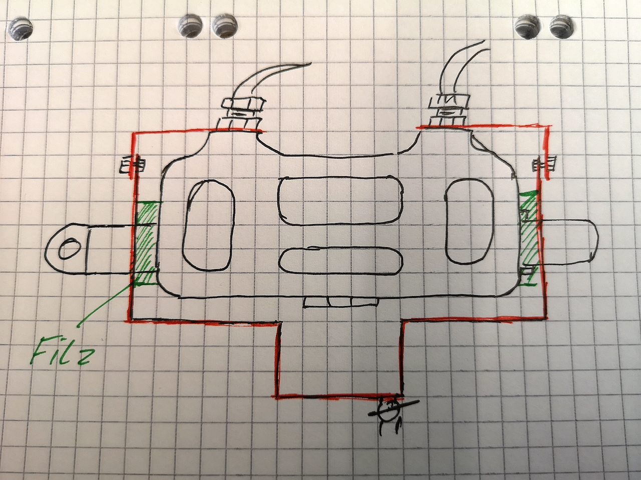 Die rot gezeichnete "Wanne" umschließt den Block fast vollständig. Alle Durchführungen (vorne die Ventilschieber, hinten die Federbecher) sind mit Filzringen "abgedichtet". Austretendes Öl sickert also in die Filzringe und läuft von dort aus in die Wanne. Zugleich sorgen die Filzringe dafür, das kein Staub/Dreck eintreten kann und hält die Standen zudem immer etwas Ölfeucht, was Korrosion unterbindet.