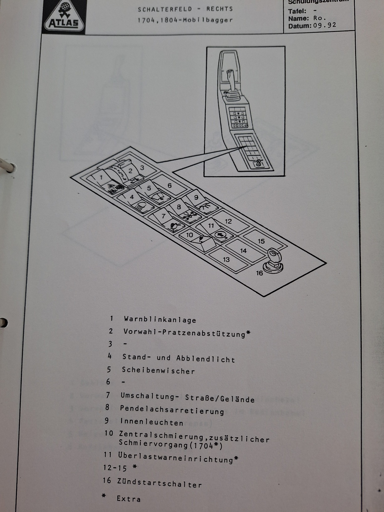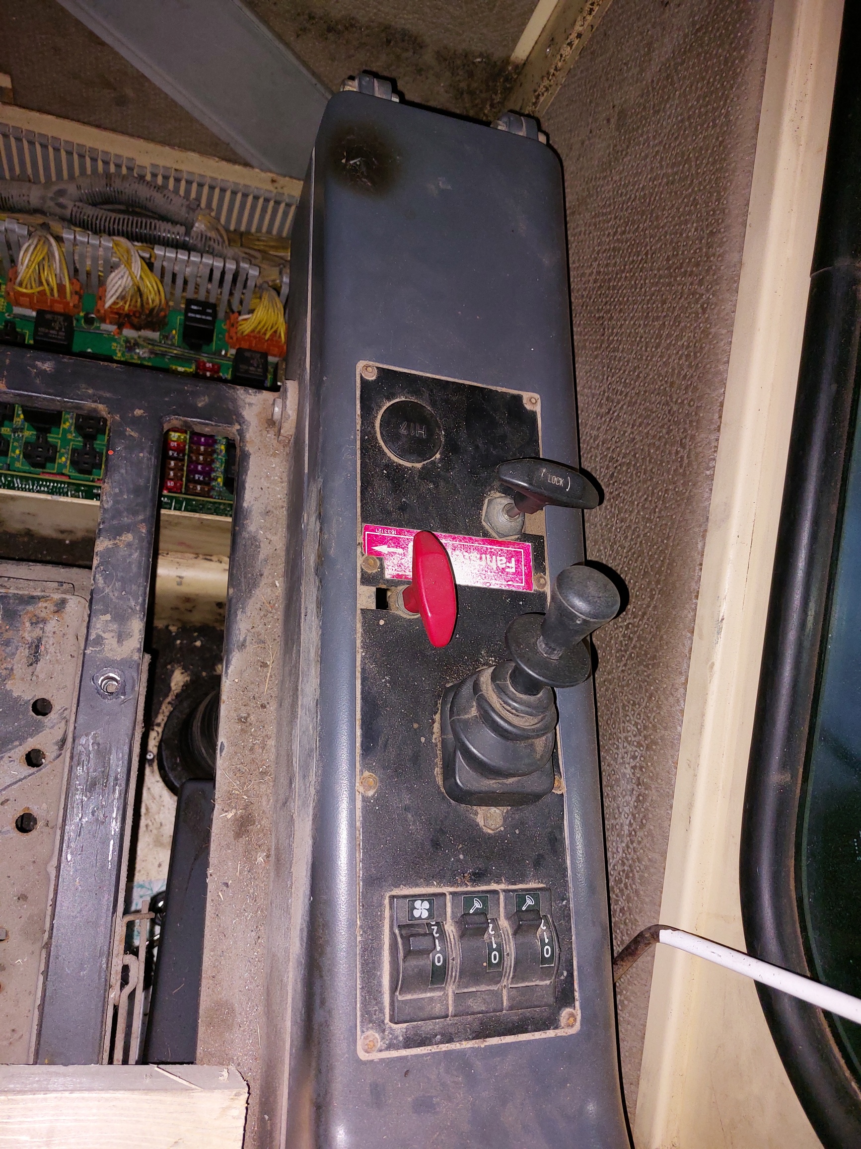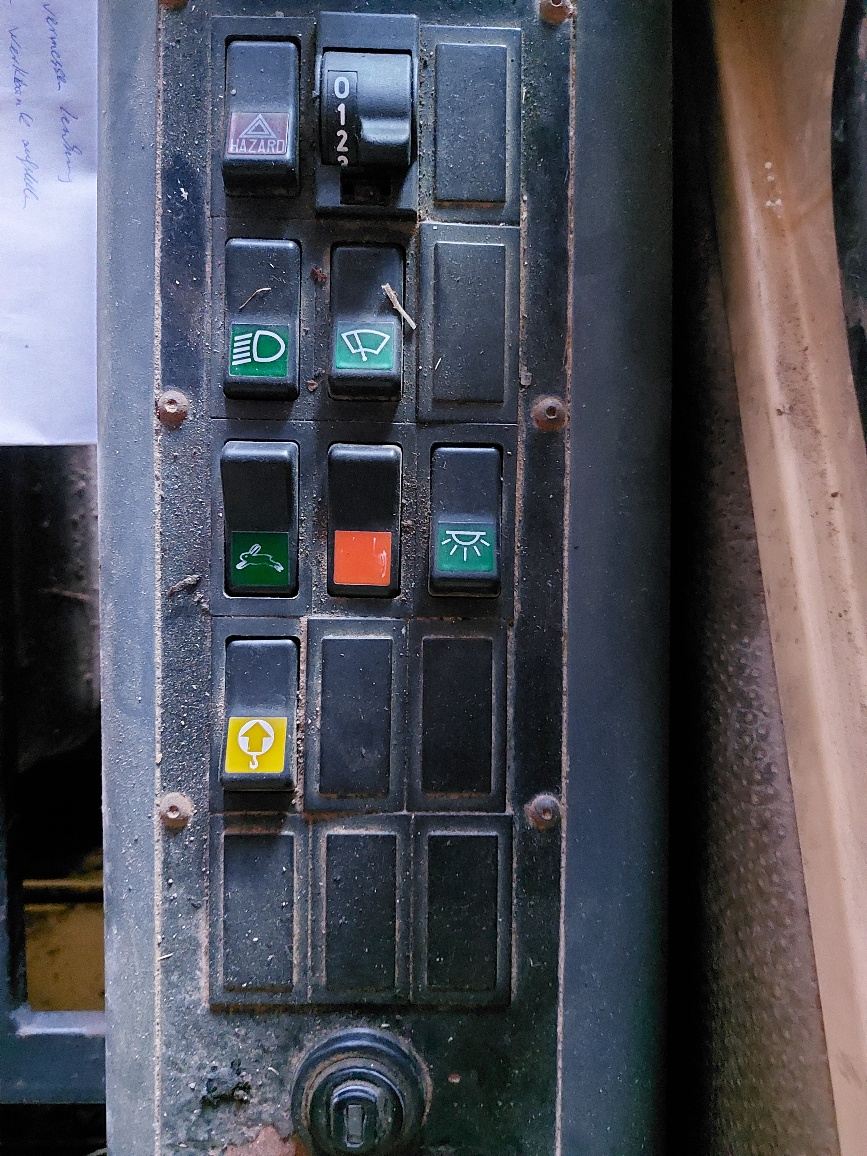 Kannst Du mal ein Bild von der rechten Konsole einstellen. Ich hab mal ein Bild von der Ausführung der ersten Generation mit angehängt. Der Kriechgangschalter ist da eigentlich im Fahrtrichtungsschalter am Lenkrad links integriert. Der Gangschalter in der rechten Konsole (Schalter Nr 7). Bei den kleineren Baggern war der Umschalter links, wo bei Dir die Verschlusskappe drauf ist und mit Luft gesteuert.