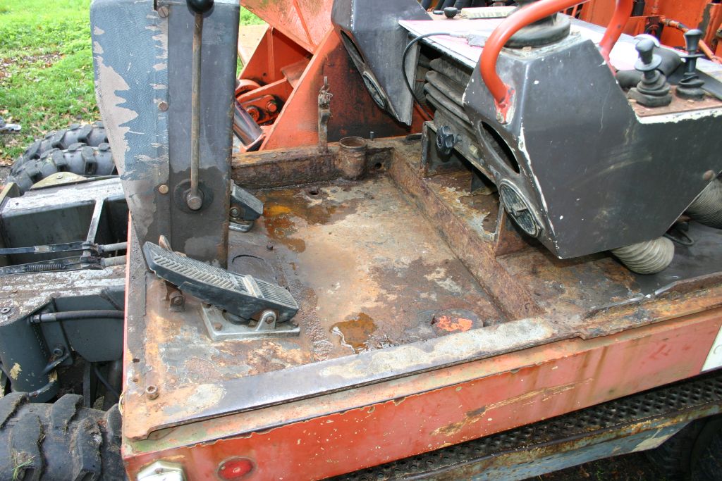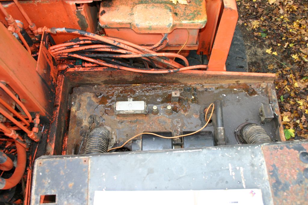 So fand ich meinen 1302 E aus 1984 - jetzt 30 Jahre alt mit ca. 11.000 BStd. Er ist voll funktionsfähig, hat aber einige Öllecks. Des weiteren ist das Führerhaus übel verrostet. Ein 2m breiter Grabenlöffel ist dabei. Eine der langen Haltestangen ist verbogen, und die 3 Umlenkhebel am Knickarm für den Löffel sind alle verbogen. Ein guter 80cm Greifer vom Bj. 2000 ist montiert. Der war komplett ölig - es tropfte aus einer der großen Schnellkuplungen. Ich habe die Dichtringe getauscht - ohne Erfolg. Jetzt ist das greiferseitige Kupplungsteil neu und das Leck dicht. Der Greifer ist aber immer noch ölig - leider ist der Hauptstempel undicht. Jetzt muss ich den Greifer zerlegen und überholen - das war leider nicht geplant.