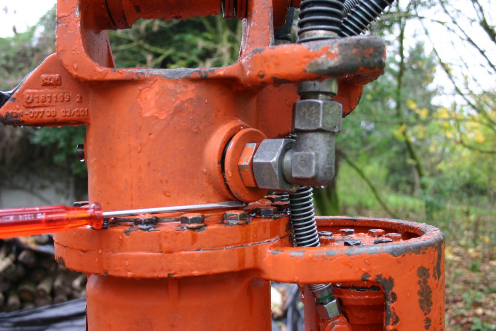 Ich habe lange gesucht und bin mir noch nicht sicher, wo eigentlich das Leck liegt. Zuerst dachte ich, es ist nur eine der Schnellkupplungen. Die habe ich getauscht, aber Öl leckt immer noch. Jetzt habe ich den Greifer gewaschen, um genau zu sehen, wo es leckt. Siehe Bild - wo die Spitze vom Schraubendreher ist, tropft das Öl. Das ist die Leitung zum Schließen. Die Verschraubung sitzt fest. Ebenfall Öl leckt vom großen Zahnkranz zum drehen - es läuft offenbar von innen auf den Zahnkranz. Und letztendlich läuft auch noch etwas Öl am Hauptstempel herunter. Entweder ist es ein Defekt an der Leitung (unwahrscheinlich) oder die drehbare Abdichtung ganz oben am Stempel ist undicht - aber dann würde es wohl kaum oben an der Verschraubung herauslaufen.