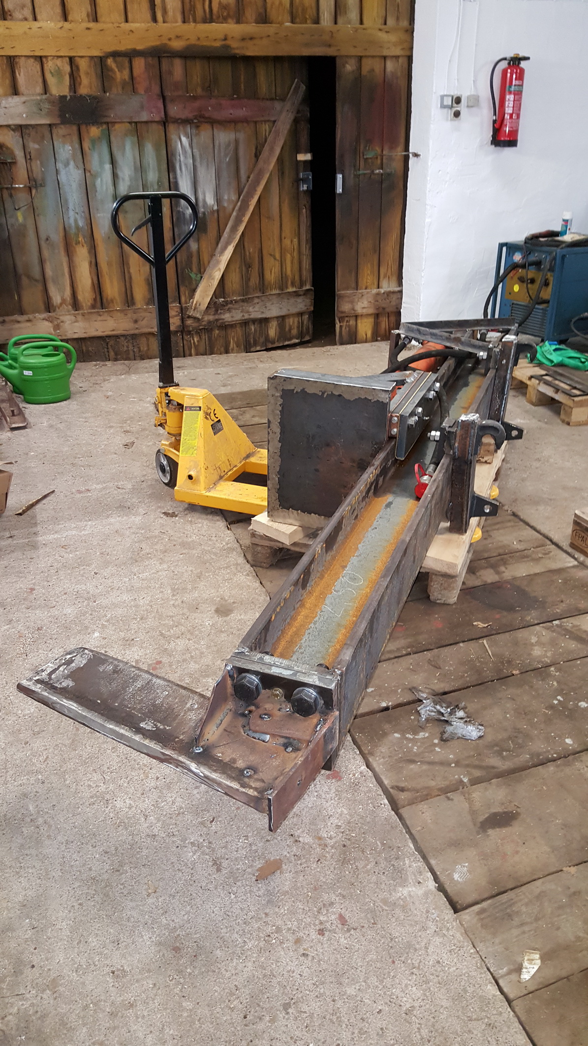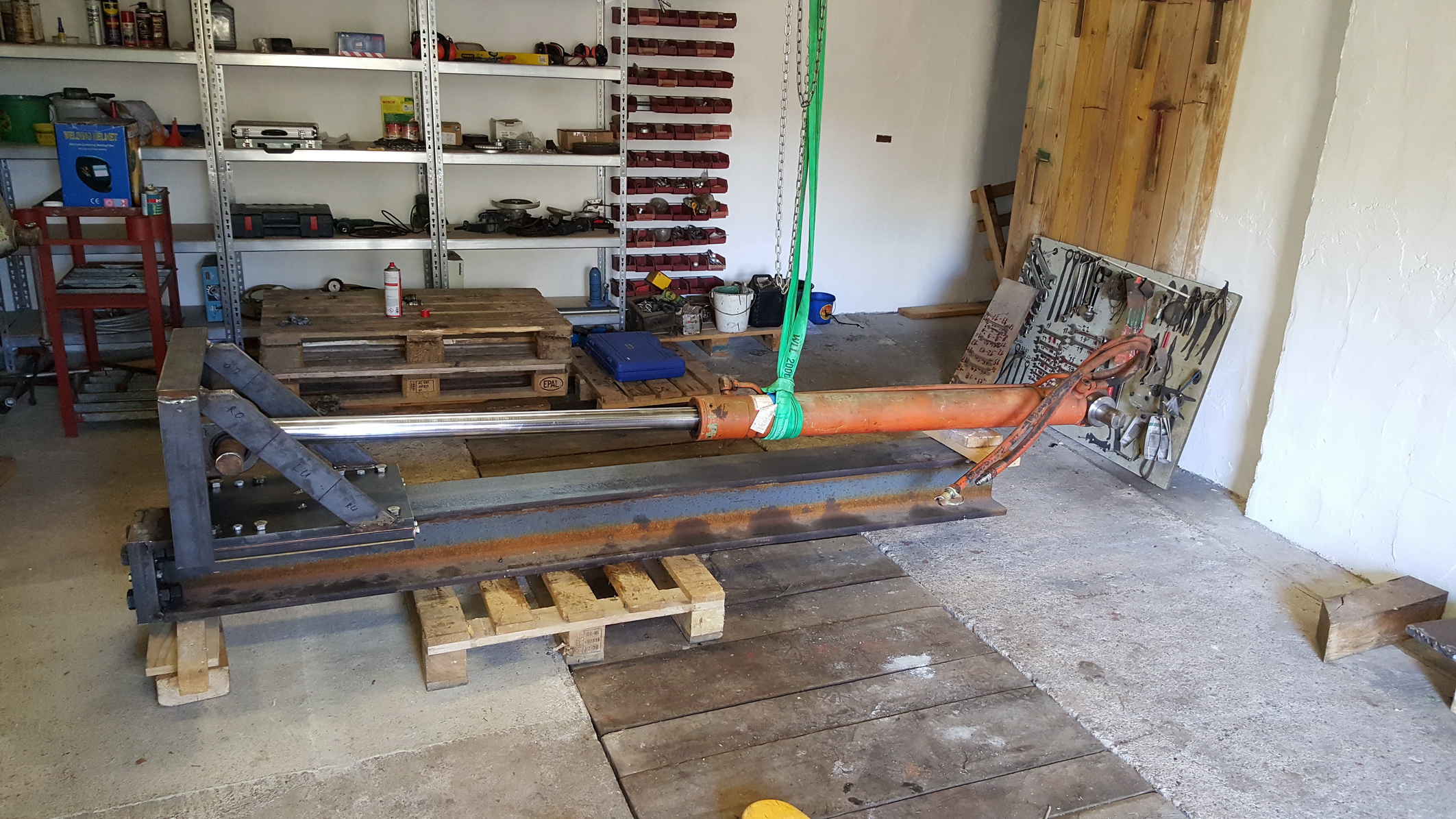 Leider waren die Hydraulikschläuche zu kurz, weshalb er das erste Mal liegend getestet wurde: