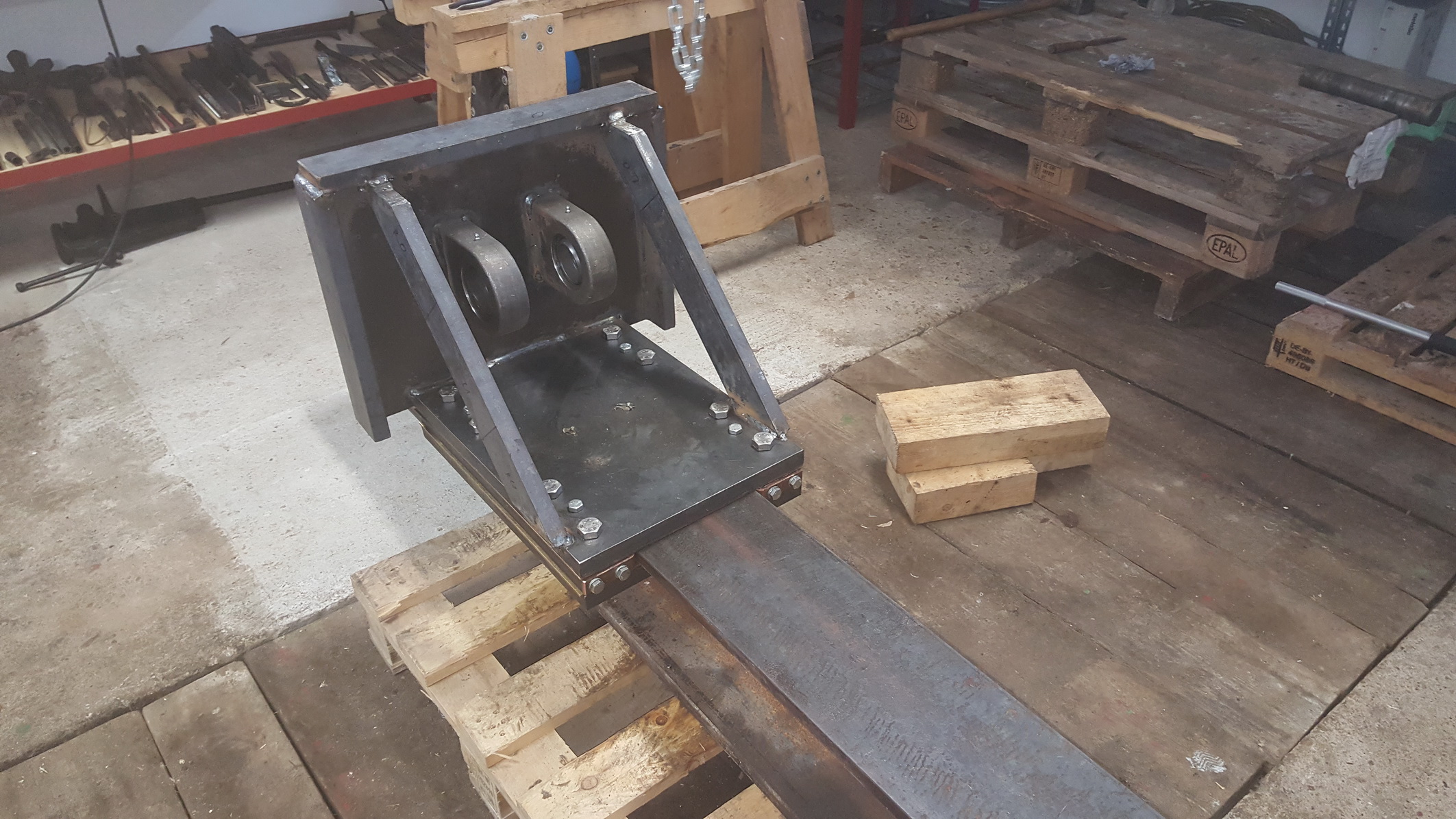 Nun kann der Zylinder (ausgefahren) bereits auf einer Seite montiert werden. Hierzu sollte der Schlitten in Endstellung stehen. Somit ergibt sich dann die Position der zweiten Anschweißaugen.