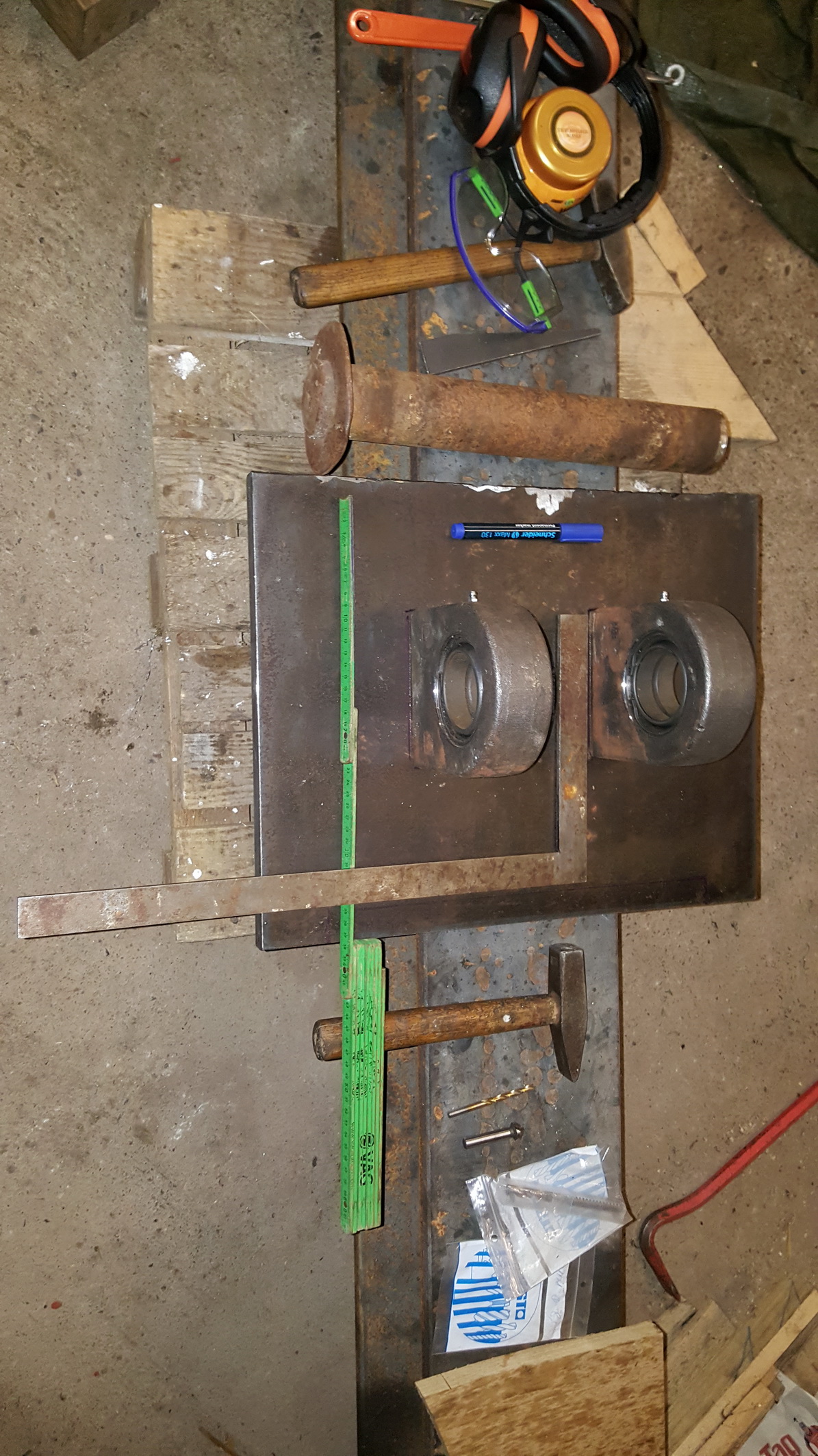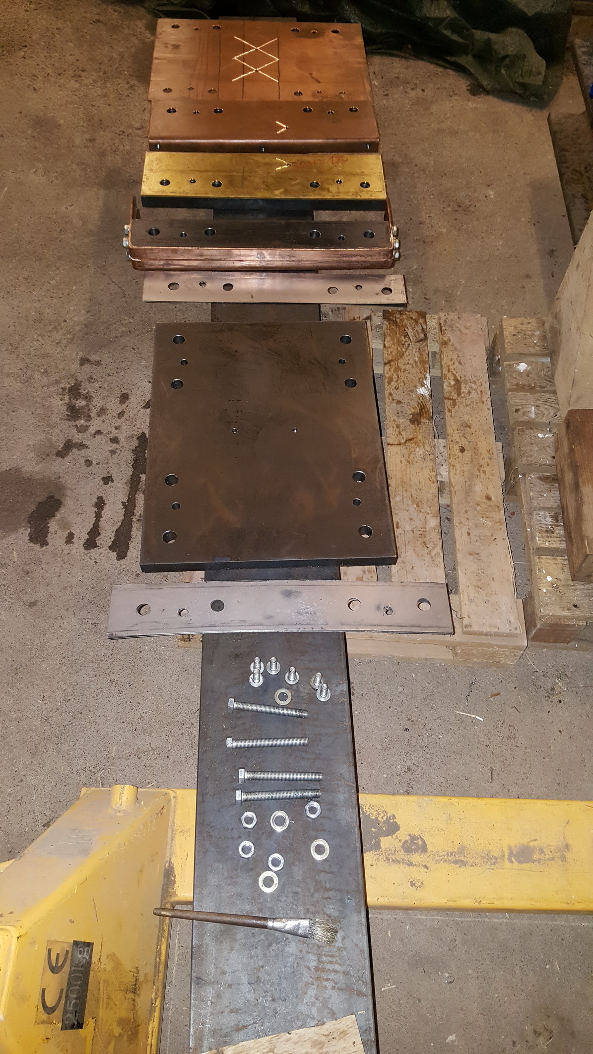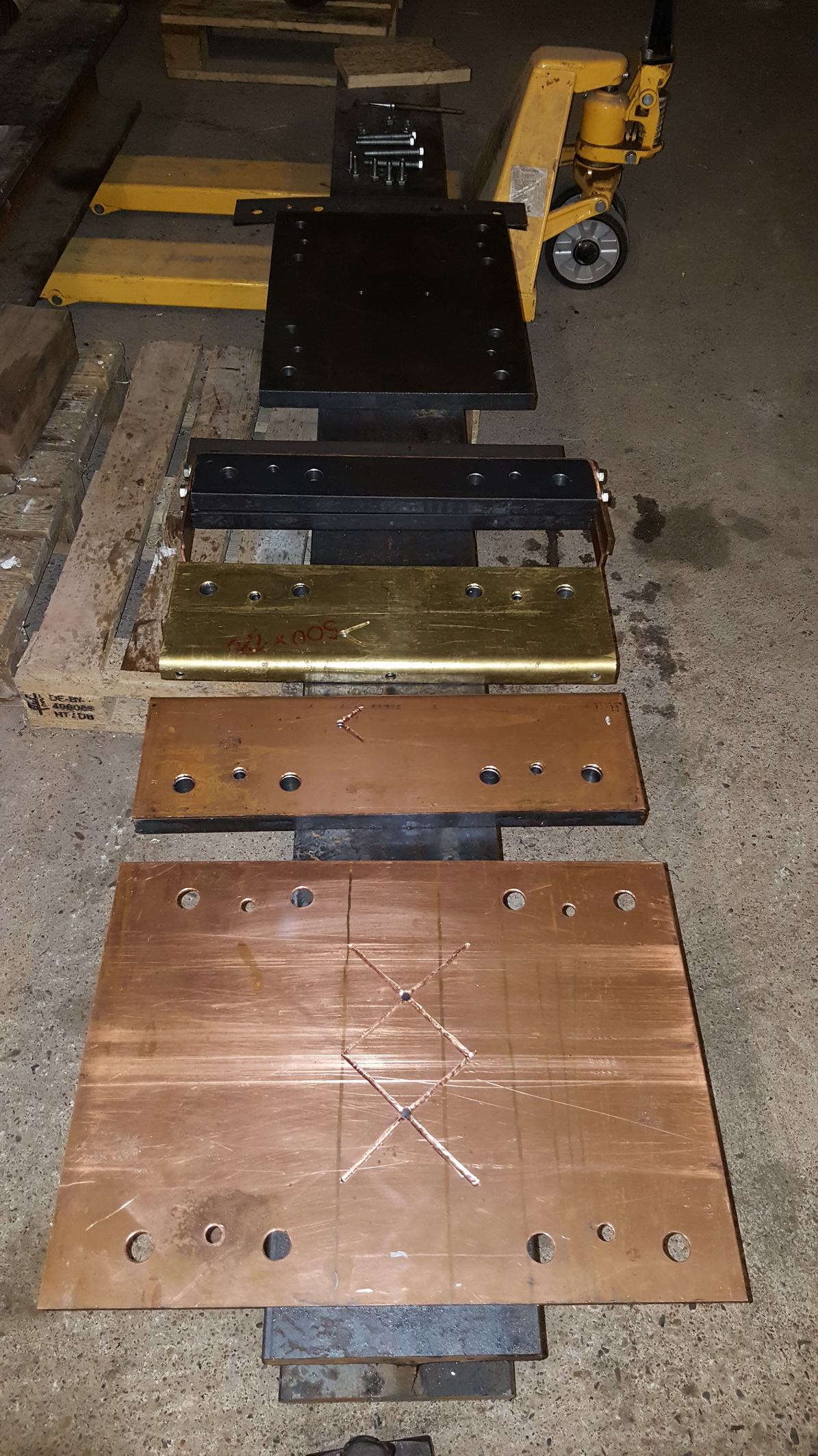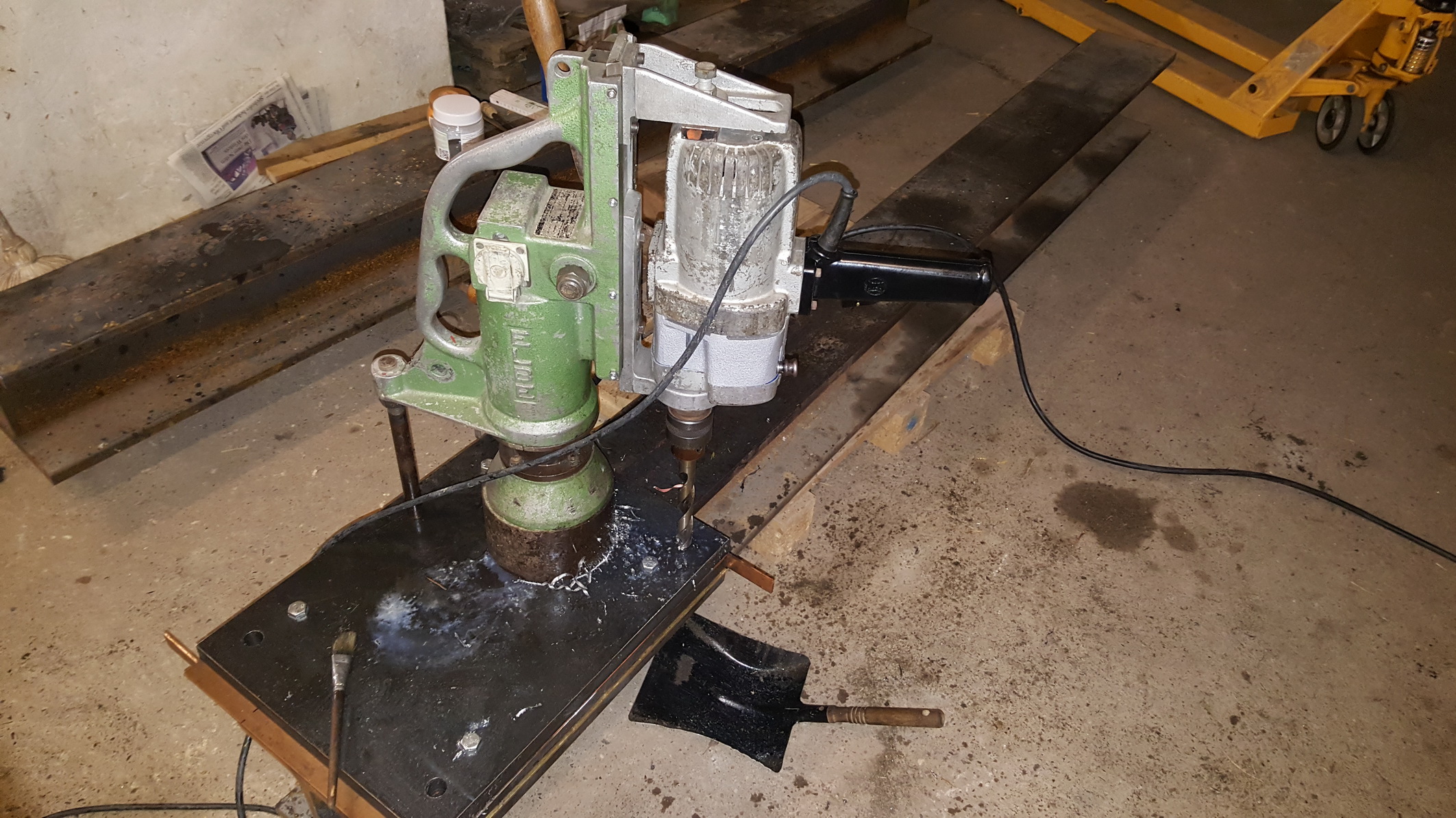 Spantechnisch wurde mit dem Schlitten begonnen. Der Schlitten wurde mit M12er Schrauben vorgespannt, um die Bohrungen für die M20er Schrauben mit der Magnetbohrmaschine durchführen zu können. Wichtig ist, dass hier bereits alle Elemente wie später vorgesehen übereinander liegen (Platte, Zwischenplatte, Messingführung, Distanzblech). Tipp: Lieber eine Distanzblech mehr unterlegen (nötig, um genügend Spiel im Schlitten zu haben), welches später wieder entfernt wird. Das ist jedenfalls leichter, als später nochmal ein passendes Distanzblech zu fertigen.
