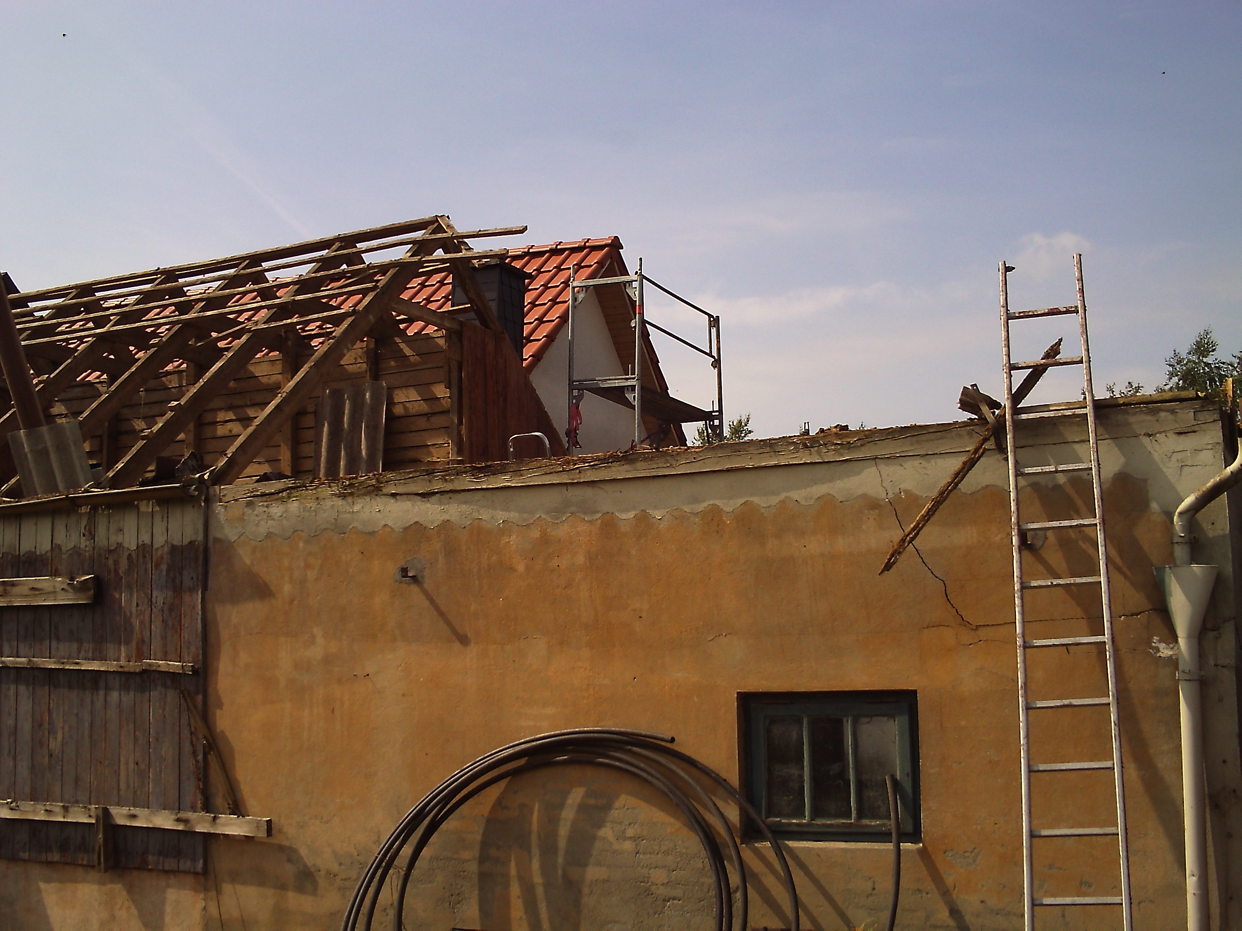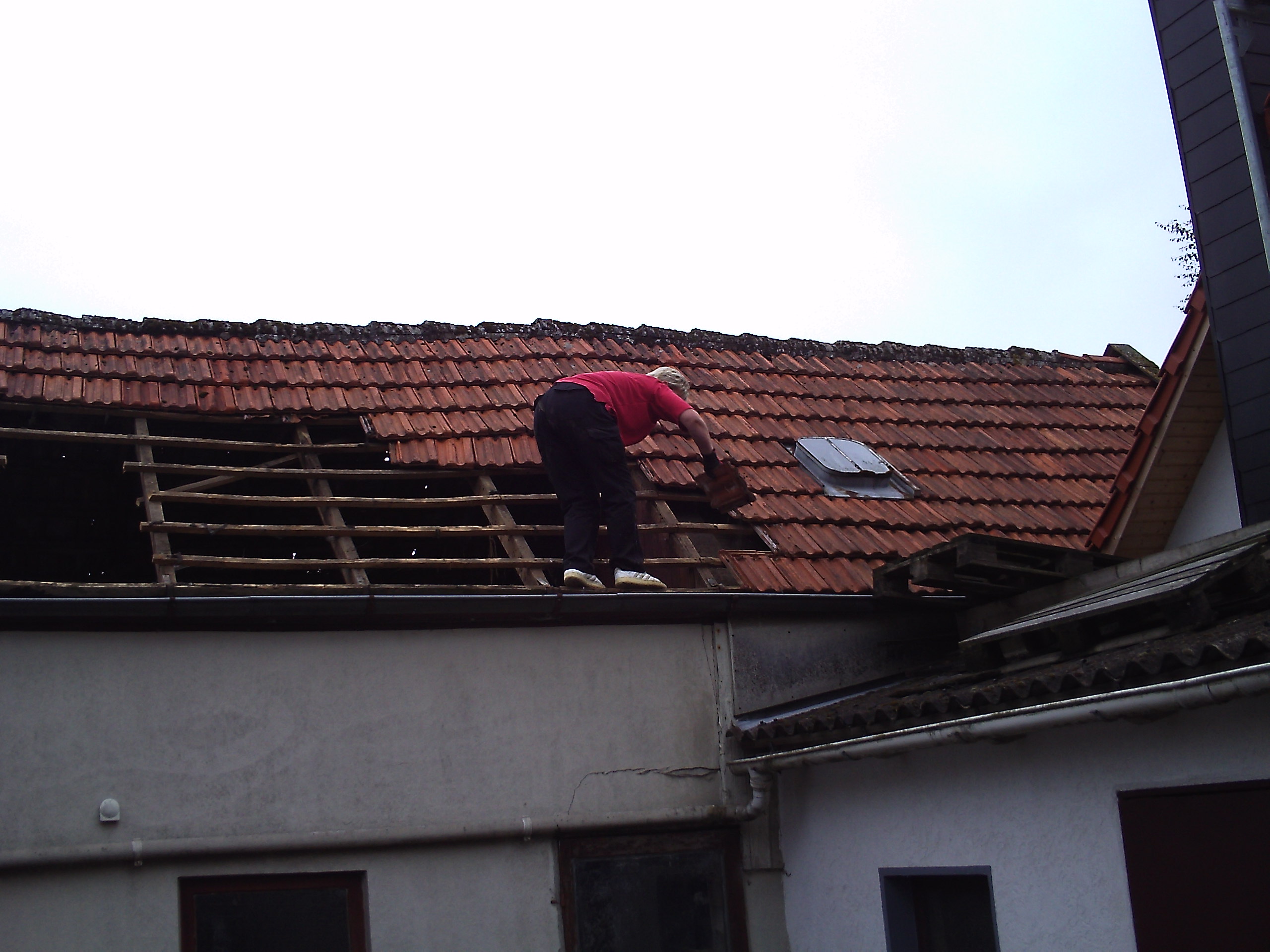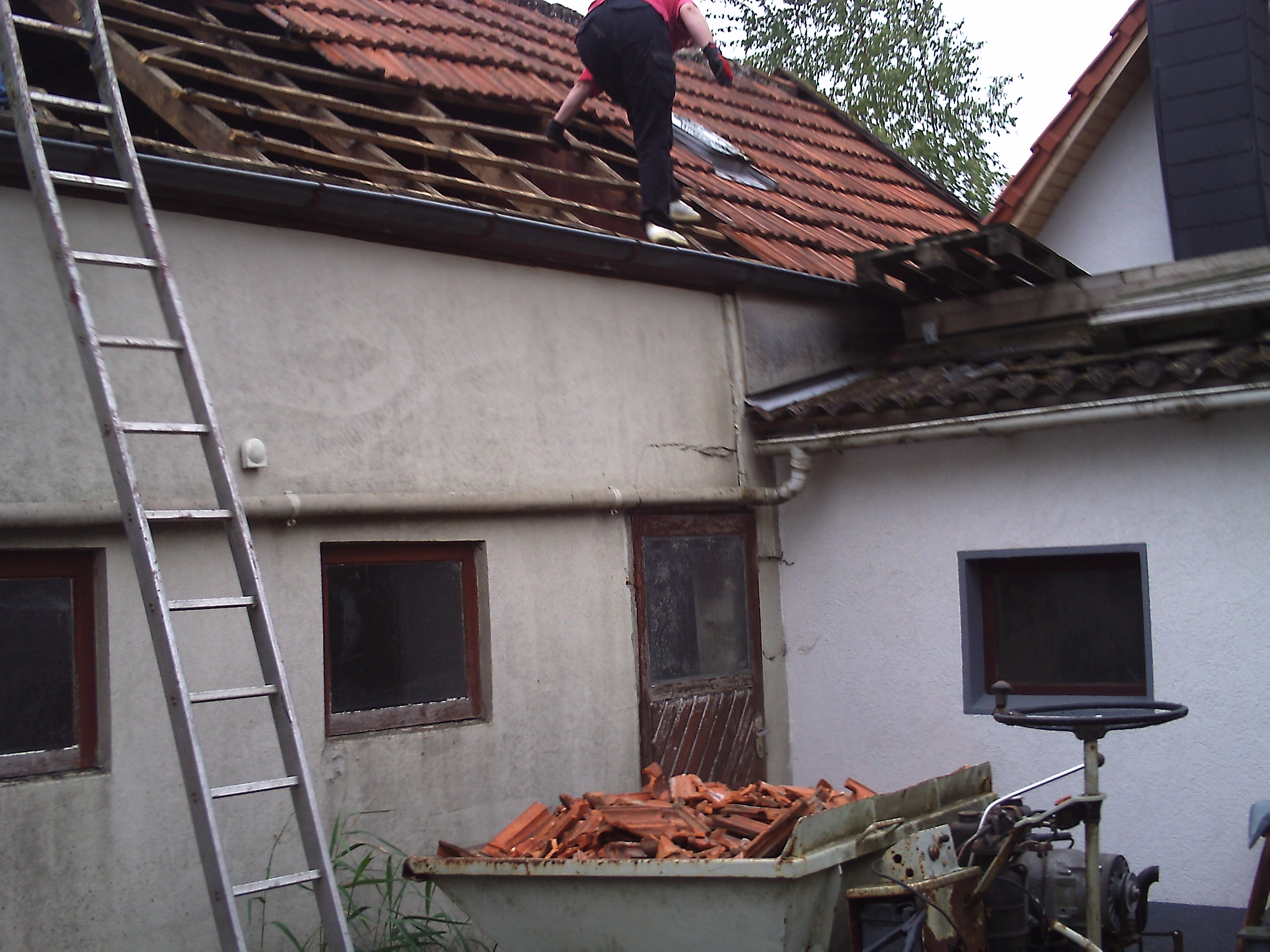 Zuerst gings im Innenhof los.. pfannen vom dach - da hier für den bagger und den radlader zuwenig platz ist musste der potratz dumper ran.. auf dem dach meine mitarbeiterin und mein nachbar die netterweise die pfannen mit runtergeworfen haben: