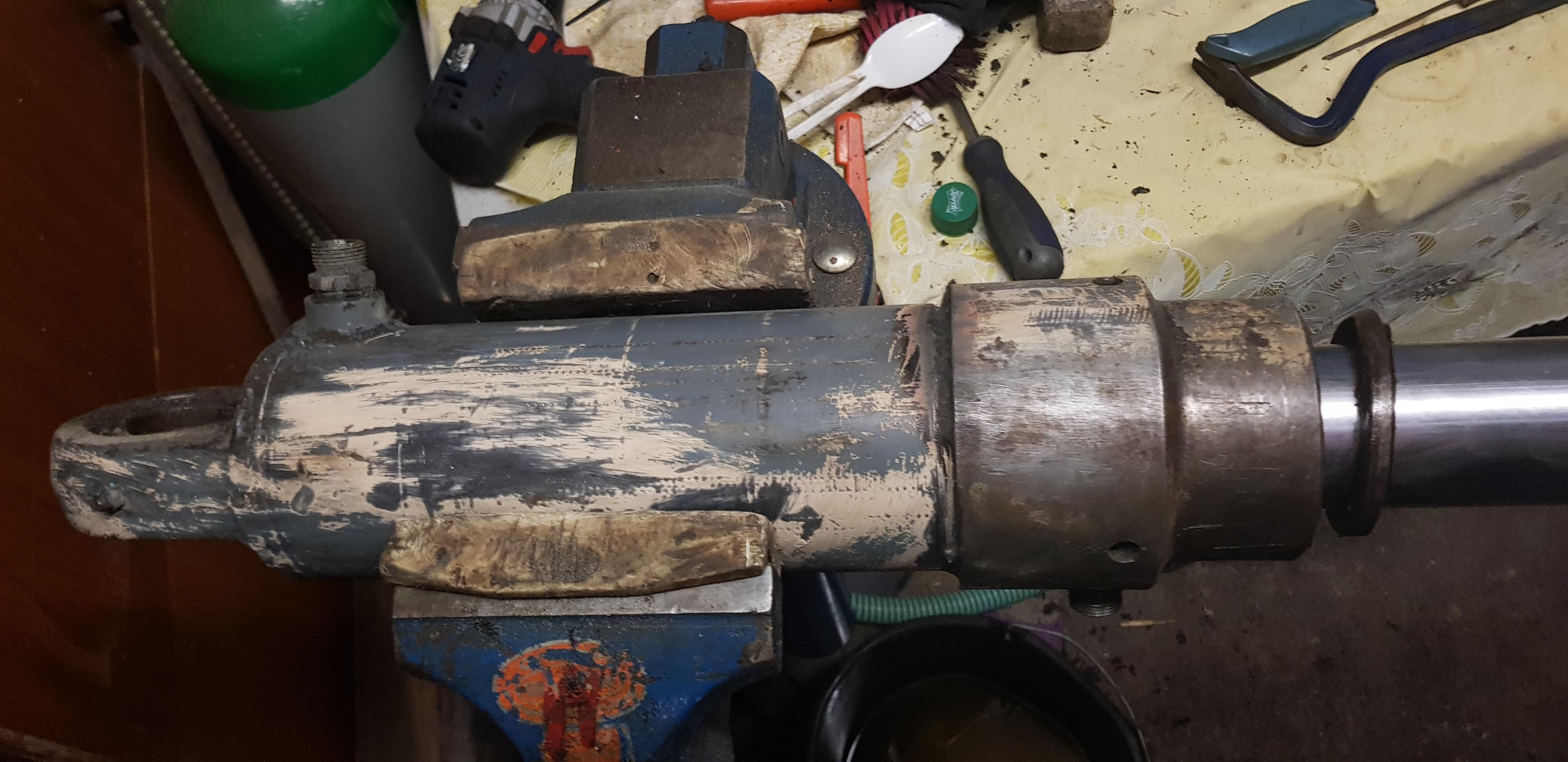Beim aufflexen darauf achten das keine Verbindung zum Zylinderrohr bleibt, die dann beim aufdrehen die Dichtfläche am Rohr beschädigen kann. Das Auge musst Du auch von der Schubstange trennen.(Schweißnaht flexen und Auge raus drehen)