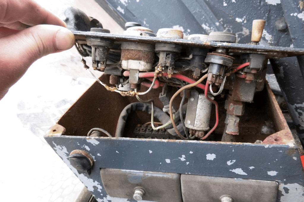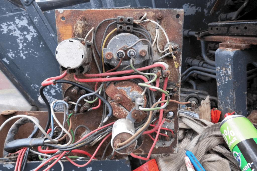 Viel mehr Sorgen macht mir der restliche Elektrick-Trick. Das ist ein übler Verhau, überall geflickt (Isoband, Lappen oder blank). Und in der Amaturenbox hat's ja offensichtlich auch schon gebrannt... Ich werde zur Sicherheit morgen mal eine 50A Schwebesicherung in die 15er Leitung bauen. Die Kabel sind alle so spröde, da weiß man nie... Vielleicht setze ich hinten auch noch ein Relais für die Glühkerzen, Dann braucht der Glühstrom nicht den ganzen Kabelstrang hin- und zurück, sondern kann direkt von der Bakterie via Relais zu den Glühkerzen. Das Gleiche vielleicht auch noch mit dem Anlasser und schon habe ich etliche Amperé raus aus dem Kabelbaum...