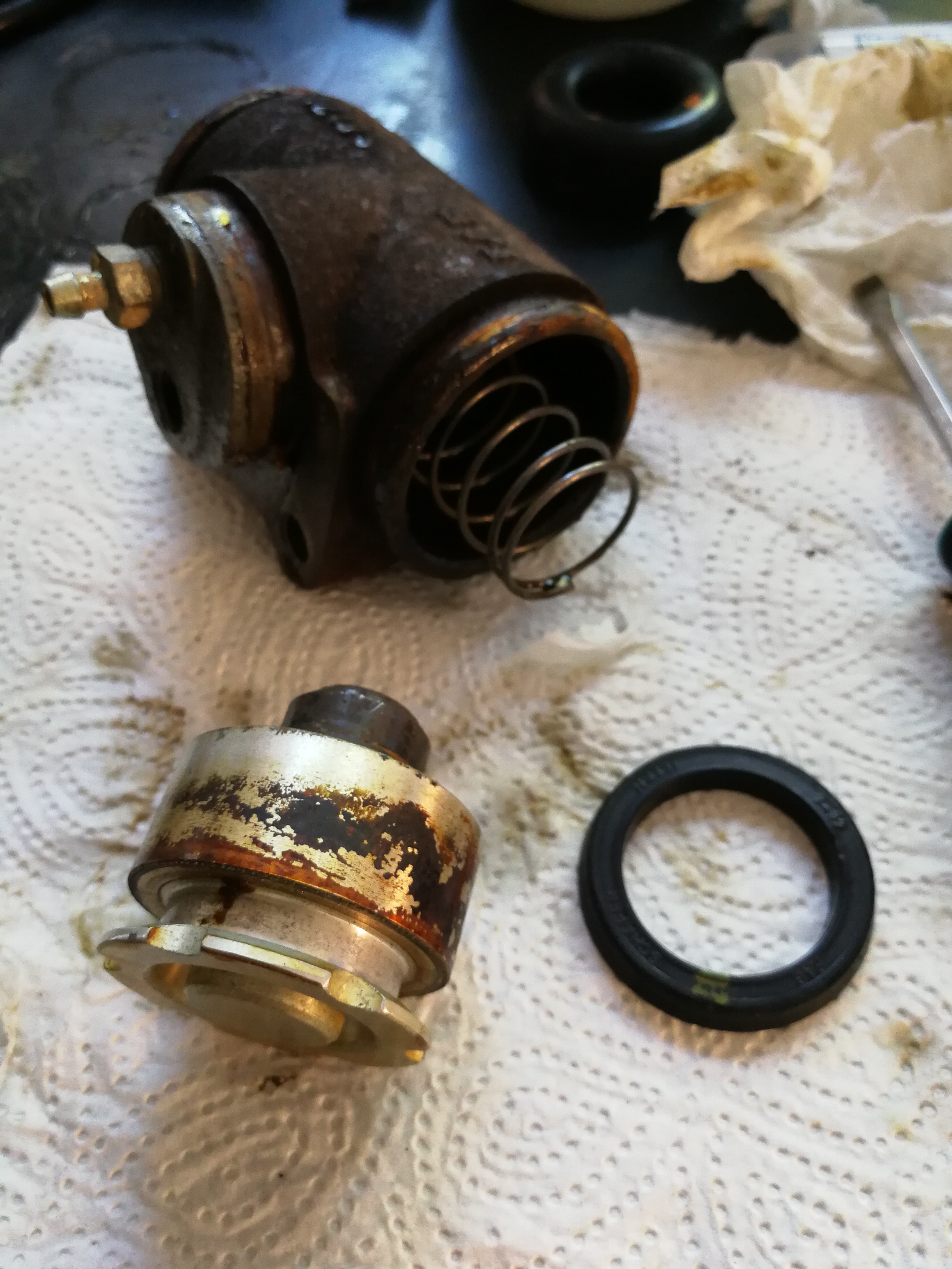Nachdem die Räder weg waren, gings an die Bremstrommel. Dazu habe ich einfach 2 alte Zylinderkopfschrauben in die 2 Gewinde in der Trommel geschraubt, um sie abzuziehen. Der Ausbau der Zylinder gestaltete sich einfacher als gedacht, wenn auch etwas umständlich. Die Radbremszylinder sind mit je 2 SW 17 Schrauben befestigt, die leider etwas schlecht zu erreichen sind. In meinem Fall saßen die Schrauben jedoch ziemlich locker, auch wenn ich bei einer schon gut zu kämpfen hatte. Mit etwas sanfter Gewalt und Rostlöser hat sie dann aber auch irgendwann aufgegeben. Den Dichtsatz hatte ich mir übrigens über egay bestellt, da er bei Atlas leider deutlich teurer war