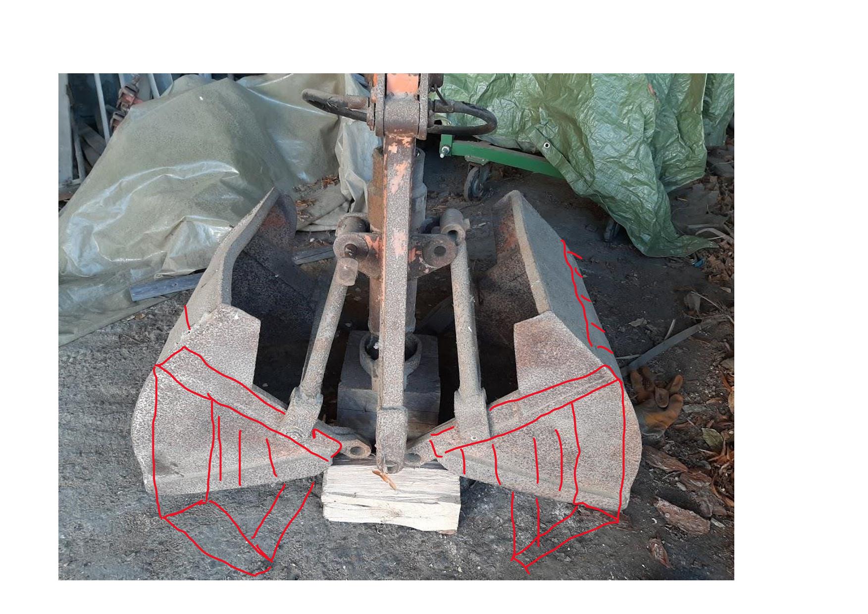 Alternativ könnte man einen Wechselschalengreifer draus bauen und die Seitenteile wie im Bild eingezeichnet ausschneiden und im gepunkteten Bereich mit Flachstahl verstärken. So gibt es die auch zu kaufen, aber funktioniert das wirklich?