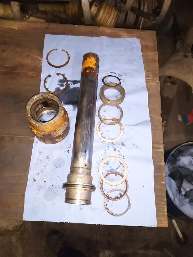 Die Zeichnung vom Zyliner sieht aber, um 180° gedreht, gar nicht so schlecht aus. Bei mir fehlen aber auf jeden Fall ein paar Teile, der Nutring zwischen gezahntem und normalem Seegerring in der Zylindermutter. Und die Nutringe auf dem Kolben haben sich wohl aufgelöst, wo der ganze Dreck saß, davon sind nur noch die Metallringe übrig, deswegen hatten die Teile auch so viel Axialspiel auf dem Kolben