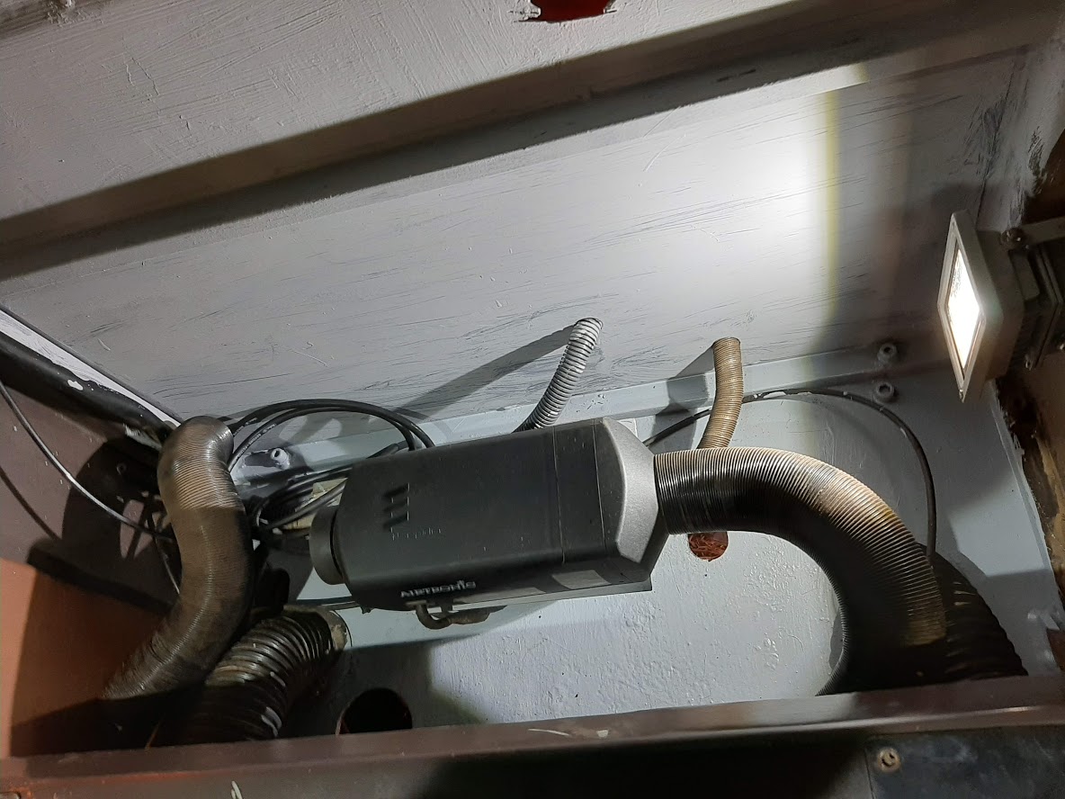habe den Corona-Urlaub mal genutzt und mit der Renovierung der Hütte begonnen. Eimerweise ein Gemisch aus Sand, Öl und Zigarettenkippen entfernt. Anschließend mit allen möglichen Kaltreinigern und Lösungsmitteln alles entfettet und das ganze Geraffel der inkontinenten Schmierölheizung entfernt. Danach Rostumwandler auf das narbige Blech. und eine ölbeständige Lackierung aufgebracht. Als Heizung wurde eine vorhandene vom Vorbesitzer im Batterieraum untergebrachte Eberspächer-Standheizung in die Kabine eingebaut.