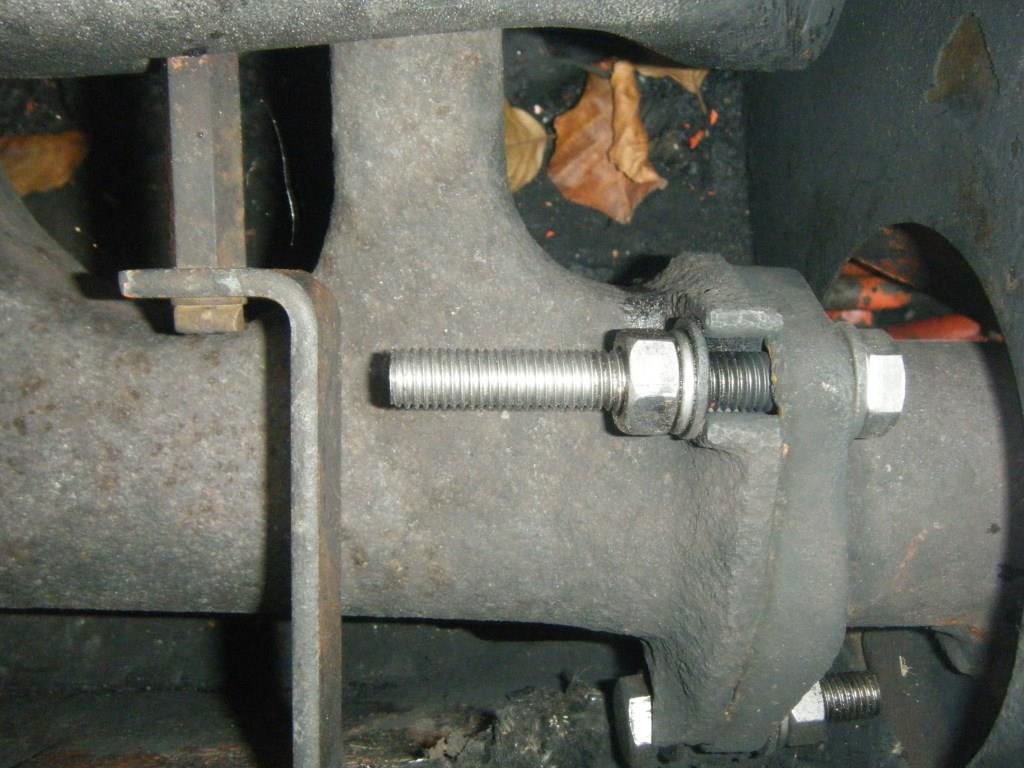 Es war sehr schwierig, die drei Bolzen auf der Abgas zuzugreifen. War es notwendig, den Luftkanal vor dem Hydraulikölkühler zu entfernen. Ich benutzte M12 Edelstahl-Bots, die ich auf Lager hatten. Diese können nicht die beste Wahl des Bolzens für hohe Temperaturen und hoher Belastung sein - zumindest sind sie weniger wahrscheinlich, um Rost.