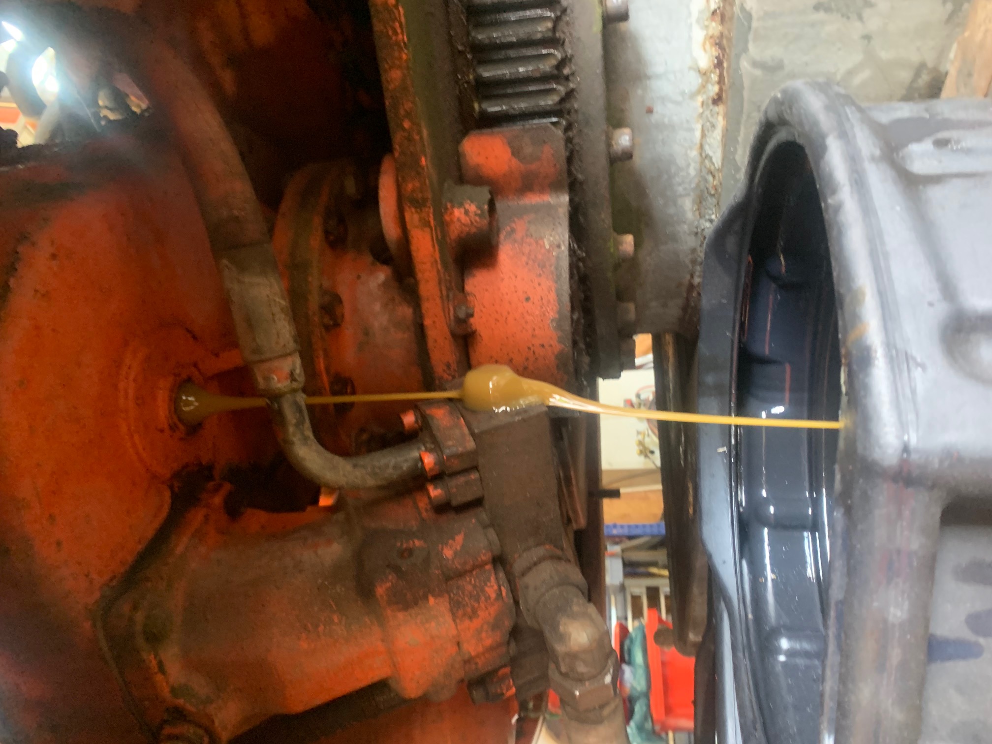 Ich hab jetzt nochmal nachgeschaut. Wenn Deine Pumpe vom Motoröl geschmiert wird, dann müßte hinten am Motorblock eine Leitung oder Schlauch zur Einspritzpumpe gehen. Anbei mal ein Bild, wo man es einigermaßen erkennt. Ich kann es auf Deinem Bild nicht richtig erkennen, aber da könnte eine Leitung sein.