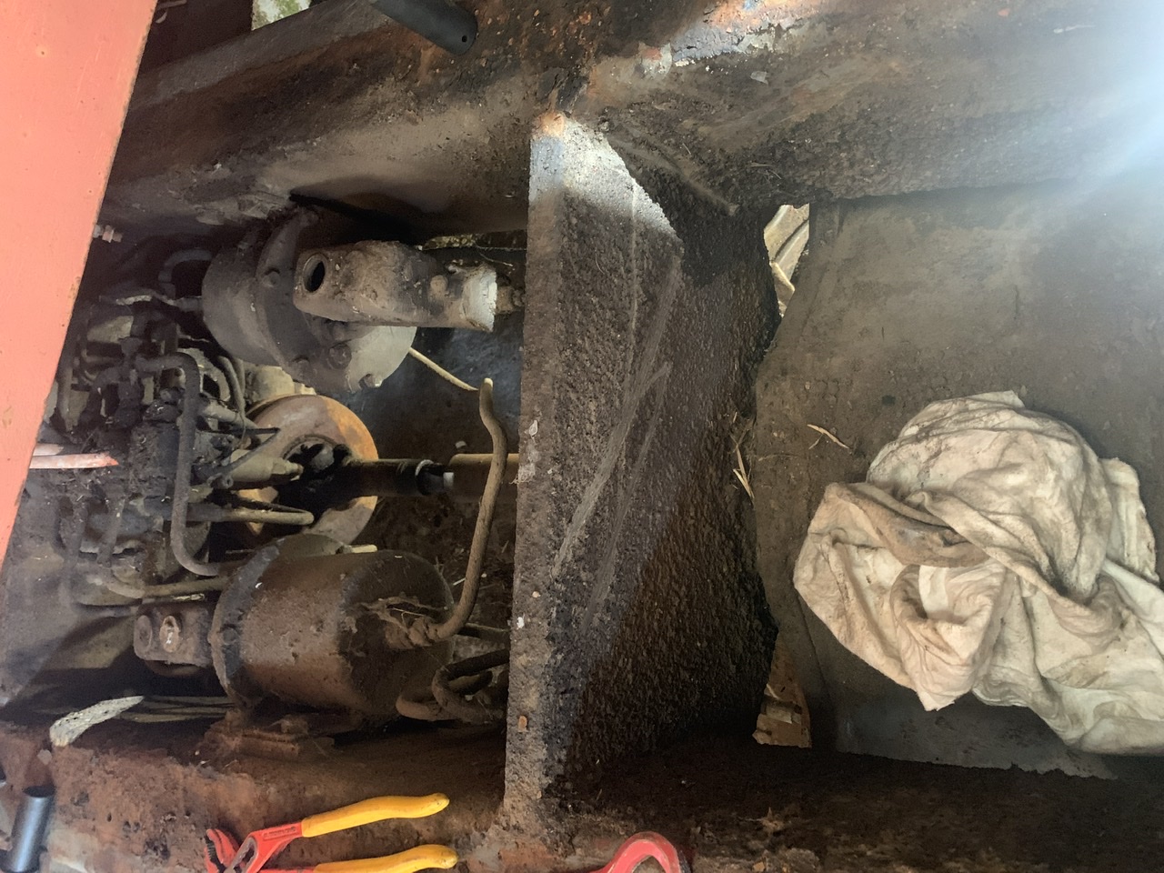 Ich will dort alles sauber machen, muss dann die Bremsflüssigkeit auffüllen um die Bremsen in Gang zu bringen. Dort unten ist noch ein Kasten an den drei Leitungen angeschlossen sind (eine zur Drehdurchführung, eine zum Handbremszylinder, die andere weiss ich noch nicht genau). Dieser Kasten ist auch undicht. Den will ich auch noch ausbauen um zu schauen ob ich den abgedichtet bekomme.