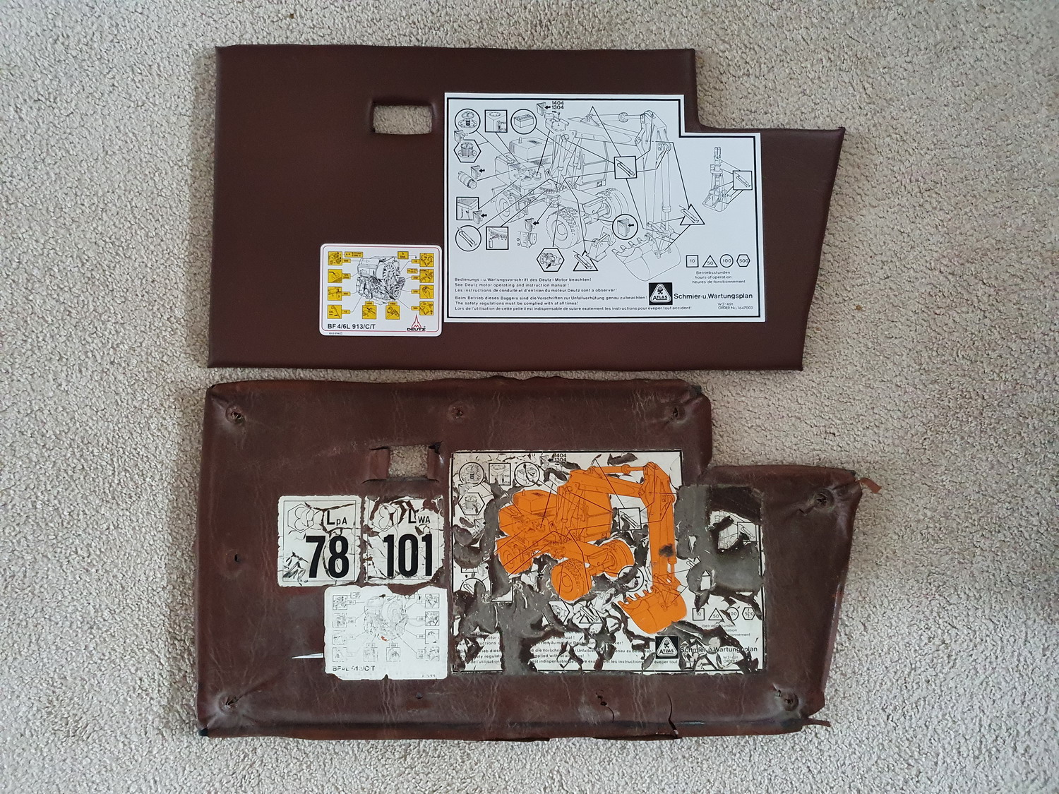 Jetzt muss ich noch irgendwie die Löcher gut in Kunstleder und Dämmmatte bekommen und dann wird das Teil wieder eingebaut. Weiß jemand zufällig welcher Aufkleber normalerweise links neben dem Motor-Wartungsplan klebt? Scheint, als wäre dort mal eine Aufkleber gewesen...