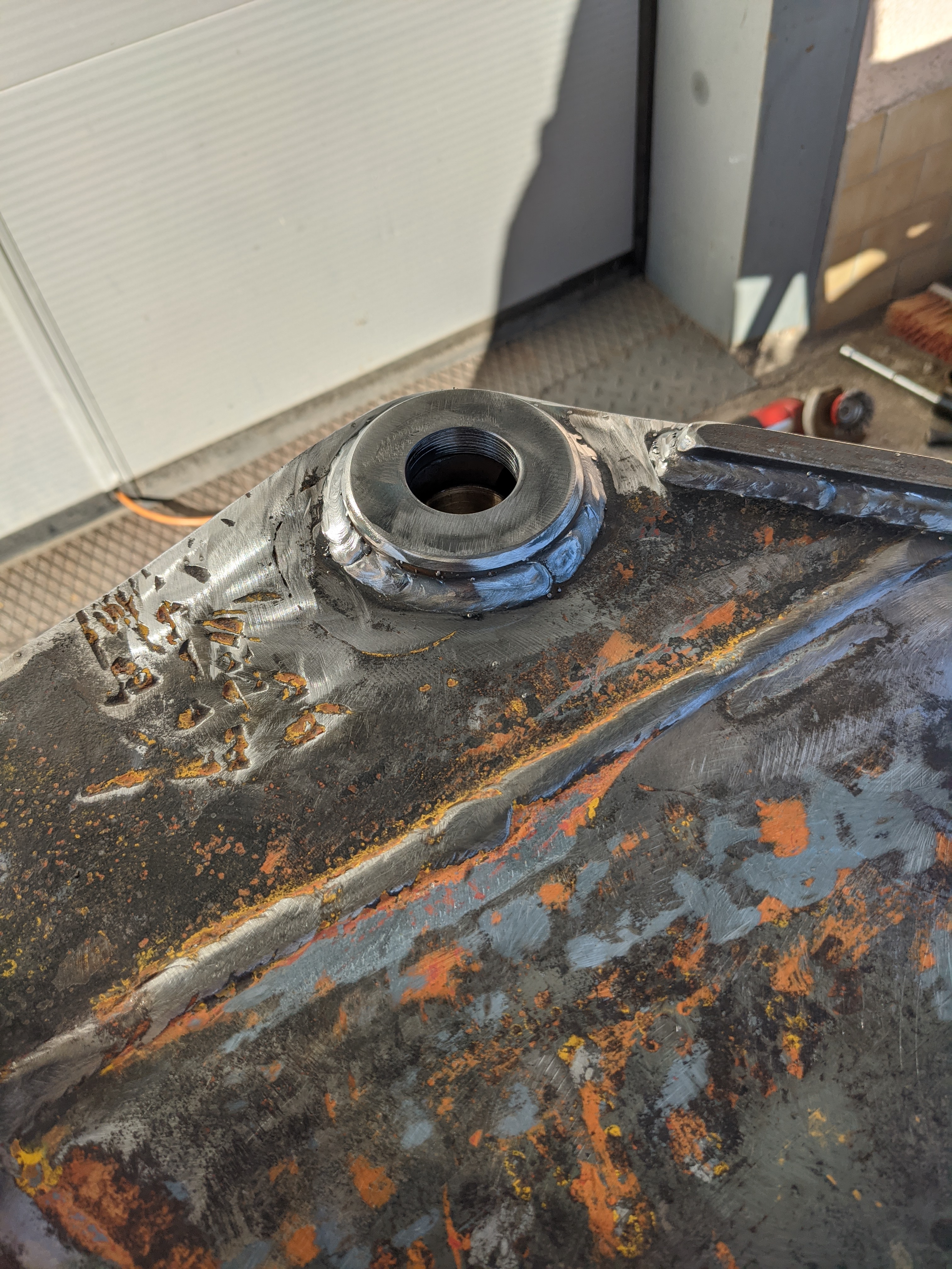 Nach dem entfernen von etwa 4 Schichten Farbe habe ich um die Blechstücke so gute es ging neue Schweißnähte gelegt und oben 4 neue Verstärkungen über die gerissenen stellen geschweißt.