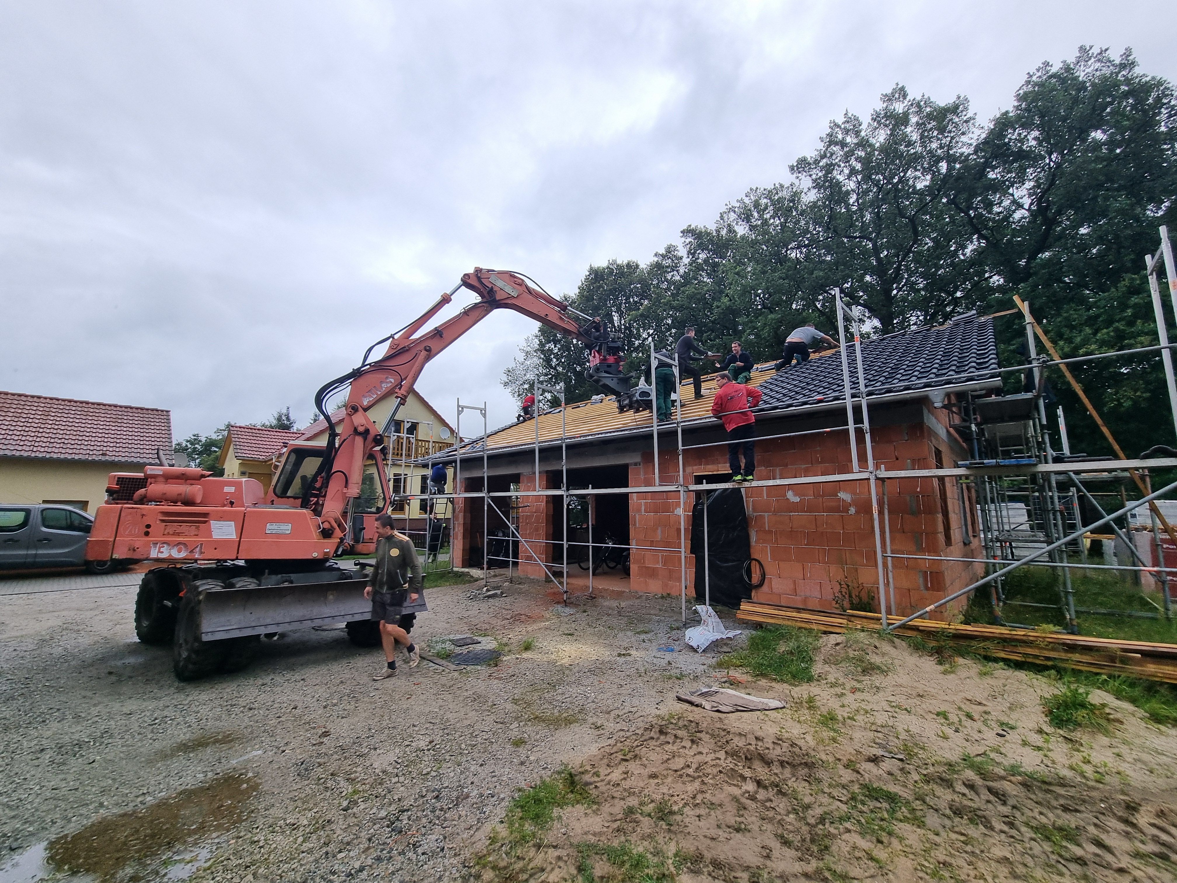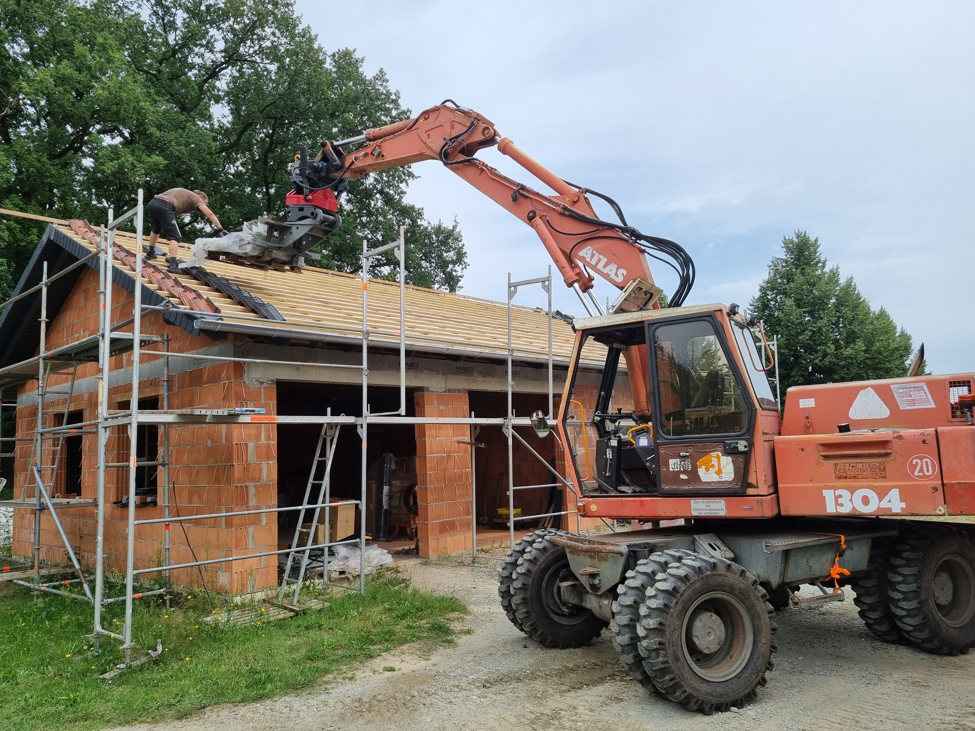 Unser treuer 1304 mit Tiltrotator und Palettengabel beim Dachdecken.