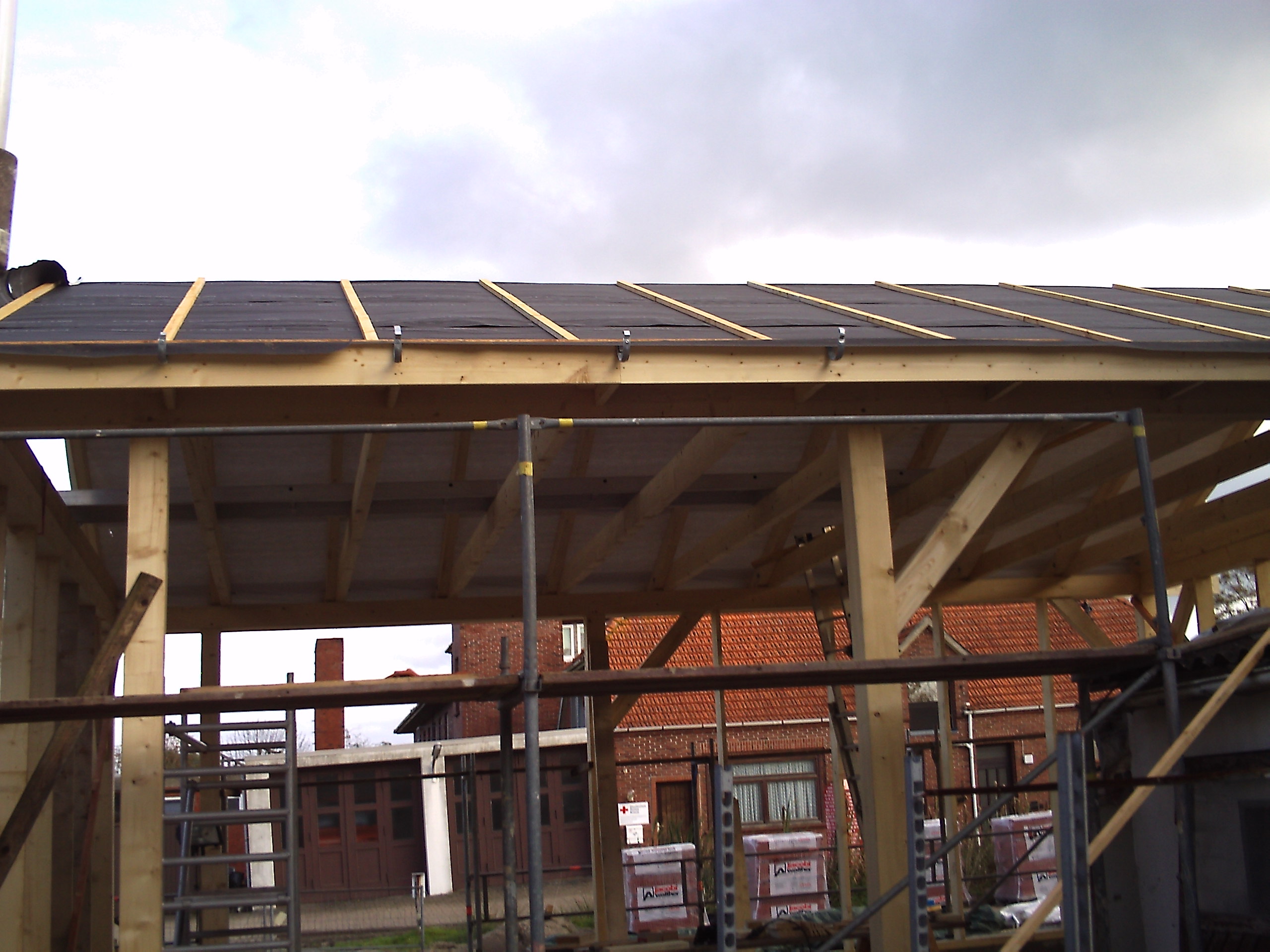 ringsrum eingerüstet - unterspannbahn aufs dach - dachüberstand festgelegt - gossenhaken angebracht und gestern die aufrechten bohlen für die isolierung gesetzt...