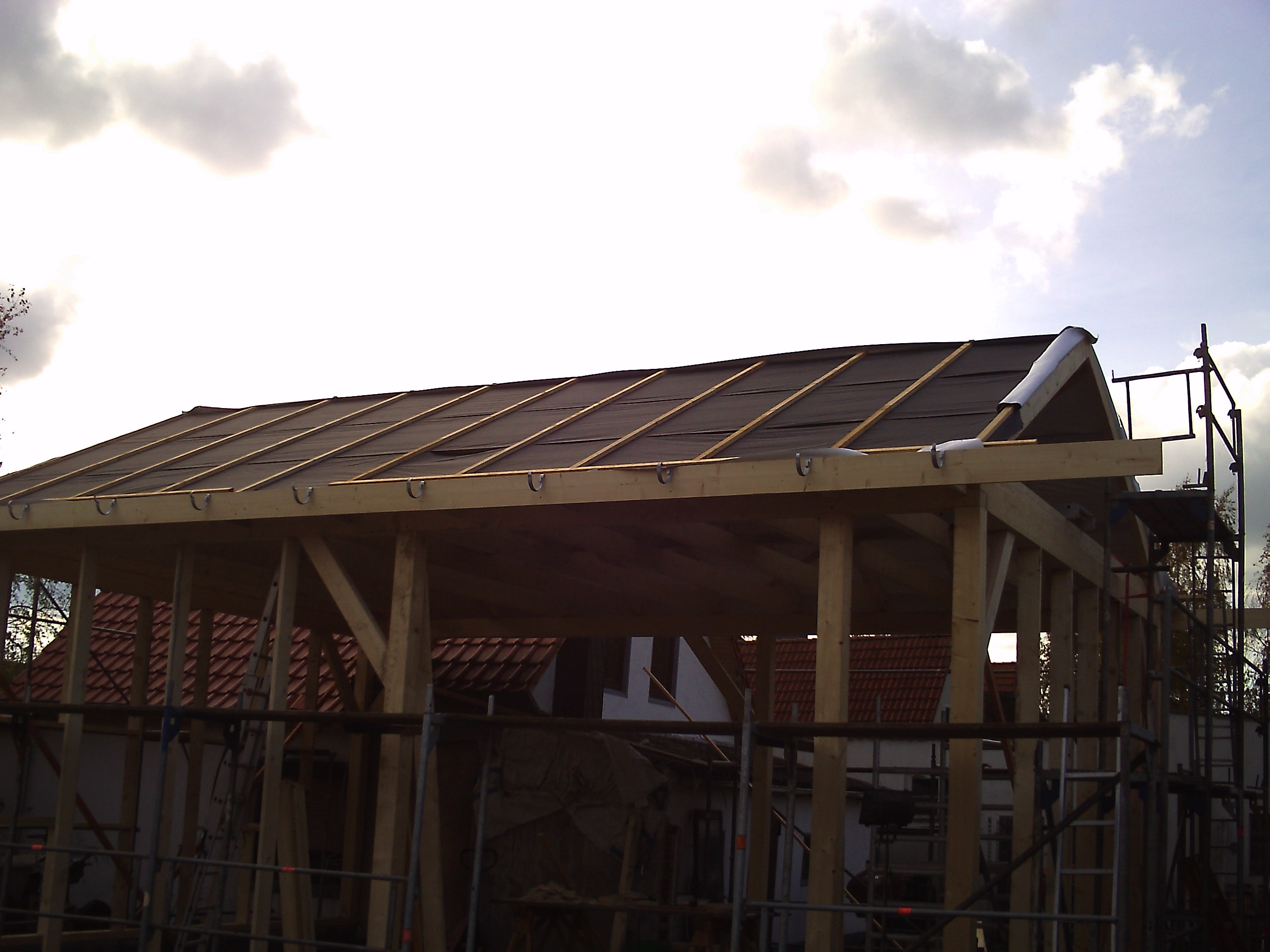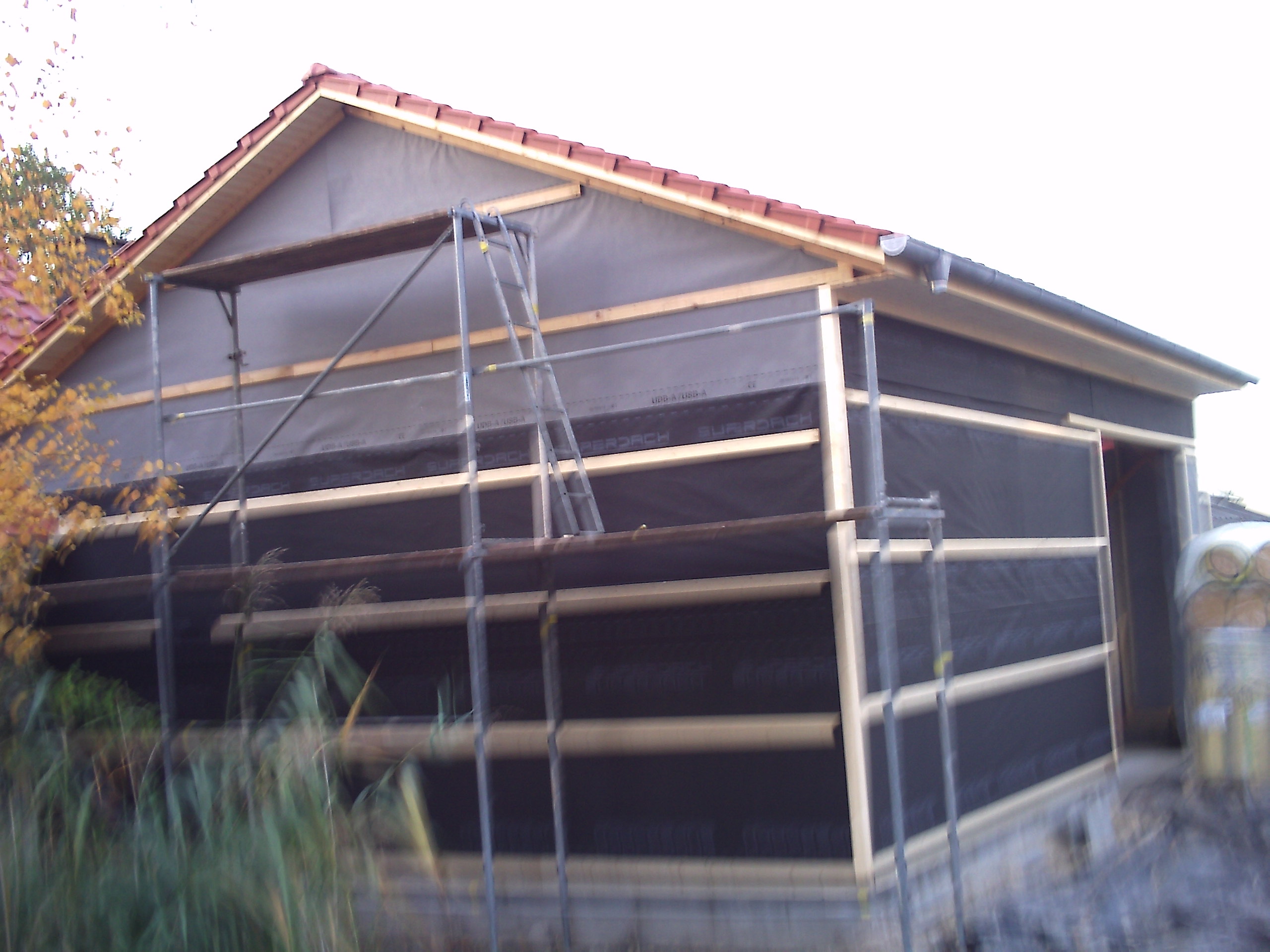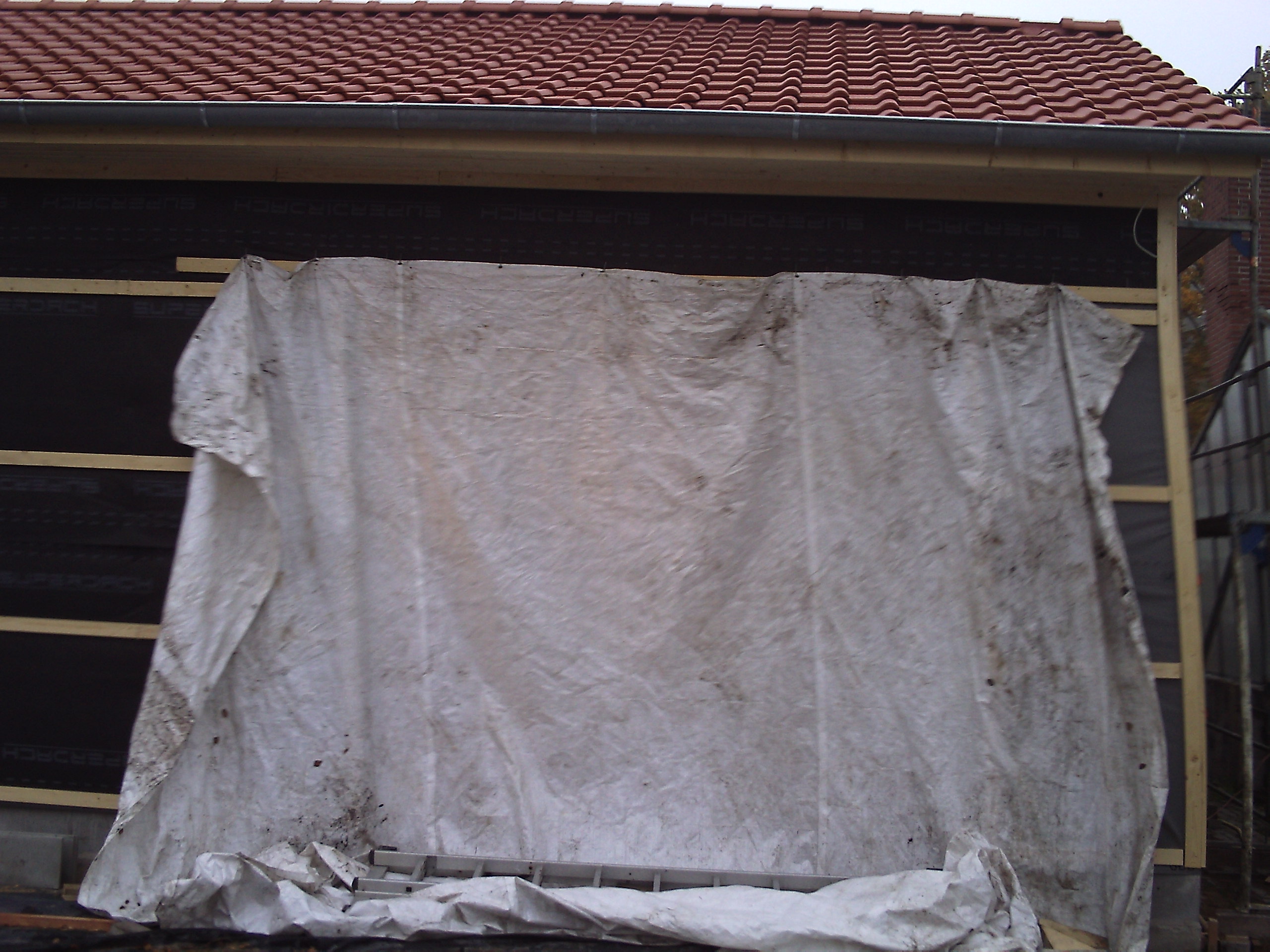 So ich denke es wird mal wieder zeit für ein update.. es ist ja einiges passiert. die pfannen wurden aufgelegt, dann war der christo da und hat den bau mit unterspannbahn verhüllt.. dachrinnen wurden angebracht dachüberstand ausgekleidet usw..