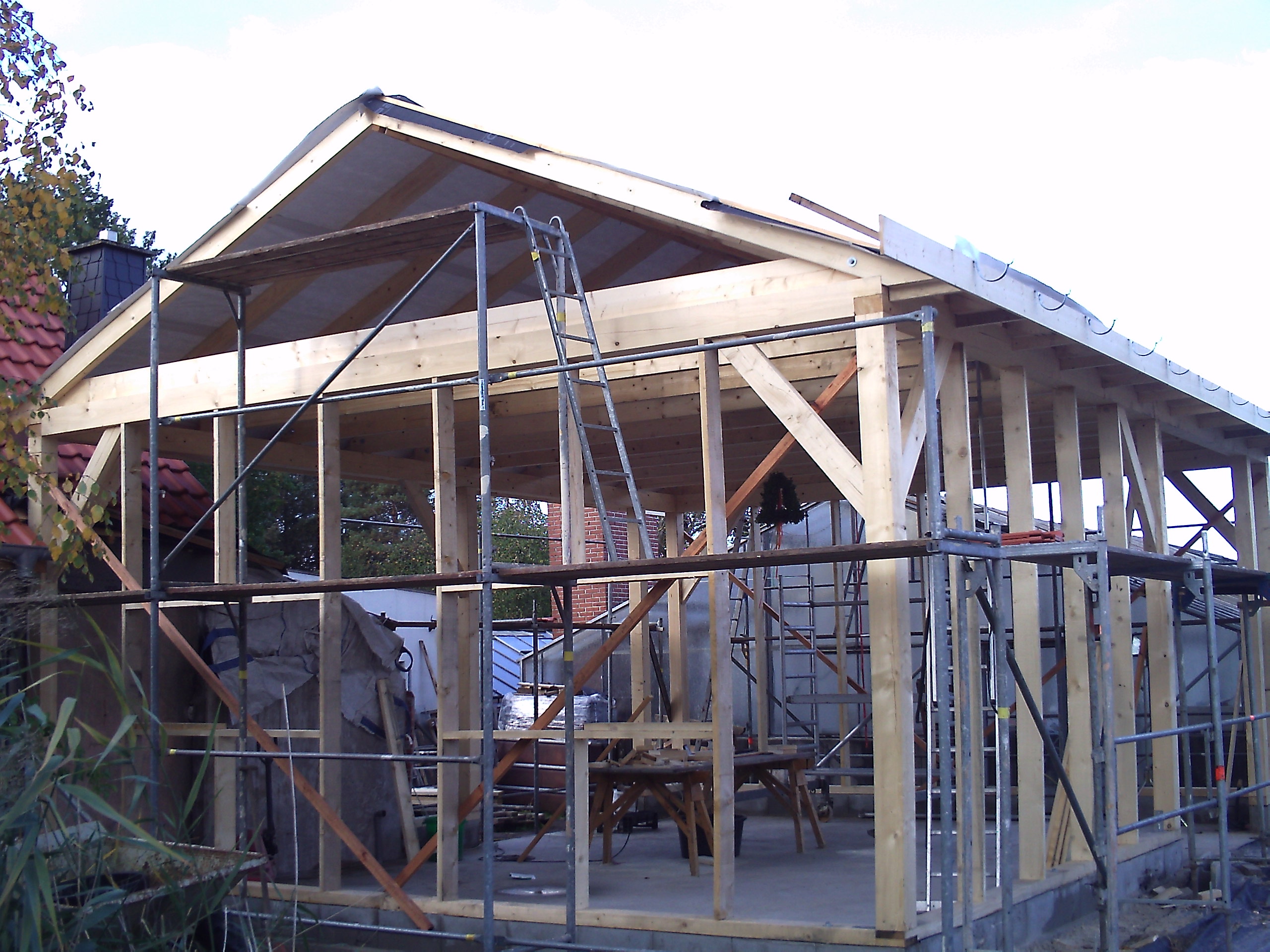 eigentlich sollte der bagger wieder das holz nach oben heben.. aber die zimmerleute haben selber aufgesteckt.. der baggerbesitzer hate gestern heftige magenschmerzen und wusste nicht so richtig wo vorn und hinten ist.. komm gerade vom doc.. bauchmuskel wohl gezerrt oder sowas.... schön wenn man am bauen ist und der doc sagt: nichts schweres heben - überanstrengungen vermeiden etc.. aber mein bester freund der ja der oberzimmermann ist hat mich nur kurz ausgelacht und dann zugepackt... ist ein macher..