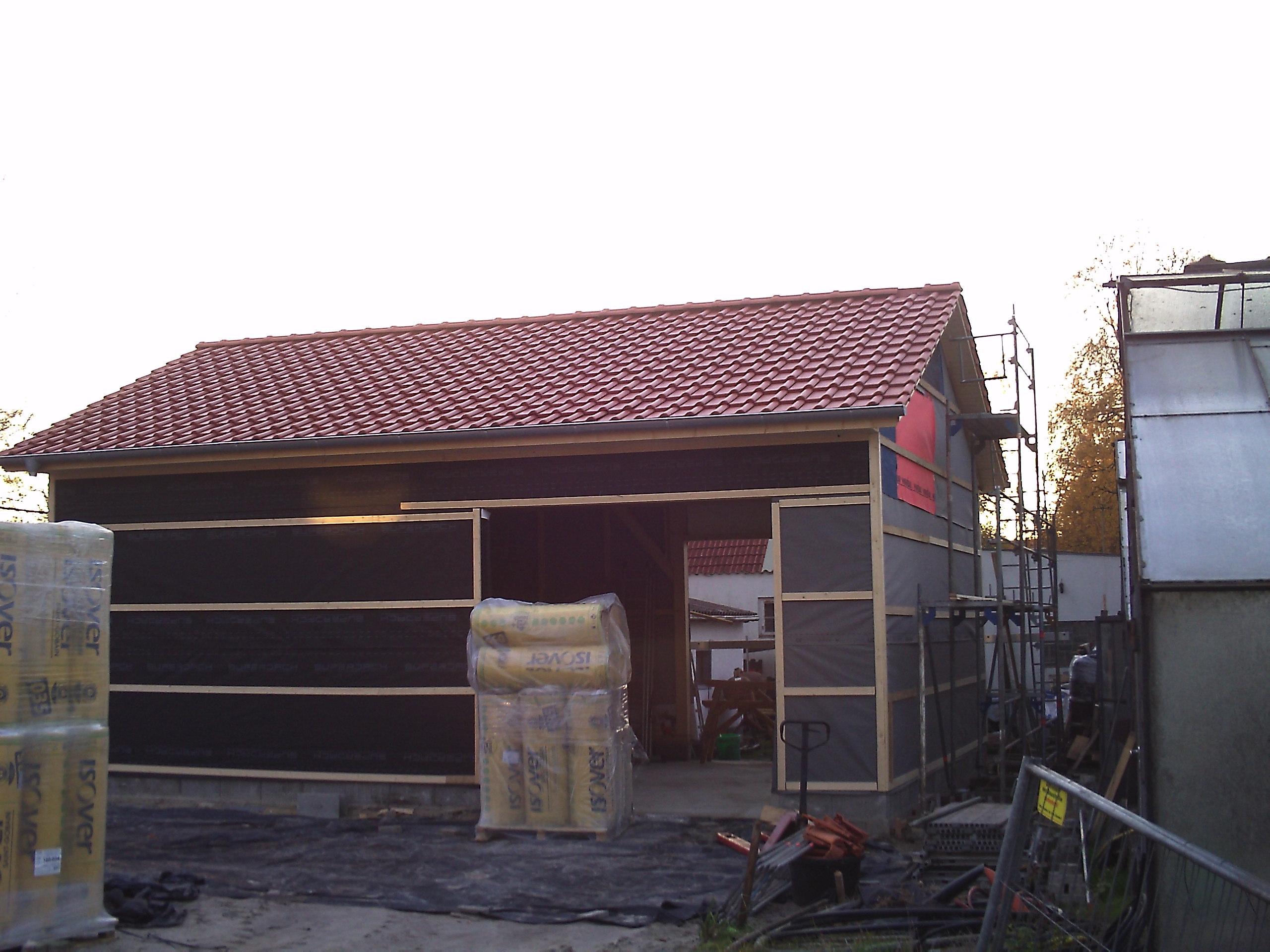 morgen sollen die dachlatten drauf und eventuell schon der anschluss ans hausdach gemacht werden.. blöd das es jetzt noch ne stunde eher dunkel wird.. 2 der grossen scheinwerfer sind am freitag hochgegangen.. einen haben wir jetzt noch.. diese röhren sind hier nicht zu bekommen, beim ebay bestellt aber dauert wohl bis die da sind
