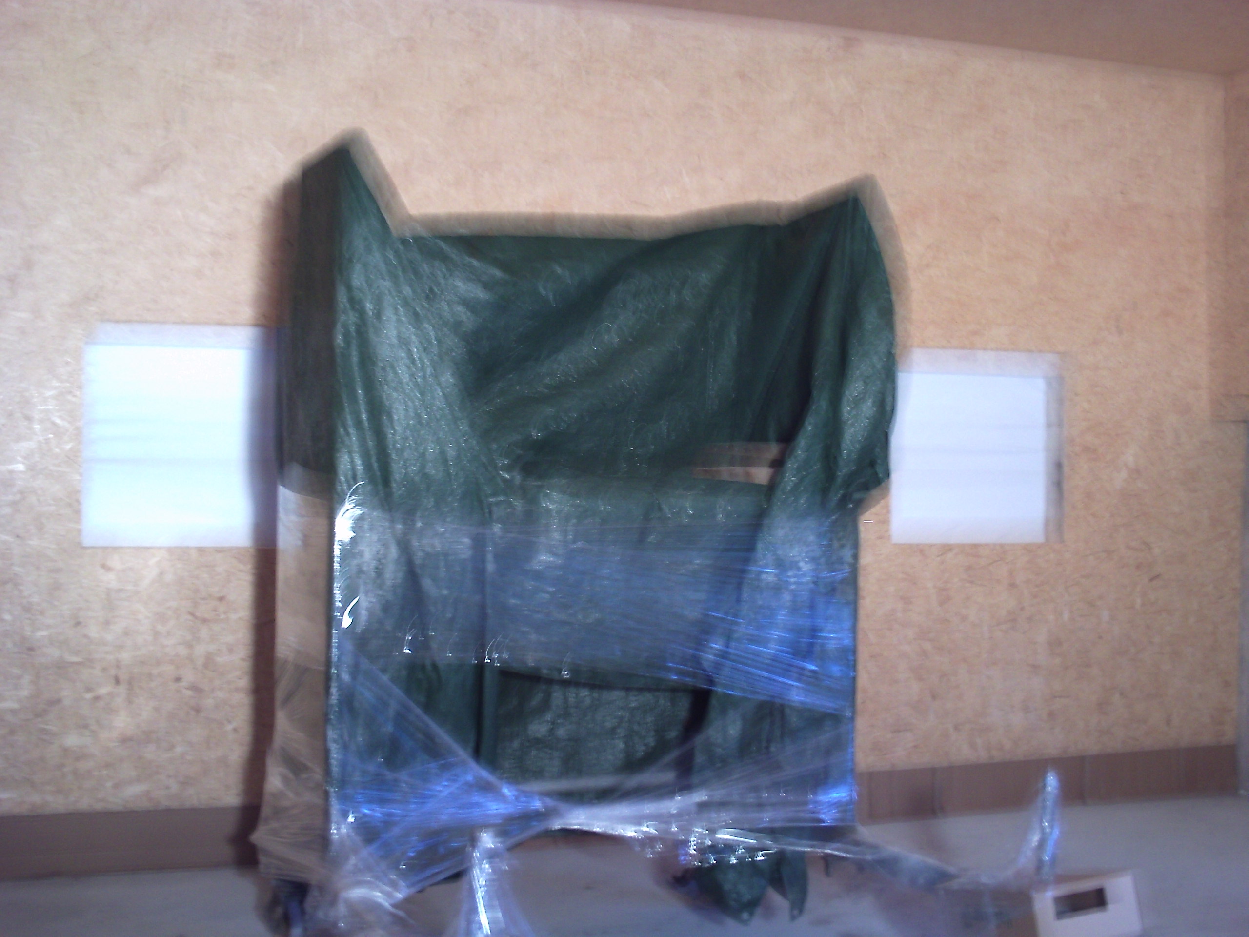 So nachdem nun alles so schön verkleidet war kam die frage, wie macht man nun die farbe an die wände und die zugegebenermassen recht hohe decke (3,80m)? überraschenderweise hat mein freund mir sein rollgerüst dagelassen.. aber damit das nicht voller farbspritzer ist nachher kam christo mal wieder vorbei.. und weil der gerade da war durfte der auch gleich eine toreinfahrt verhüllen das es nicht so zieht..