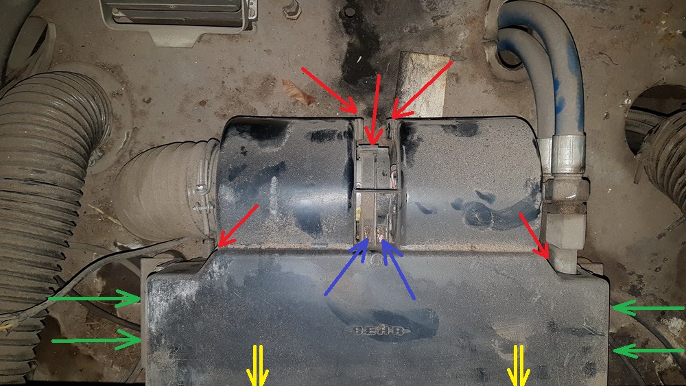 Heute hab ich die Heizung zerlegt weil sie bei mir doch immer die Sicherung raus haut. Nachdem der Kasten, der sich hinter dem Sitz befindet, rausgenommen war, wurde der Blick frei auf viiiiel Staub und Dreck. Ach ja - und die Heizung (Bild 1). Dann sind 5 Klammern zu lösen (rote Pfeile Bild 1) und 4 kleine Schrauben (gelbe Pfeile), um die vordere Blende abzunehmen. 2 Schrauben sind oben drauf, die anderen beiden genau gegenüberliegend auf der Unterseite. An die kommt man erst ran wenn man die ganze Heizung mittels 10er Schlüssel/Nuss die 4 Schrauben (grüne Pfeile) an der Seite herausgeschraubt hat. Dann nämlich kann man die ganze Heizung nach hinten wegziehen. Nun, dachte ich, hätte ich alles getan, um die obere Häfte des Heizungs-Chassis von der unteren zu trennen. Doch der Staub hatte zwei weitere Schrauben in der Mitte (blaue Pfeile) versteckt. 2,3 Mal kräftig in die Mitte blasen und - simsalabim - tauchen 2 weitere Kreuzschlitzschrauben auf. Nachdem diese entfernt wurden, konnte ich die obere Hälfte zur Seite legen und die Sicht auf das Gebläse samt Motor war frei. Dann noch die beiden Kabelschuhe abziehen und raus mit dem versifften Teil. Es war voll mit angeklebtem, alten Staub. In der Werkstatt habe ich die Ventilatoren erstmal grob mit Druckluft sauber gemacht (und wegen des vielen Staubes ordentlich gehustet) und anschließende mit Bremsenreiniger gereinigt. Beim Drehen mit der Hand ist mir kein Lagerschaden oder Spiel aufgefallen, also entschloss ich mich, den Motor mal laufen zu lassen, um festzustellen, ob sich vielleicht erst nach einer gewissen Dauer ein Problem mit dem Lager zeigt. Kann ja sein, dass es, wenn es warm wird, andere Eigenschaften zeigt.