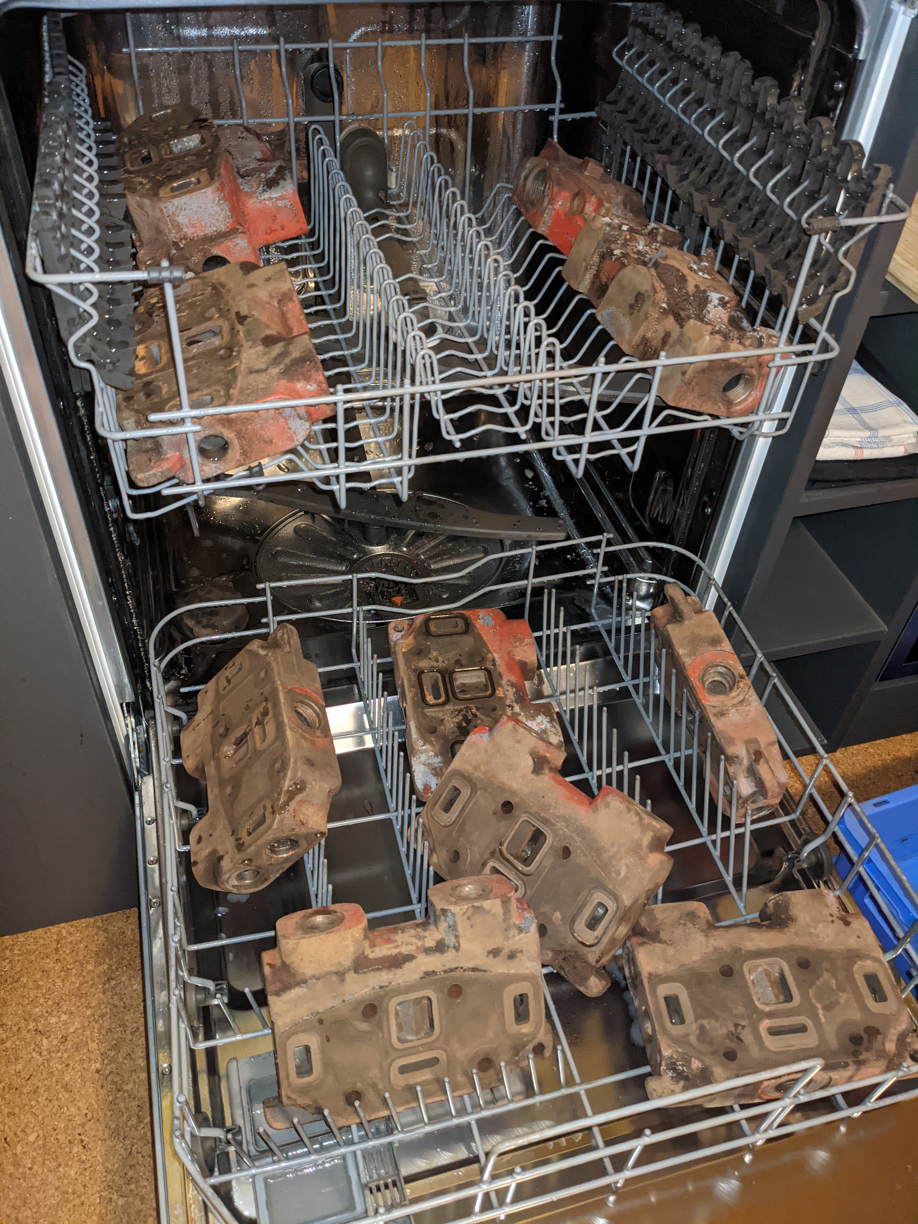 Die Ventilgehäuse hab ich bei 60C im Geschirrspüler gehabt. Hat Recht gut funktioniert, außen herum neu lackieren und die sehen aus wie neu.